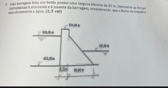 7. Uma barragem à montante feita em betão e à possui uma largura efectiva de 50 m. Determine seja obviamente a água. (2,5 val) hidrostáticas jusante da barragem, considerando que fluido de as trabalho forças 534,00 m 463,00m 8,0m