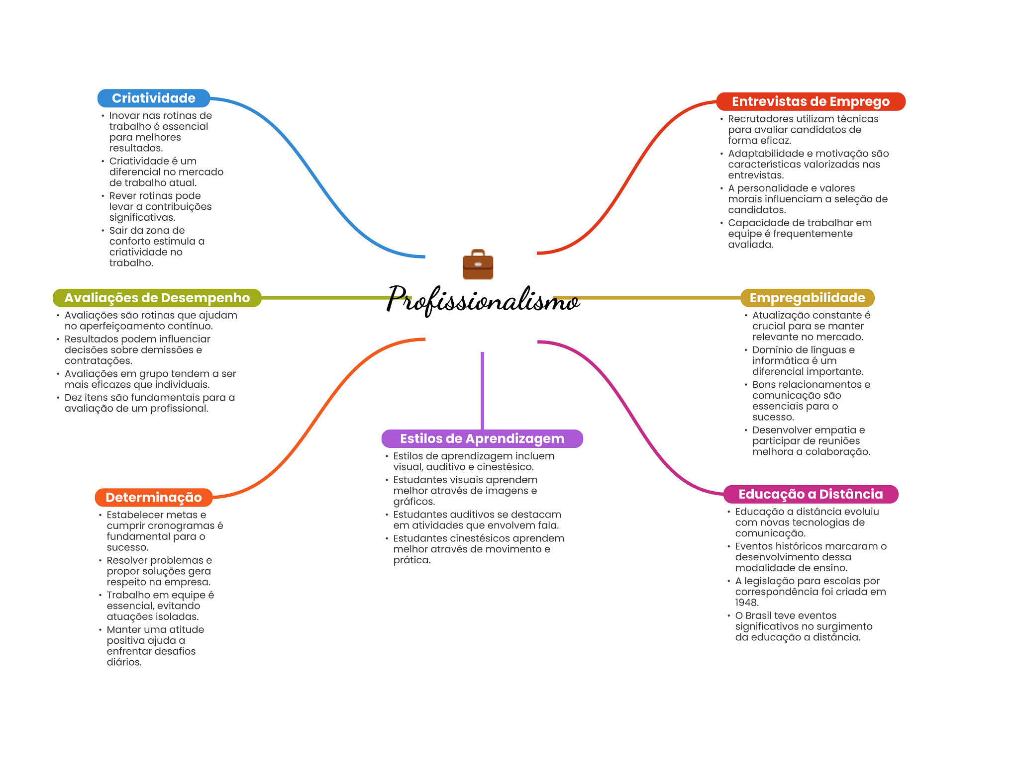 Criatividade Entrevistas de Emprego Inovar nas rotinas de Recrutadores utilizam técnicas trabalho é essencial para avaliar candidatos de para melhores forma eficaz. resultados. Adaptabilidade e motivação são Criatividade é um características valorizadas nas diferencial no mercado entrevistas. de trabalho atual. A personalidade e valores Rever rotinas pode morais influenciam a seleção de levar a contribuições candidatos. significativas. Capacidade de trabalhar em Sair da zona de equipe é frequentemente conforto estimula a avaliada. criatividade no trabalho. Avaliações de Desempenho Profissionalismo Empregabilidade Avaliações são rotinas que ajudam Atualização constante é no aperfeiçoamento contínuo. crucial para se manter Resultados podem influenciar relevante no mercado. decisões sobre demissões e Domínio de línguas e contratações. informática é um Avaliações em grupo tendem a ser diferencial importante. mais eficazes que individuais. Bons relacionamentos e Dez itens são fundamentais para a comunicação são avaliação de um profissional. essenciais para sucesso. Desenvolver empatia e Estilos de Aprendizagem participar de reuniões Estilos de aprendizagem incluem melhora a colaboração. visual, auditivo e cinestésico. Estudantes visuais aprendem melhor através de imagens e Determinação Educação a Distância gráficos. Estabelecer metas e Estudantes auditivos se destacam Educação a distância evoluiu cumprir cronogramas é em atividades que envolvem fala. com novas tecnologias de fundamental para Estudantes cinestésicos aprendem comunicação. sucesso. melhor através de movimento e Eventos históricos marcaram O Resolver problemas e prática. desenvolvimento dessa propor soluções gera modalidade de ensino. respeito na empresa. A legislação para escolas por Trabalho em equipe é correspondência foi criada em essencial, evitando 1948. atuações isoladas. Brasil teve eventos Manter uma atitude significativos no surgimento positiva ajuda a da educação a distância. enfrentar desafios diários.