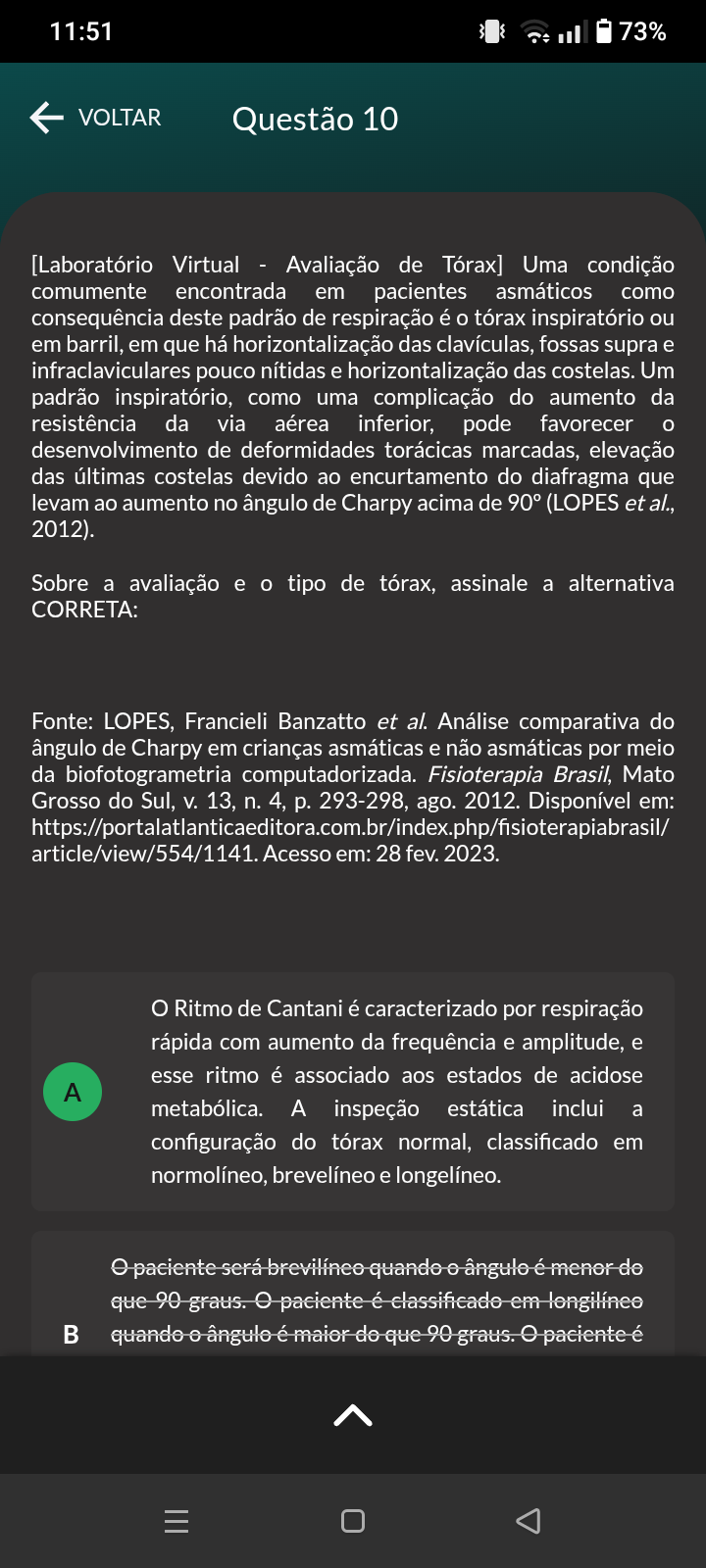 11:51 73% VOLTAR Questão 10 [Laboratório Virtual Avaliação de Tórax] Uma condição comumente encontrada em pacientes asmáticos como consequência deste padrão de respiração é tórax inspiratório ou em barril, em que há horizontalização das clavículas, fossas supra e infraclaviculares pouco nítidas e horizontalização das costelas. Um padrão inspiratório, como uma complicação do aumento da resistência da via aérea inferior, pode favorecer desenvolvimento de deformidades torácicas marcadas, elevação das últimas costelas devido ao encurtamento do diafragma que levam ao aumento no ângulo de Charpy acima de 90° (LOPES et al., 2012). Sobre a avaliação e tipo de tórax, assinale a alternativa CORRETA: Fonte: LOPES, Francieli Banzatto et al. Análise comparativa do ângulo de Charpy em crianças asmáticas e não asmáticas por meio da biofotogrametria computadorizada. Fisioterapia Brasil, Mato Grosso do Sul, V. 13, n. 4, 293-298, ago. 2012. Disponível em: https://portalatlanticaeditora.com.br/index.php/fisioterapiabrasil/ article/view/554/1141. Acesso em: 28 fev. 2023. Ritmo de Cantani é caracterizado por respiração rápida com aumento da frequência e amplitude, e esse ritmo é associado aos estados de acidose A metabólica. A inspeção estática inclui a configuração do tórax normal, classificado em normolíneo, brevelíneo e longelíneo. paciente será brevilíneo quando ângulo é menor do que 90 graus. paciente é classificado em longilíneo quando ângulo é maior do que 90 graus. paciente é