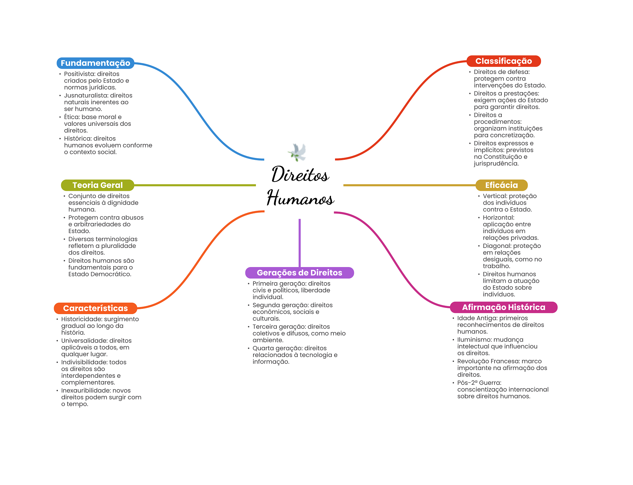 Fundamentação Classificação Positivista: direitos Direitos de defesa: criados pelo Estado e protegem contra normas jurídicas. intervenções do Estado. Jusnaturalista: direitos Direitos a prestações: naturais inerentes ao exigem ações do Estado ser humano. para garantir direitos. Ética: base moral e Direitos a valores universais dos procedimentos: direitos. organizam instituições Histórica: direitos para concretização. humanos evoluem conforme Direitos expressos e contexto social. implícitos: previstos na Constituição e jurisprudência. Direitos Teoria Geral Eficácia Conjunto de direitos Humanos Vertical: proteção essenciais à dignidade dos indivíduos humana. contra Estado. Protegem contra abusos Horizontal: e arbitrariedades do aplicação entre Estado. indivíduos em Diversas terminologias relações privadas. refletem a pluralidade Diagonal: proteção dos direitos. em relações Direitos humanos são desiguais, como no fundamentais para trabalho. Estado Democrático. Gerações de Direitos Direitos humanos Primeira geração: direitos limitam a atuação civis e políticos, liberdade do Estado sobre individual. indivíduos. Características Segunda geração: direitos econômicos, sociais e Afirmação Histórica Historicidade: surgimento culturais. Idade Antiga: primeiros gradual ao longo da Terceira geração: direitos reconhecimentos de direitos história. coletivos e difusos, como meio humanos. Universalidade: direitos ambiente. mudança aplicáveis a todos, em Quarta geração: direitos intelectual que influenciou qualquer lugar. relacionados à tecnologia e direitos. Indivisibilidade: todos informação. Revolução Francesa: marco OS direitos são importante na afirmação dos interdependentes e direitos. complementares. Guerra: Inexauribilidade: novos conscientização internacional direitos podem surgir com sobre direitos humanos. tempo.