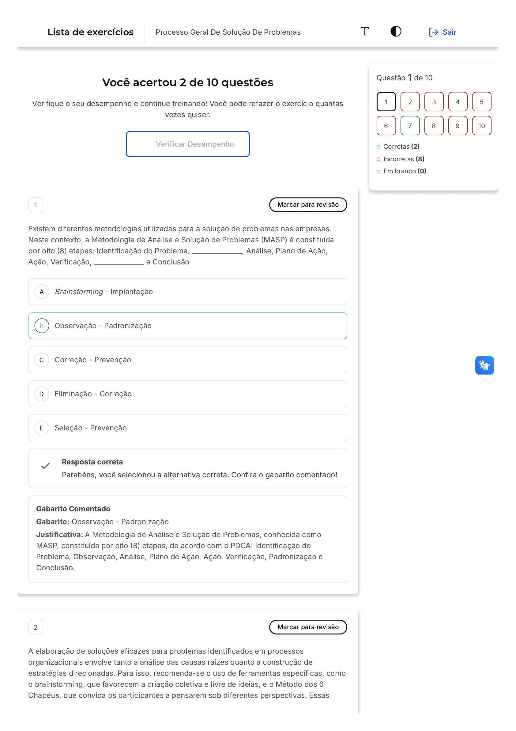 Você acertou 2 de 10 questões Verifique o seu desempenho e continue treinando! Você pode refazer o exercício quantas vezes quiser. Verificar Desempenho A B C D E 1 Marcar para revisão Existem diferentes metodologias utilizadas para a solução de problemas nas empresas. Neste contexto, a Metodologia de Análise e Solução de Problemas (MASP) é constituída por oito (8) etapas: Identificação do Problema, _______________, Análise, Plano de Ação, Ação, Verificação, _______________ e Conclusão Brainstorming - Implantação Observação - Padronização Correção - Prevenção Eliminação - Correção Seleção - Prevenção Resposta correta Parabéns, você selecionou a alternativa correta. Confira o gabarito comentado! Gabarito Comentado Gabarito: Observação - Padronização Justificativa: A Metodologia de Análise e Solução de Problemas, conhecida como MASP, constituída por oito (8) etapas, de acordo com o PDCA: Identificação do Problema, Observação, Análise, Plano de Ação, Ação, Verificação, Padronização e Conclusão. 2 Marcar para revisão A elaboração de soluções eficazes para problemas identificados em processos organizacionais envolve tanto a análise das causas raízes quanto a construção de estratégias direcionadas. Para isso, recomenda-se o uso de ferramentas específicas, como o brainstorming, que favorecem a criação coletiva e livre de ideias, e o Método dos 6 Chapéus, que convida os participantes a pensarem sob diferentes perspectivas. Essas Questão 1 de 10 Corretas (2) Incorretas (8) Em branco (0) 1 2 3 4 5 6 7 8 9 10 Lista de exercícios Processo Geral De Solução De Problemas Sair A B C D E A B abordagens possibilitam o surgimento de soluções variadas e abrangentes, adaptadas às particularidades do problema enfrentado. Após a geração dessas alternativas, é fundamental utilizar técnicas de priorização para selecionar aquelas com maior potencial de impacto. Uma das ferramentas indicadas é a Matriz BASICO, que considera diferentes perspectivas como impacto organizacional, facilidade de execução e custo, entre outras. A adoção desse instrumento contribui para que ____ identificada seja transformada em um plano eficaz de execução, garantindo que ____ dos recursos seja feita de maneira consciente e estratégica. Esse processo culmina na elaboração de ____ detalhado, que orienta as ações futuras. Assinale a alternativa que contém a sequência correta para preencher as lacunas acima: a causa - a análise – o documento a solução - a alocação – o plano de ação a hipótese - o uso – o relatório a estratégia - a aplicação – o planejamento a ideia - a distribuição – o modelo Resposta incorreta Opa! A alternativa correta é a letra B. Confira o gabarito comentado! Gabarito Comentado A solução escolhida precisa ser transformada em um plano estruturado; a alocação correta dos recursos assegura a viabilidade da implementação; e o plano de ação formaliza os passos a serem seguidos para alcançar os objetivos traçados. 3 Marcar para revisão Uma equipe multidisciplinar é convocada para analisar um problema persistente de falha na entrega de pedidos em uma empresa de e-commerce. Durante a reunião, gestores tendem a atribuir o erro exclusivamente ao setor de logística, sem considerar dados e evidências documentadas de outros setores envolvidos. Considerando o texto, analise as afirmativas abaixo: I. A formação de equipes multidisciplinares é essencial para promover uma visão abrangente e evitar julgamentos baseados em percepções individuais. II. A documentação dos eventos relevantes e das fontes de evidência contribui para uma investigação mais objetiva e eficaz. III. A responsabilização direta de um setor facilita a identificação de falhas e agiliza a aplicação de medidas corretivas, mesmo que sem análise completa. Assinale a opção que apresenta somente as alternativas corretas: I, II II, III C D E A B C D E I, III I, II, III II Resposta incorreta Opa! A alternativa correta é a letra A. Confira o gabarito comentado! Gabarito Comentado A afirmativa I está correta, conforme a importância da equipe multidisciplinar destacada no módulo A afirmativa II também está correta, pois a coleta e documentação de dados são fundamentais para a investigação eficiente. A afirmativa III está incorreta porque o objetivo da investigação é descobrir causas, não culpados. 4 Marcar para revisão Sobre ferramentas para a análise das causas raízes, analise as afirmativas a seguir: I - A análise de causa raiz consiste na investigação do problema e identificação da(s) sua(s) causa(s) diretas. II - As causas raízes são caracterizadas como aquelas que, se não tivessem ocorrido, o problema não existiria, ou seja, somente através de sua eliminação os problemas não voltam a ocorrer. III - Um dos grandes problemas da não identificação das causas raízes de um determinado problema deve-se ao fato de que apenas a causa direta do problema é solucionada. Está correto o que se afirma em: I, II e III II e III I e II I e III I, somente Resposta incorreta Opa! A alternativa correta é a letra B. Confira o gabarito comentado! Gabarito Comentado Gabarito: II e III Justificativa: A análise de causa raiz não se limita à identificação das causas diretas de um problema, como afirmado na alternativa I. Ela vai além, buscando entender as A B C D E causas raízes, ou seja, as causas fundamentais que, se não tivessem ocorrido, o problema não existiria. Portanto, a alternativa I está incorreta. As alternativas II e III estão corretas. A alternativa II define corretamente o que são causas raízes e a alternativa III destaca a importância de identificar essas causas raízes para a solução efetiva de um problema. 5 Marcar para revisão Uma empresa de tecnologia decide realizar a priorização de seus principais problemas operacionais usando ferramentas distintas. Um analista 
