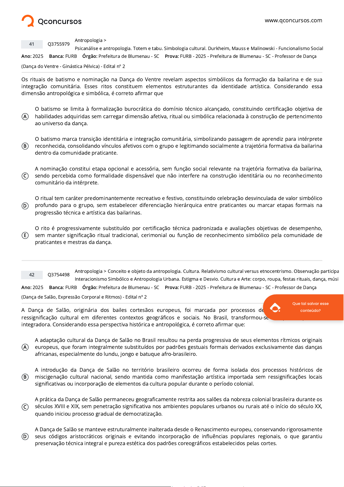 www.qconcursos.com Ano: 2025 Banca: FURB Órgão: Prefeitura de Blumenau - SC Os rituais de batismo e nominação na Dança do Ventre revelam aspectos simbólicos da formação da bailarina e de sua integração comunitária. Esses ritos constituem elementos estruturantes da identidade artística. Considerando essa dimensão antropológica e simbólica, é correto afirmar que A O batismo se limita à formalização burocrática do domínio técnico alcançado, constituindo certificação objetiva de habilidades adquiridas sem carregar dimensão afetiva, ritual ou simbólica relacionada à construção de pertencimento ao universo da dança. B O batismo marca transição identitária e integração comunitária, simbolizando passagem de aprendiz para intérprete reconhecida, consolidando vínculos afetivos com o grupo e legitimando socialmente a trajetória formativa da bailarina dentro da comunidade praticante. C A nominação constitui etapa opcional e acessória, sem função social relevante na trajetória formativa da bailarina, sendo percebida como formalidade dispensável que não interfere na construção identitária ou no reconhecimento comunitário da intérprete. D O ritual tem caráter predominantemente recreativo e festivo, constituindo celebração desvinculada de valor simbólico profundo para o grupo, sem estabelecer diferenciação hierárquica entre praticantes ou marcar etapas formais na progressão técnica e artística das bailarinas. E O rito é progressivamente substituído por certificação técnica padronizada e avaliações objetivas de desempenho, sem manter significação ritual tradicional, cerimonial ou função de reconhecimento simbólico pela comunidade de praticantes e mestras da dança. Ano: 2025 Banca: FURB Órgão: Prefeitura de Blumenau - SC A Dança de Salão, originária dos bailes cortesãos europeus, foi marcada por processos de difusão, adaptação e ressignificação cultural em diferentes contextos geográficos e sociais. No Brasil, transformou-se em prática plural e integradora. Considerando essa perspectiva histórica e antropológica, é correto afirmar que: A A adaptação cultural da Dança de Salão no Brasil resultou na perda progressiva de seus elementos rítmicos originais europeus, que foram integralmente substituídos por padrões gestuais formais derivados exclusivamente das danças africanas, especialmente do lundu, jongo e batuque afro-brasileiro. B A introdução da Dança de Salão no território brasileiro ocorreu de forma isolada dos processos históricos de miscigenação cultural nacional, sendo mantida como manifestação artística importada sem ressignificações locais significativas ou incorporação de elementos da cultura popular durante o período colonial. C A prática da Dança de Salão permaneceu geograficamente restrita aos salões da nobreza colonial brasileira durante os séculos XVIII e XIX, sem penetração significativa nos ambientes populares urbanos ou rurais até o início do século XX, quando iniciou processo gradual de democratização. D A Dança de Salão se manteve estruturalmente inalterada desde o Renascimento europeu, conservando rigorosamente seus códigos aristocráticos originais e evitando incorporação de influências populares regionais, o que garantiu preservação técnica integral e pureza estética dos padrões coreográficos estabelecidos pelas cortes. 41 Q3755979 >Antropologia Psicanálise e antropologia. Totem e tabu. Simbologia cultural. Durkheim, Mauss e Malinowski - Funcionalismo Social Prova: FURB - 2025 - Prefeitura de Blumenau - SC - Professor de Dança (Dança do Ventre - Ginástica Pélvica) - Edital nº 2 42 Q3754498 >Antropologia Conceito e objeto da antropologia. Cultura. Relativismo cultural versus etnocentrismo. Observação participa Interacionismo Simbólico e Antropologia Urbana. Estigma e Desvio. Cultura e Arte: corpo, roupa, festas rituais, dança, músi Prova: FURB - 2025 - Prefeitura de Blumenau - SC - Professor de Dança (Dança de Salão, Expressão Corporal e Ritmos) - Edital nº 2 Que tal salvar esse conteúdo? https://www.qconcursos.com/ https://www.qconcursos.com/questoes-de-concursos/bancas/furb https://www.qconcursos.com/questoes-de-concursos/institutos/prefeitura-de-blumenau-sc https://www.qconcursos.com/questoes-de-concursos/bancas/furb https://www.qconcursos.com/questoes-de-concursos/institutos/prefeitura-de-blumenau-sc https://www.qconcursos.com/questoes-de-concursos/questoes/40043754-d0 https://www.qconcursos.com/questoes-de-concursos/disciplinas/ciencias-sociais-antropologia https://www.qconcursos.com/questoes-de-concursos/disciplinas/ciencias-sociais-antropologia/psicanalise-e-antropologia-totem-e-tabu-simbologia-cultural-durkheim-mauss-e-malinowski-funcionalismo-social https://www.qconcursos.com/questoes-de-concursos/provas/furb-2025-prefeitura-de-blumenau-sc-professor-de-danca-danca-do-ventre-ginastica-pelvica-edital-n-2 https://www.qconcursos.com/questoes-de-concursos/provas/furb-2025-prefeitura-de-blumenau-sc-professor-de-danca-danca-do-ventre-ginastica-pelvica-edital-n-2 https://www.qconcursos.com/questoes-de-concursos/questoes/04c6e4d7-d0 https://www.qconcursos.com/questoes-de-concursos/disciplinas/ciencias-sociais-antropologia https://www.qconcursos.com/questoes-de-concursos/disciplinas/ciencias-sociais-antropologia/conceito-e-objeto-da-antropologia-cultura-relativismo-cultural-versus-etnocentrismo-observacao-participante-e-tecnica https://www.qconcursos.com/questoes-de-concursos/disciplinas/ciencias-sociais-antropologia/interacionismo-simbolico-e-antropologia-urbana-estigma-e-desvio-cultura-e-arte-corpo-roupa-festas-rituais-danca-musica-gastronomia-literatura-antropologia-e-cultura-no-brasil https://www.qconcursos.com/questoes-de-concursos/provas/furb-2025-prefeitura-de-blumenau-sc-professor-de-danca-danca-de-salao-expressao-corporal-e-ritmos-edital-n-2 https://www.qconcursos.com/questoes-de-concursos/provas/furb-2025-prefeitura-de-blu