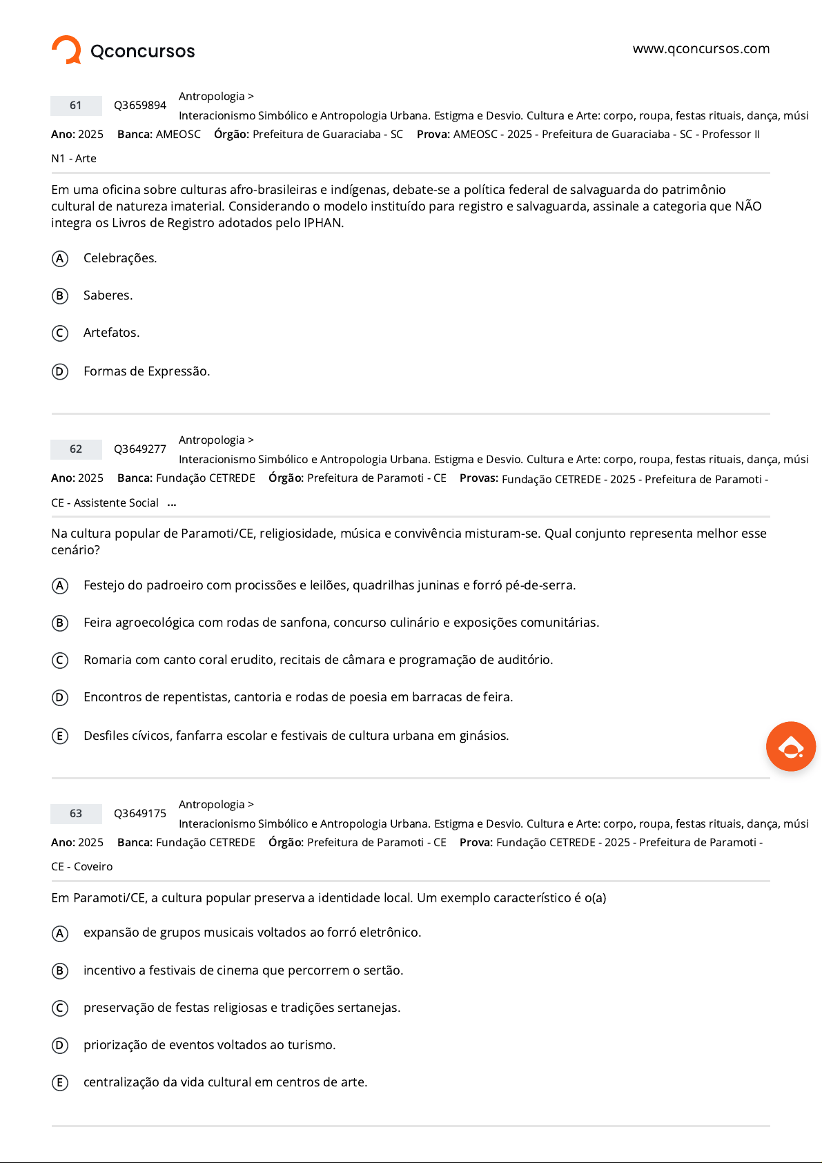 www.qconcursos.com Ano: 2025 Banca: AMEOSC Órgão: Prefeitura de Guaraciaba - SC Em uma oficina sobre culturas afro-brasileiras e indígenas, debate-se a política federal de salvaguarda do patrimônio cultural de natureza imaterial. Considerando o modelo instituído para registro e salvaguarda, assinale a categoria que NÃO integra os Livros de Registro adotados pelo IPHAN. A Celebrações. B Saberes. C Artefatos. D Formas de Expressão. Ano: 2025 Banca: Fundação CETREDE Órgão: Prefeitura de Paramoti - CE Na cultura popular de Paramoti/CE, religiosidade, música e convivência misturam-se. Qual conjunto representa melhor esse cenário? A Festejo do padroeiro com procissões e leilões, quadrilhas juninas e forró pé-de-serra. B Feira agroecológica com rodas de sanfona, concurso culinário e exposições comunitárias. C Romaria com canto coral erudito, recitais de câmara e programação de auditório. D Encontros de repentistas, cantoria e rodas de poesia em barracas de feira. E Desfiles cívicos, fanfarra escolar e festivais de cultura urbana em ginásios. Ano: 2025 Banca: Fundação CETREDE Órgão: Prefeitura de Paramoti - CE Em Paramoti/CE, a cultura popular preserva a identidade local. Um exemplo característico é o(a) A expansão de grupos musicais voltados ao forró eletrônico. B incentivo a festivais de cinema que percorrem o sertão. C preservação de festas religiosas e tradições sertanejas. D priorização de eventos voltados ao turismo. E centralização da vida cultural em centros de arte. 61 Q3659894 >Antropologia Interacionismo Simbólico e Antropologia Urbana. Estigma e Desvio. Cultura e Arte: corpo, roupa, festas rituais, dança, músi Prova: AMEOSC - 2025 - Prefeitura de Guaraciaba - SC - Professor II N1 - Arte 62 Q3649277 >Antropologia Interacionismo Simbólico e Antropologia Urbana. Estigma e Desvio. Cultura e Arte: corpo, roupa, festas rituais, dança, músi Provas: Fundação CETREDE - 2025 - Prefeitura de Paramoti - CE - Assistente Social ... 63 Q3649175 >Antropologia Interacionismo Simbólico e Antropologia Urbana. Estigma e Desvio. Cultura e Arte: corpo, roupa, festas rituais, dança, músi Prova: Fundação CETREDE - 2025 - Prefeitura de Paramoti - CE - Coveiro https://www.qconcursos.com/ https://www.qconcursos.com/questoes-de-concursos/bancas/ameosc https://www.qconcursos.com/questoes-de-concursos/institutos/prefeitura-de-guaraciaba-sc https://www.qconcursos.com/questoes-de-concursos/bancas/fundacao-cetrede https://www.qconcursos.com/questoes-de-concursos/institutos/prefeitura-de-paramoti-ce https://www.qconcursos.com/questoes-de-concursos/bancas/fundacao-cetrede https://www.qconcursos.com/questoes-de-concursos/institutos/prefeitura-de-paramoti-ce https://www.qconcursos.com/questoes-de-concursos/questoes/1a29b33d-aa https://www.qconcursos.com/questoes-de-concursos/disciplinas/ciencias-sociais-antropologia https://www.qconcursos.com/questoes-de-concursos/disciplinas/ciencias-sociais-antropologia/interacionismo-simbolico-e-antropologia-urbana-estigma-e-desvio-cultura-e-arte-corpo-roupa-festas-rituais-danca-musica-gastronomia-literatura-antropologia-e-cultura-no-brasil https://www.qconcursos.com/questoes-de-concursos/provas/ameosc-2025-prefeitura-de-guaraciaba-sc-professor-ii-n1-arte https://www.qconcursos.com/questoes-de-concursos/provas/ameosc-2025-prefeitura-de-guaraciaba-sc-professor-ii-n1-arte https://www.qconcursos.com/questoes-de-concursos/questoes/945b6e14-a5 https://www.qconcursos.com/questoes-de-concursos/disciplinas/ciencias-sociais-antropologia https://www.qconcursos.com/questoes-de-concursos/disciplinas/ciencias-sociais-antropologia/interacionismo-simbolico-e-antropologia-urbana-estigma-e-desvio-cultura-e-arte-corpo-roupa-festas-rituais-danca-musica-gastronomia-literatura-antropologia-e-cultura-no-brasil https://www.qconcursos.com/questoes-de-concursos/provas/fundacao-cetrede-2025-prefeitura-de-paramoti-ce-assistente-social https://www.qconcursos.com/questoes-de-concursos/provas/fundacao-cetrede-2025-prefeitura-de-paramoti-ce-assistente-social https://www.qconcursos.com/questoes-de-concursos/questoes/f664f09f-a5 https://www.qconcursos.com/questoes-de-concursos/disciplinas/ciencias-sociais-antropologia https://www.qconcursos.com/questoes-de-concursos/disciplinas/ciencias-sociais-antropologia/interacionismo-simbolico-e-antropologia-urbana-estigma-e-desvio-cultura-e-arte-corpo-roupa-festas-rituais-danca-musica-gastronomia-literatura-antropologia-e-cultura-no-brasil https://www.qconcursos.com/questoes-de-concursos/provas/fundacao-cetrede-2025-prefeitura-de-paramoti-ce-coveiro https://www.qconcursos.com/questoes-de-concursos/provas/fundacao-cetrede-2025-prefeitura-de-paramoti-ce-coveiro Ano: 2025 Banca: FGV Órgão: CNU O grupo de pesquisa sobre Saberes Ancestrais e Guardiães de Sementes está recrutando um pesquisador auxiliar. No processo seletivo, o entrevistador argumenta a favor de incluir a observação participante no trabalho de campo. Em sua argumentação, ele observa que essa técnica, além de permitir o registro de informações em primeira mão, possibilita ao pesquisador: A adotar uma perspectiva objetiva; B controlar comportamentos e questionamentos; C explorar tópicos delicados de forma menos invasiva; D mostrar experiência em transcrição e digitalização ótica; E registrar informações indiretas, filtradas pelas opiniões dos observados. Ano: 2025 Banca: UNEB Órgão: SEC-BA Em uma aula sobre capoeira, um professor busca explicar aos alunos que a Roda é um espaço ritualístico complexo, regido por códigos e tradições. Para ilustrar, ele descreve a seguinte cena: enquanto dois capoeiristas jogam ao centro, um terceiro, que está na beira da roda, se agacha, coloca a mão no chão e entra no jogo, substituindo um dos jogadores que estava atuando. Esse jogador que foi substituído sai da roda sem confronto, e o jogo prossegue com o novo participante. O professor explica que essa ação não é aleatória, mas um ri