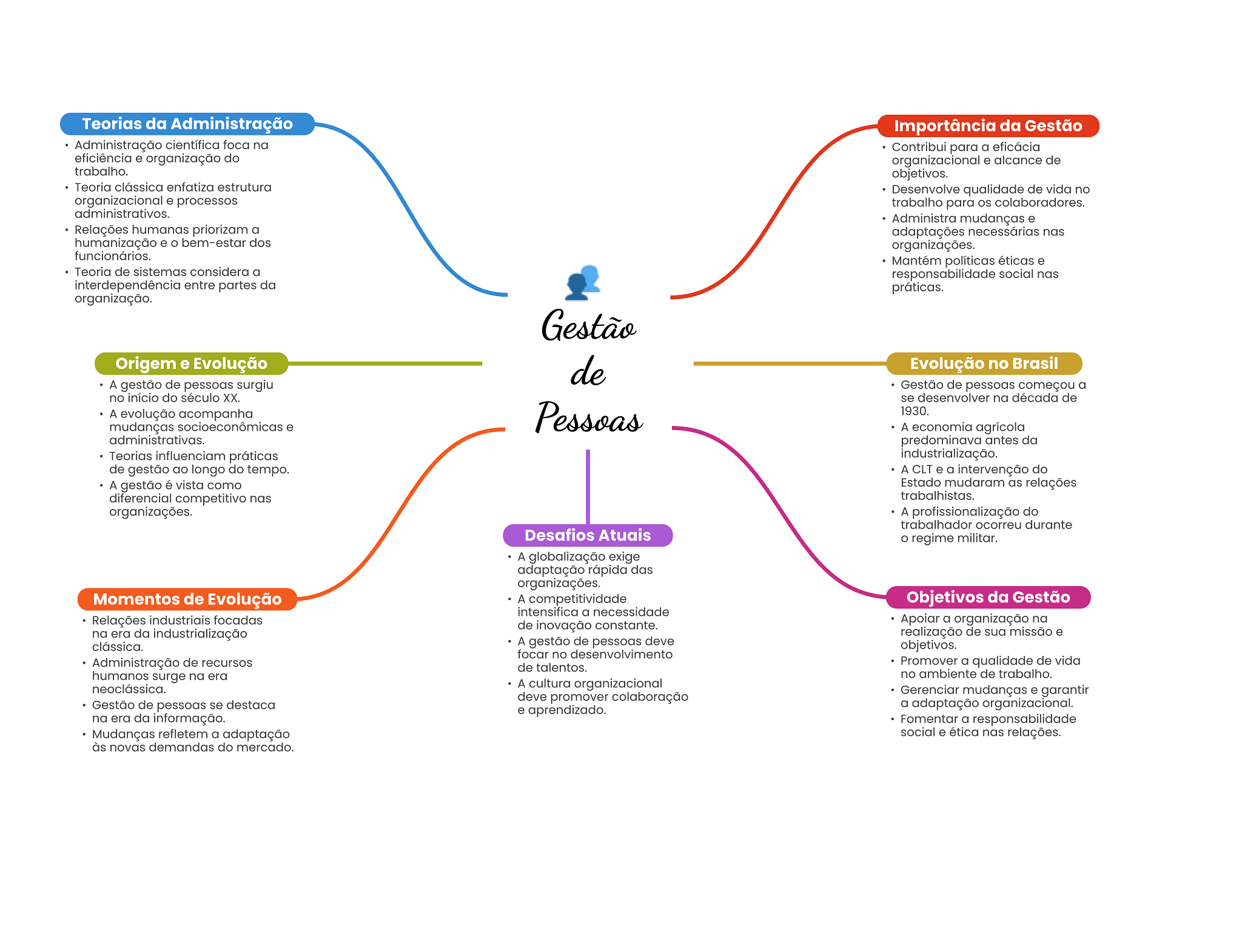 Teorias da Administração Importância da Gestão Administração científica foca na Contribui para a eficácia eficiência e organização do organizacional e alcance de trabalho. objetivos. Teoria clássica enfatiza estrutura Desenvolve qualidade de vida no organizacional e processos trabalho para colaboradores. administrativos. Administra mudanças e Relações humanas priorizam a adaptações necessárias nas humanização e bem-estar dos organizações. funcionários. Mantém políticas éticas e Teoria de sistemas considera a responsabilidade social nas interdependência entre partes da práticas. organização. Gestão Origem e Evolução de Evolução no Brasil A gestão de pessoas surgiu Gestão de pessoas começou a no início do século XX. se desenvolver na década de A evolução acompanha Pessoas 1930. mudanças socioeconômicas e A economia agrícola administrativas. predominava antes da Teorias influenciam práticas industrialização. de gestão ao longo do tempo. A CLT e a intervenção do A gestão é vista como Estado mudaram as relações diferencial competitivo nas trabalhistas. organizações. A profissionalização do trabalhador ocorreu durante Desafios Atuais O regime militar. A globalização exige adaptação rápida das organizações. Momentos de Evolução A competitividade Objetivos da Gestão intensifica a necessidade Relações industriais focadas de inovação constante. Apoiar a organização na na era da industrialização realização de sua missão e clássica. A gestão de pessoas deve objetivos. focar no desenvolvimento Administração de recursos de talentos. Promover a qualidade de vida humanos surge na era no ambiente de trabalho. neoclássica. A cultura organizacional deve promover colaboração Gerenciar mudanças e garantir Gestão de pessoas se destaca e aprendizado. a adaptação organizacional. na era da informação. Fomentar a responsabilidade Mudanças refletem a adaptação social e ética nas relações. às novas demandas do mercado.