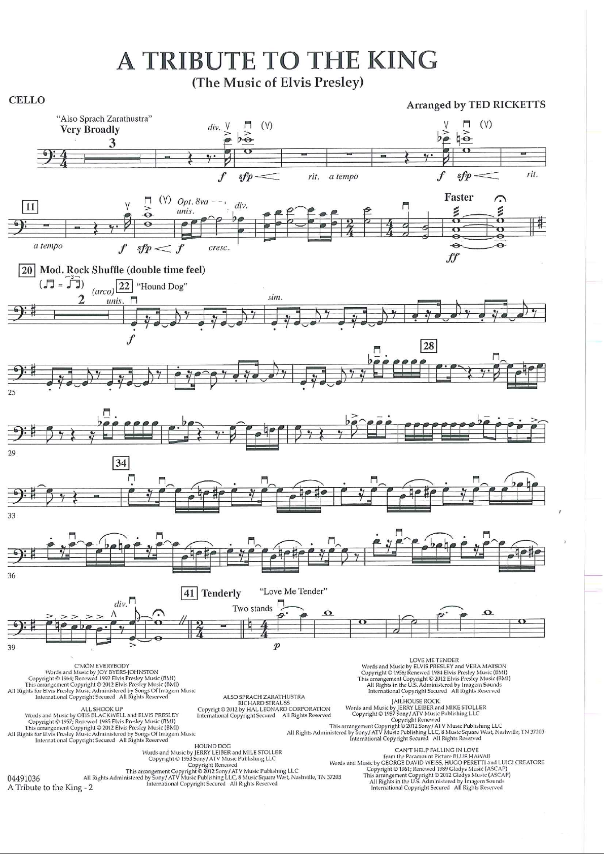 A TRIBUTE TO THE KING (The Music of Elvis Presley) CELLO Arranged by TED RICKETTS "Also Sprach Zarathustra" Very Broadly div. V (V) V (V) V V V 3 rit. a tempo sfp rit. (V) Faster 11 V Opt. 8va V div. unis. a tempo cresc. 20 Mod. Rock Shuffle (double time feel) = ) 22 (arco) "Hound Dog" 2 unis. sim. 28 25 29 34 33 36 41 Tenderly "Love Me Tender" div. Two stands 39 P LOVE ME TENDER C'MON EVERYBODY Words and Music by ELVIS PRESLEY and VERA MATSON Words and Music by JOY BYERS-JOHNSTON Copyright © 1956; Renewed 1984 Elvis Presley Music (BMI) Copyright © 1964; Renewed 1992 Elvis Presley Music (BMI) This arrangement Copyright © 2012 Elvis Presley Music (BMI) This arrangement Copyright © 2012 Elvis Presley Music (BMI) All Rights in the U.S. Administered by Imagem Sounds All Rights for Elvis Presley Music Administered by Songs Of Imagem Music International Copyright Secured All Rights Reserved International Copyright Secured All Rights Reserved ALSO SPRACH ZARATHUSTRA RICHARD STRAUSS JAILHOUSE ROCK ALL SHOOK UP Copyrigt © 2012 by HAL LEONARD CORPORATION Words and Music by JERRY LEIBER and MIKE STOLLER Words and Music by OTIS BLACKWELL and ELVIS PRESLEY International Copyright Secured All Rights Reserved Copyright © 1957 Sony ATV Music Publishing LLC Copyright © 1957; Renewed 1985 Elvis Presley Music (BMI) Copyright Renewed This arrangement Copyright © 2012 Elvis Presley Music (BMI) This arrangement Copyright © 2012 Sony/ ATV Music Publishing LLC All Rights for Elvis Presley Music Administered by Songs Of Imagem Music All Rights Administered by ATV Music Publishing LLC, 8 Music Square West, Nashville, TN 37203 International Copyright Secured All Rights Reserved International Copyright Secured All Rights Reserved HOUND DOG Words and Music by JERRY LEIBER and MILE STOLLER CAN'T HELP FALLING IN LOVE Copyright © 1953 Sony/ ATV Music Publishing LLC from the Paramount Picture BLUE HAWAII Copyright Renewed Words and Music by GEORGE DAVID WEISS, HUCO PERETTI and LUIGI CREATORE This arrangement Copyright © 2012 ATV Music Publishing LLC Copyright © 1961; Renewed 1989 Gladys Music (ASCAP) 04491036 All Rights Administered by ATV Music Publishing LLC, 8 Music Square West, Nashville, TN 37203 This arrangement Copyright © 2012 Gladys Music (ASCAP) International Copyright Secured All Rights Reserved All Rights in the U.S. Administered by Imagem Sounds A Tribute to the King 2 International Copyright Secured All Rights ReservedCELLO Soli 50 div. All 49 mp mf P rit. P rall. "C'mon Everybody" 58 Fast Rock 'n' Roll 2 unis. V 6 mf V V V V > 72 V 66 V V ^ V V 73 80 V 88 div. div. V V 6 unis. V V "Jailhouse Rock" 3 A 96 Rockabilly (l'istesso tempo) = ^ V V > V . V V V 92 104 > V > 100 112 . V 108 3 3 120 V V V V V > V 115 122 arco V V 129 04491036 A Tribute to the King 3CELLO "Can't Help Falling In Love" 135 Tenderly, con moto div. . . . . . . . . 145 V V V V . . . . 143 151 V Driving Rock "All Shook Up" 165 159 div. div. 2 P mf 169 V V ^ ^ ^ unis. V V 5 V V 181 V VV ^ VV V V mf 190 V VV > (V) div. V ^ V ^ 187 sfp 198 unis. div. V V V > . 195 V V V V 206 unis. V V ^ V V V 201 V V V V V V V V V V V 208 (V) 214 div. ^^^^^^^ A V V V V V rit. 04491036 A Tribute to the King 4