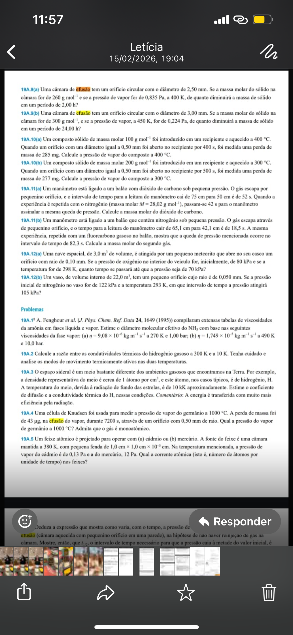 11:57 Letícia 15/02/2026, 19:04 19A.9(a) Uma câmara de efusão tem um orificio circular com diâmetro de 2,50 mm. Se a massa molar do sólido na câmara for de 260 g mol⁻¹ e se a pressão de vapor for de 0,835 Pa, a de quanto diminuirá a massa de sólido em um período de 2,00 19A.9(b) Uma câmara de efusão tem um orificio circular com o diâmetro de 3,00 mm. Se a massa molar do sólido na câmara for de 300 g mol⁻¹, e se a pressão de vapor, a for de 0,224 Pa, de quanto diminuirá a massa de sólido em um período de 24,00 h? 19A.10(a) Um composto sólido de massa molar 100 g mol⁻¹ foi introduzido em um recipiente e aquecido a 400 °C. Quando um orificio com um diâmetro igual a 0,50 mm foi aberto no recipiente por 400 foi medida uma perda de massa de 285 mg. Calcule a pressão de vapor do composto a 400 °C. 19A.10(b) Um composto sólido de massa molar 200 g mol⁻¹ foi introduzido em um recipiente e aquecido a °C. Quando um orificio com um diâmetro igual a 0,50 mm foi aberto no recipiente por 500 foi medida uma perda de massa de 277 mg. Calcule a pressão de vapor do composto a 300 °C. 19A.11(a) Um manômetro está ligado a um balão com dióxido de carbono sob pequena pressão. gás escapa por pequenino orificio, e o intervalo de tempo para a leitura do manômetro cai de 75 cm para 50 cm é de 52 S. Quando a experiência é repetida com nitrogênio (massa molar M 28,02 g passam-se 42 S para manômetro assinalar a mesma queda de pressão. Calcule a massa molar do dióxido de carbono. 19A.11(b) Um manômetro está ligado a um balão que contém nitrogênio sob pequena pressão. gás escapa através de pequenino orificio, e tempo para a leitura do manômetro cair de 65,1 cm para 42,1 cm é de 18,5 S. A mesma experiência, repetida com um fluorcarbono gasoso no balão, mostra que a queda de pressão mencionada ocorre no intervalo de tempo de 82,3 S. Calcule a massa molar do segundo gás. 19A.12(a) Uma nave espacial, de 3,0 m³ de volume, é atingida por um pequeno meteorito que abre no seu casco um orificio com raio de 0,10 mm. Se a pressão de oxigênio no interior do veículo for, inicialmente, de 80 kPa e se a temperatura for de 298 K, quanto tempo se passará até que a pressão seja de 70 kPa? 19A.12(b) Um vaso, de volume interno de 22,0 m³, tem um pequeno cujo raio é de 0,050 mm. Se a pressão inicial de nitrogênio no vaso for de 122 kPa e a temperatura 293 em que intervalo de tempo a pressão atingirá 105 kPa? Problemas A. Fenghour et al. (J. Phys. Chem. Ref. Data 1649 (1995)) compilaram extensas tabelas de viscosidades da amônia em fases líquida e vapor. Estime diâmetro molecular efetivo do NH3 com base nas seguintes viscosidades da fase vapor: (a) " kg m⁻¹ s⁻¹ a 270 K e 1,00 (b) 1,749 10⁻⁵ kg m⁻¹ a e 10,0 bar. 19A.2 Calcule a razão entre as condutividades térmicas do hidrogênio gasoso a 300 K e a Tenha cuidado e analise os modos de movimento termicamente ativos nas duas temperaturas. 19A.3 espaço sideral é um meio bastante diferente dos ambientes gasosos que encontramos na Terra. Por exemplo, a densidade representativa do meio é cerca de átomo por e este átomo, nos casos tipicos, é de hidrogênio, H. A temperatura do meio, devida à radiação de fundo das estrelas, é de kK aproximadamente. Estime coeficiente de difusão e a condutividade térmica do nessas condições. Comentário: A energia é transferida com muito mais eficiência pela radiação. 19A.4 Uma célula de Knudsen foi usada para medir a pressão de vapor do germânio a 1000 °C. A perda de massa foi de 43 na efusão do vapor, durante 7200 através de um orificio com 0,50 mm de raio. Qual a pressão do vapor de germânio a 1000 °C? Admita que o gás é monoatômico. 19A.5 Um feixe atômico é projetado para operar com (a) cádmio ou (b) mercúrio. A fonte do feixe é uma câmara mantida a 380 com pequena fenda de 1,0 cm 1,0 cm 10⁻³ cm. Na temperatura mencionada, a pressão de vapor do cádmio é de Pa e a do mercúrio, 12 Pa. Qual a corrente atômica (isto é, número de átomos por unidade de tempo) nos feixes? Responder Deduza a expressão que mostra como varia, com tempo, a pressão de (câmara aquecida com pequenino orificio em uma na hipótese de haver reinjeção de gas na câmara. Mostre, então, que o intervalo de tempo necessário para que a pressão caia à metade do valor inicial, é