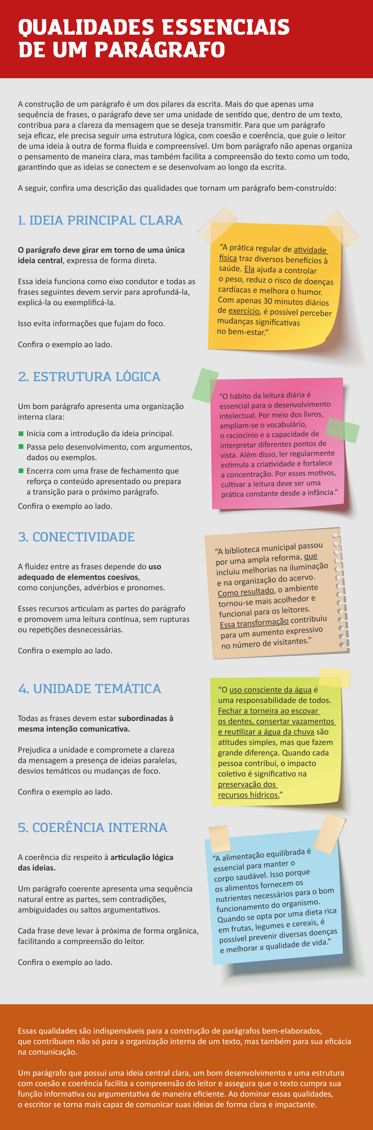 QUALIDADES ESSENCIAIS DE UM PARÁGRAFO A construção de um parágrafo é um dos pilares da escrita. Mais do que apenas uma sequência de frases, parágrafo deve ser uma unidade de sentido que, dentro de um texto, contribua para a clareza da mensagem que se deseja transmitir. Para que um parágrafo seja eficaz, ele precisa seguir uma estrutura lógica, com coesão e coerência, que guie leitor de uma ideia à outra de forma fluida e compreensível. Um bom parágrafo não apenas organiza pensamento de maneira clara, mas também facilita a compreensão do texto como um todo, garantindo que as ideias se conectem e se desenvolvam ao longo da escrita. A seguir, confira uma descrição das qualidades que tornam um parágrafo bem-construído: 1. IDEIA PRINCIPAL CLARA o parágrafo deve girar em torno de uma única "A prática regular de atividade ideia central, expressa de forma direta. física traz diversos benefícios à saúde. Ela ajuda a controlar Essa ideia funciona como eixo condutor e todas as peso, reduz risco de doenças frases seguintes devem servir para aprofundá-la, cardíacas e melhora humor. explicá-la ou exemplificá-la. Com apenas 30 minutos diários de exercício, é possível perceber Isso evita informações que fujam do foco. mudanças significativas no bem-estar." Confira exemplo ao lado. 2. ESTRUTURA LÓGICA hábito da leitura diária é Um bom parágrafo apresenta uma organização essencial para desenvolvimento interna clara: intelectual. Por meio dos livros, ampliam-se vocabulário, Inicia com a introdução da ideia principal. raciocínio e a capacidade de Passa pelo desenvolvimento, com argumentos, interpretar diferentes pontos de dados ou exemplos. vista. Além disso, ler regularmente estimula a criatividade e fortalece Encerra com uma frase de fechamento que a concentração. Por esses motivos, reforça conteúdo apresentado ou prepara cultivar a leitura deve ser uma a transição para próximo parágrafo. prática constante desde a infância." Confira exemplo ao lado. 3. CONECTIVIDADE "A biblioteca municipal passou por uma ampla reforma, que A fluidez entre as frases depende do uso incluiu melhorias na iluminação adequado de elementos coesivos, e na organização do acervo. como conjunções, advérbios e pronomes. Como resultado, ambiente tornou-se mais acolhedor e Esses recursos articulam as partes do parágrafo funcional para os leitores. e promovem uma leitura contínua, sem rupturas Essa transformação contribuiu ou repetições desnecessárias. para um aumento expressivo no número de visitantes." Confira exemplo ao lado. 4. UNIDADE TEMÁTICA uso consciente da água é uma responsabilidade de todos. Fechar a torneira ao escovar Todas as frases devem estar subordinadas à os dentes, consertar vazamentos mesma intenção comunicativa. e reutilizar a água da chuva são atitudes simples, mas que fazem Prejudica a unidade e compromete a clareza grande diferença. Quando cada da mensagem a presença de ideias paralelas, pessoa contribui, impacto desvios temáticos ou mudanças de foco. coletivo é significativo na preservação dos Confira exemplo ao lado. recursos hídricos." 5. COERÊNCIA INTERNA A coerência diz respeito à articulação lógica "A alimentação equilibrada é das ideias. essencial para manter corpo saudável. Isso porque Um parágrafo coerente apresenta uma sequência os alimentos fornecem os natural entre as partes, sem contradições, nutrientes necessários para bom ambiguidades ou saltos argumentativos. funcionamento do organismo. Quando se opta por uma dieta rica Cada frase deve levar à próxima de forma orgânica, em frutas, legumes e cereais, é facilitando a compreensão do leitor. possível prevenir diversas doenças e melhorar a qualidade de vida." Confira exemplo ao lado. Essas qualidades são indispensáveis para a construção de parágrafos bem-elaborados, que contribuem não só para a organização interna de um texto, mas também para sua eficácia na comunicação. Um parágrafo que possui uma ideia central clara, um bom desenvolvimento e uma estrutura com coesão e coerência facilita a compreensão do leitor e assegura que texto cumpra sua função informativa ou argumentativa de maneira eficiente. Ao dominar essas qualidades, escritor se torna mais capaz de comunicar suas ideias de forma clara e impactante.