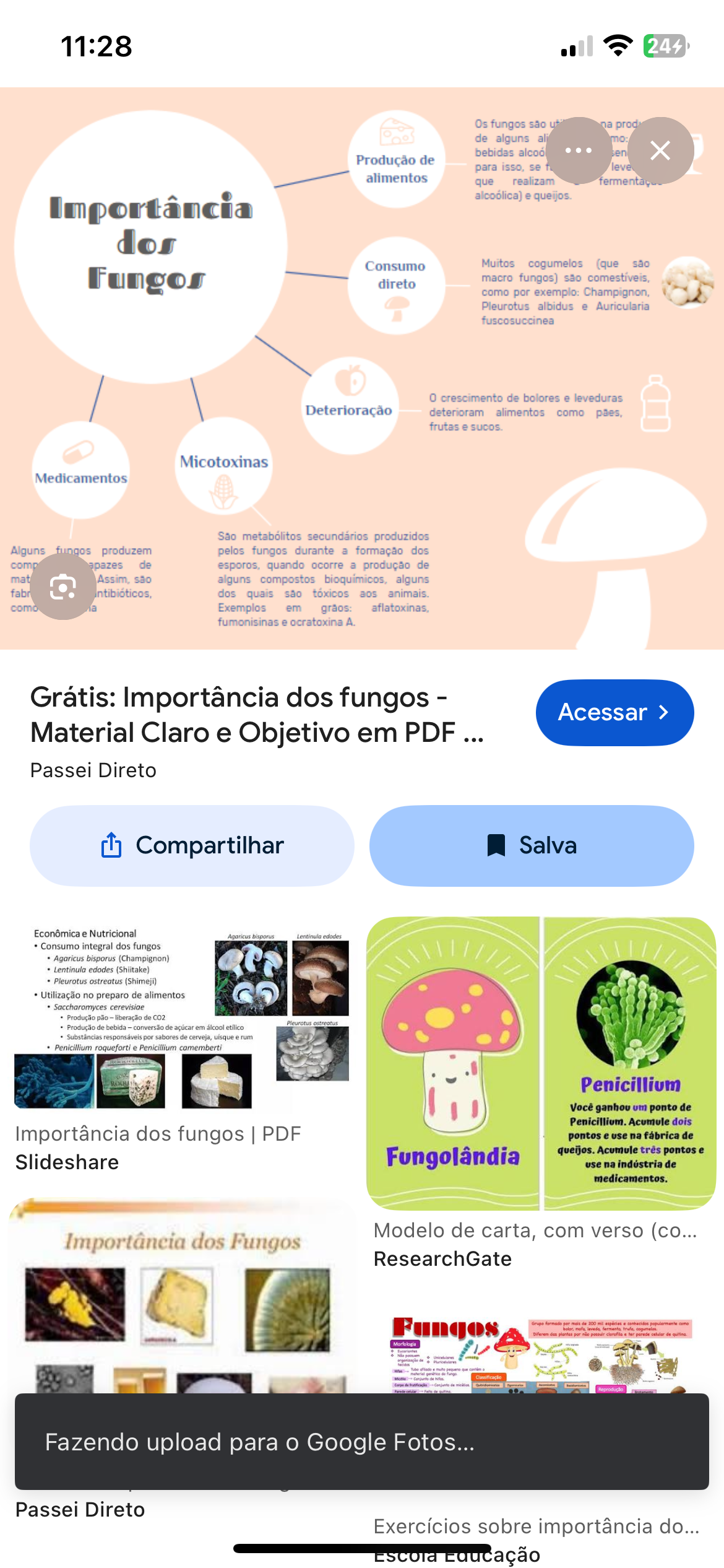 11:28 244 - Os fungos são na prod de alguns ali mo bebidas alcoó Produção de para isso, se leve alimentos que realizam fermenta Importância alcoólica) e queijos. dos Consumo Muitos cogumelos (que são Fungos direto macro fungos) são comestíveis, como por exemplo: Champignon, Pleurotus albidus e Auricularia fuscosuccinea 0 crescimento de bolores e leveduras Deterioração deterioram alimentos como frutas sucos Micotoxinas Medicamentos Sao metabólitos secundários produzidos Alguns fungos produzem pelos fungos durante a formação dos comp pazes de esporos, quando ocorre a produção de mat Assim, são alguns compostos alguns fabr dos quais são tóxicos aos animais. como Exemplos em grãos: aflatoxinas, fumonisinas e ocratoxina Grátis: Importância dos fungos Acessar Material Claro e Objetivo em PDF Passei Direto Compartilhar Salva Econômica e Nutricional Agaricus bisporus Lentinula edodes Consumo integral dos fungos Agaricus bisporus (Champignon) Lentinula edodes (Shiitake) Pleurotus ostreatus (Shimeji) Utilização no preparo de alimentos Saccharomyces cerevisiae Produção pão liberação de CO2 Pleurotus Produção de bebida conversão de açúcar em álcool Substâncias responsáveis por sabores de cerveja, uisque rum Penicillium roqueforti Penicillium camemberti Penicillium Você ganhou um ponto de Penicillium. Acumule dois Importância dos fungos PDF pontos e use na fábrica de Slideshare Fungolândia queijos. Acumule três pontos e use na indústria de medicamentos. Importância dos Fungos Modelo de carta, com verso (co... ResearchGate Fungos Fazendo upload para Google Fotos... Passei Direto Exercícios sobre importância do... Educação
