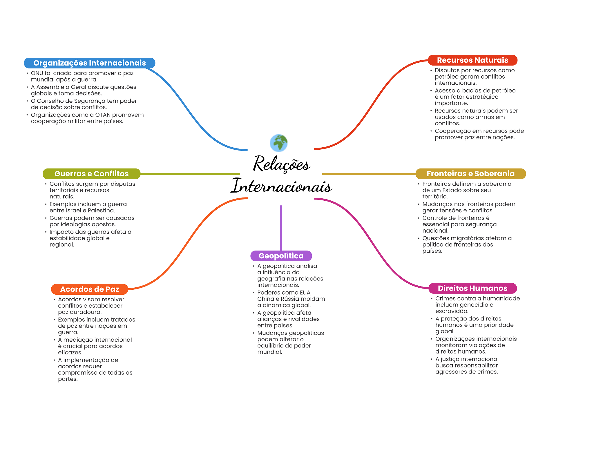 Organizações Internacionais Recursos Naturais ONU foi criada para promover a paz Disputas por recursos como mundial após a guerra. petróleo geram conflitos internacionais. A Assembleia Geral discute questões globais e toma decisões. Acesso a bacias de petróleo é um fator estratégico Conselho de Segurança tem poder importante. de decisão sobre conflitos. Recursos naturais podem ser Organizações como a OTAN promovem usados como armas em cooperação militar entre países. conflitos. Cooperação em recursos pode promover paz entre nações. Relações Guerras e Conflitos Fronteiras e Soberania Conflitos surgem por disputas Internacionais Fronteiras definem a soberania territoriais e recursos de um Estado sobre seu naturais. território. Exemplos incluem a guerra Mudanças nas fronteiras podem entre Israel e Palestina. gerar tensões e conflitos. Guerras podem ser causadas Controle de fronteiras é por ideologias opostas. essencial para segurança Impacto das guerras afeta a nacional. estabilidade global e Questões migratórias afetam a regional. política de fronteiras dos países. Geopolítica A geopolítica analisa a influência da geografia nas relações internacionais. Acordos de Paz Direitos Humanos Poderes como EUA, Acordos visam resolver China e Rússia moldam Crimes contra a humanidade conflitos e estabelecer a dinâmica global. incluem genocídio e paz duradoura. A geopolítica afeta escravidão. Exemplos incluem tratados alianças e rivalidades A proteção dos direitos de paz entre nações em entre países. humanos é uma prioridade guerra. Mudanças geopolíticas global. A mediação internacional podem alterar Organizações internacionais é crucial para acordos equilíbrio de poder monitoram violações de eficazes. mundial. direitos humanos. A implementação de A justiça internacional acordos requer busca responsabilizar compromisso de todas as agressores de crimes. partes.