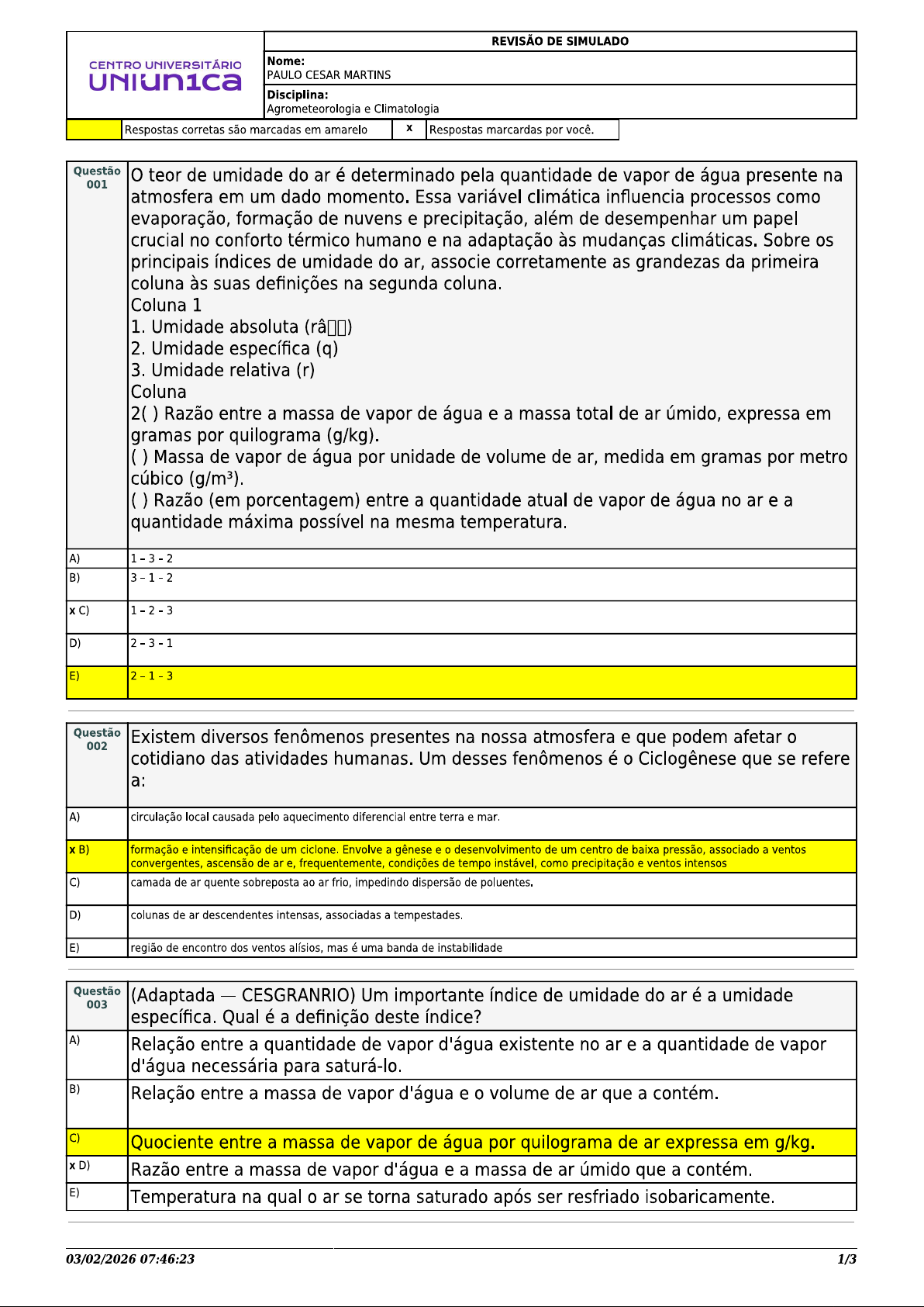 REVISÃO DE SIMULADO CENTRO UNIVERSITÁRIO Nome: PAULO CESAR MARTINS Disciplina: Agrometeorologia e Climatologia Respostas corretas são marcadas em amarelo X Respostas marcardas por você. Questão teor de umidade do ar é determinado pela quantidade de vapor de água presente na 001 atmosfera em um dado momento. Essa variável climática influencia processos como evaporação, formação de nuvens e precipitação, além de desempenhar um papel crucial no conforto térmico humano e na adaptação às mudanças climáticas. Sobre os principais índices de umidade do ar, associe corretamente as grandezas da primeira coluna às suas definições na segunda coluna. Coluna 1 1. Umidade absoluta 2. Umidade específica (q) 3. Umidade relativa (r) Coluna 2( ) Razão entre a massa de vapor de água e a massa total de ar úmido, expressa em gramas por quilograma (g/kg). Massa de vapor de água por unidade de volume de ar, medida em gramas por metro cúbico (g/m³). Razão (em porcentagem) entre a quantidade atual de vapor de água no ar e a quantidade máxima possível na mesma temperatura. A) 1-3-2 B) 3-1-2 X C) 1-2-3 D) 2-3-1 E) Questão Existem diversos fenômenos presentes na nossa atmosfera e que podem afetar 002 cotidiano das atividades humanas. Um desses fenômenos é Ciclogênese que se refere a: A) circulação local causada pelo aquecimento diferencial entre terra e mar. B) formação e intensificação de um ciclone. Envolve a gênese e desenvolvimento de um centro de baixa pressão, associado a ventos convergentes, ascensão de ar e, frequentemente, condições de tempo instável, como precipitação e ventos intensos C) camada de ar quente sobreposta ao ar frio, impedindo dispersão de poluentes. D) colunas de ar descendentes intensas, associadas a tempestades. E) região de encontro dos ventos alísios, mas é uma banda de instabilidade Questão (Adaptada CESGRANRIO) Um importante índice de umidade do ar é a umidade 003 específica. Qual é a definição deste índice? A) Relação entre a quantidade de vapor d'água existente no ar e a quantidade de vapor d'água necessária para saturá-lo. B) Relação entre a massa de vapor d'água e volume de ar que a contém. C) Quociente entre a massa de vapor de água por quilograma de ar expressa em g/kg. X D) Razão entre a massa de vapor d'água e a massa de ar úmido que a contém. E) Temperatura na qual an se torna saturado após ser resfriado isobaricamente. 03/02/2026 07:46:23 1/3Questão A pressão atmosférica, importante elemento climático, é inversamente proporcional à: 004 A) Latitude. B) Altitude. C) Temperatura. D) Longitude. E) Umidade. Questão Quais são os principais gases que compõem a atmosfera terrestre, considerando sua 005 predominância? Nitrogênio e Oxigênio B) Argônio e Hélio C) Nitrogênio e Ozônio D) Oxigênio e Hélio E) Metano e Enxofre Questão A atmosfera terrestre é formada por diferentes camadas, cada uma representada por 006 uma cor específica conforme a figura abaixo. Assinale a questão que traz a associação de cada faixa de cor à camada correspondente, identificando-as corretamente. 0.0 0.2 0,4 0.8 1.0 90 80 0.0 70 0.1 60 50 1 40 10 30 20 10 0 -100 -80 -60 -40 -20 0 20 40 TEMPERATURA (*C) A) Azul: Troposfera, Verde: Mesosfera, Bege: Termosfera, Rosa claro: Estratosfera. B) Azul: Mesosfera; Verde: Termosfera; Bege: Estratosfera; Rosa claro: Troposfera. C) Azul: Estratosfera; Verde: Mesosfera; Bege: Troposfera; Rosa claro: Termosfera. X D) Azul: Troposfera; Verde: Estratosfera; Bege: Mesosfera; Rosa claro: Termosfera. E) Azul: Termosfera, Verde: Troposfera, Bege: Estratosfera, Rosa claro: Mesosfera. Questão (PUC) 0,5 mols de um gás ocupam um volume V de 0,1 m3 quando em uma 007 temperatura de 300 Qual é a pressão do gás em 300 K? Considere R = 8,3 A) Pa B) 1245 Pa C) 1830 Pa 03/02/2026 07:46:23 2/3D) 12 450 Pa E) 830 Pa Questão Quais proposições apresentam a unidade de medida correspondente às grandezas 008 físicas estudadas na lei dos gases? I. A temperatura é medida em Kelvin. II. A pressão é medida em Celsius. III. volume é medido em metros quadrados. IV. número de mols do gás é medido em mols. A) Alternativas III e IV. B) Alternativas e IV. C) Alternativas I e III. X D) Alternativas I e IV. E) Alternativas I e II 03/02/2026 07:46:23 3/3REVISÃO DE SIMULADO CENTRO UNIVERSITÁRIO Nome: PAULO CESAR MARTINS Disciplina: Agrometeorologia e Climatologia Respostas corretas são marcadas em amarelo X Respostas marcardas por você. Questão (UNIVIDA, 2024) O clima predominante no Brasil é Contudo, devido à 001 grande extensão territorial do país, há uma diversidade climática. A) Tropical litorâneo B) Tropical C) Tropical Semiárido D) Equatorial E) Desértico Questão Com base na figura abaixo, a quais considerações podemos chegar ao refletir sobre a 002 realidade do clima no nosso país.Com base na figura abaixo, a quais considerações podemos chegar ao refletir sobre a realidade do clima no nosso país. 2000 22 Norte A) A classificação climática de Köppen é aplicada apenas em países de clima tropical, sendo inadequada para regiões subtropicais ou temperadas como Sul do Brasil. B) A região Nordeste (BSh) possui maior volume de precipitação anual do que Centro-Oeste (Aw), apesar de apresentar um clima semiárido. C) A classificação climática de Köppen revela fortes contrastes entre as macrorregiões brasileiras em termos de precipitação e temperatura média anual. D) A região Sul (Cfa) apresenta temperaturas médias mais elevadas do que a região Norte (Af), apesar de sua precipitação ser menor. E) A classificação climática de Köppen divide Brasil em apenas três zonas climáticas, com pouca variação entre elas ao longo do ano. Questão (UDESC IMA Geógrafo 2019) sistema de classificação climática de Köppen 003 reconhece cinco tipos climáticos principais, baseando-se nas oscilações sazonais de temperatura e precipitação. Associe as col