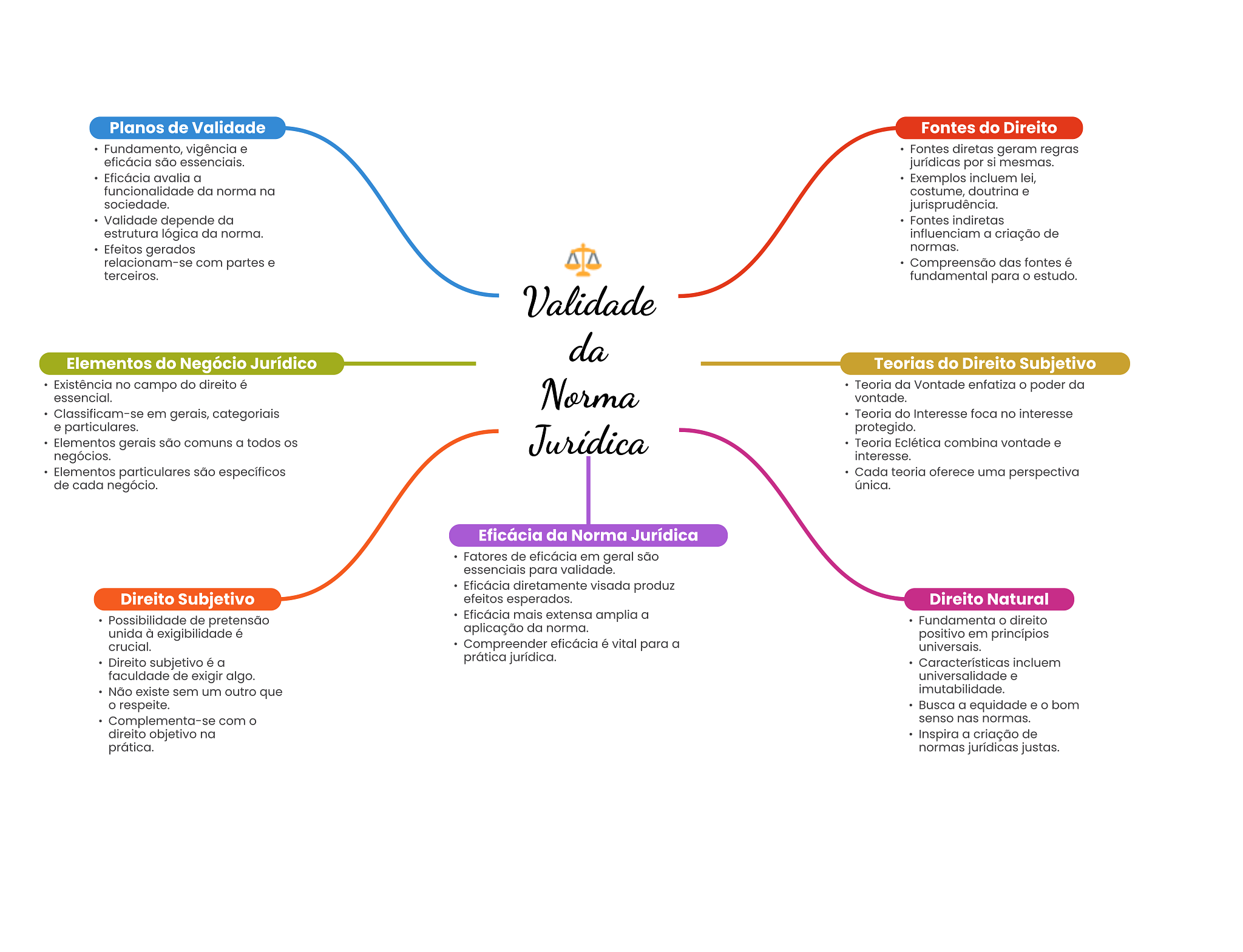 Planos de Validade Fontes do Direito Fundamento, vigência e Fontes diretas geram regras eficácia são essenciais. jurídicas por si mesmas. Eficácia avalia a Exemplos incluem lei, funcionalidade da norma na costume, doutrina e sociedade. jurisprudência. Validade depende da Fontes indiretas estrutura lógica da norma. influenciam a criação de Efeitos gerados normas. relacionam-se com partes e Compreensão das fontes é terceiros. fundamental para estudo. Validade da Elementos do Negócio Jurídico Teorias do Direito Subjetivo Existência no campo do direito é Norma Teoria da Vontade enfatiza O poder da essencial. vontade. Classificam-se em gerais, categoriais Teoria do Interesse foca no interesse e particulares. Jurídica protegido. Elementos gerais são comuns a todos OS Teoria Eclética combina vontade e negócios. interesse. Elementos particulares são específicos Cada teoria oferece uma perspectiva de cada negócio. única. Eficácia da Norma Jurídica Fatores de eficácia em geral são essenciais para validade. Eficácia diretamente visada produz Direito Subjetivo efeitos esperados. Direito Natural Possibilidade de pretensão Eficácia mais extensa amplia a Fundamenta direito unida à exigibilidade é aplicação da norma. positivo em princípios crucial. Compreender eficácia é vital para a universais. Direito subjetivo é a prática jurídica. Características incluem faculdade de exigir algo. universalidade e Não existe sem um outro que imutabilidade. O respeite. Busca a equidade e bom Complementa-se com senso nas normas. direito objetivo na Inspira a criação de prática. normas jurídicas justas.