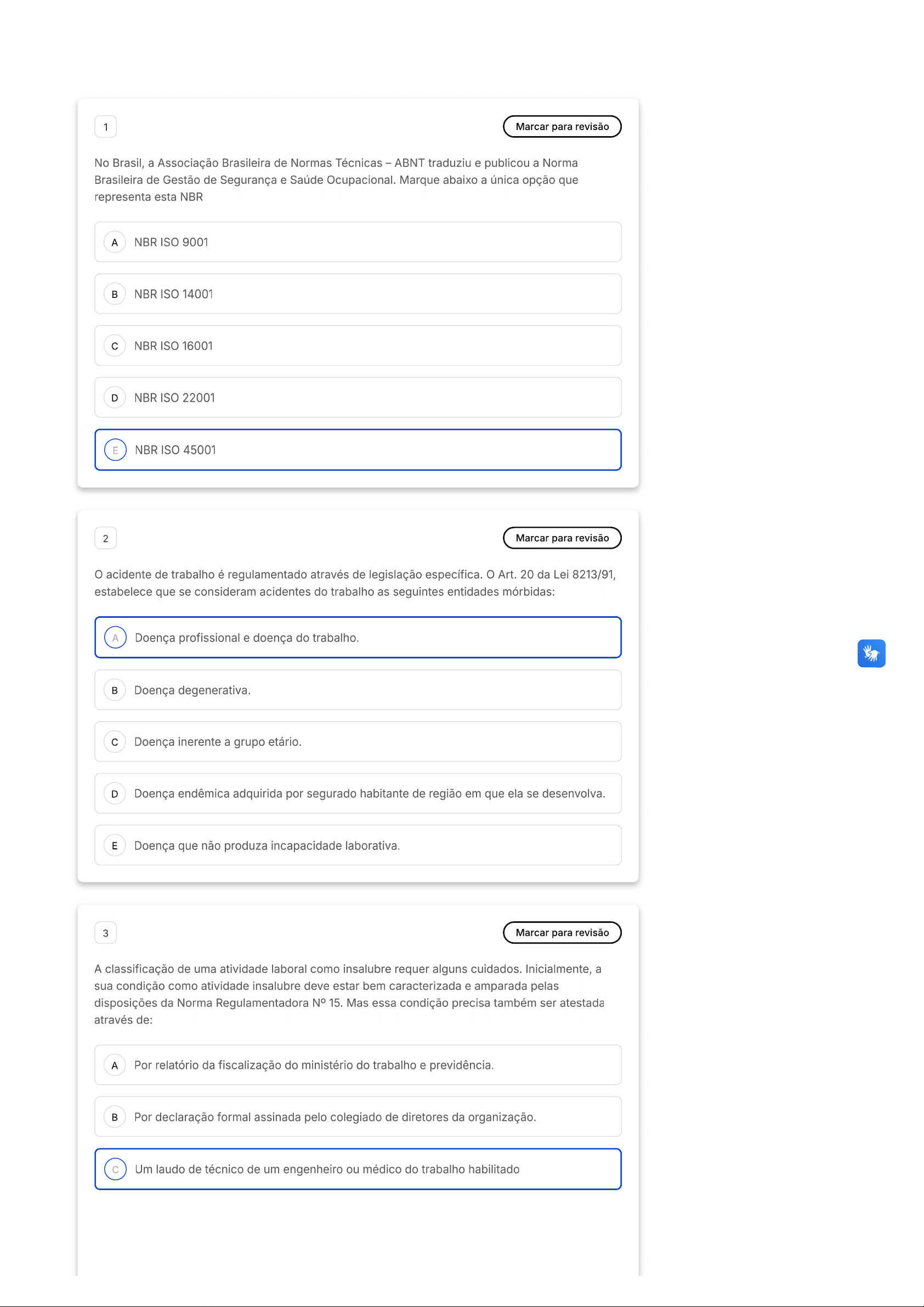 1 Marcar para revisão No Brasil, a Associação Brasileira de Normas Técnicas ABNT traduziu e publicou a Norma Brasileira de Gestão de Segurança e Saúde Ocupacional. Marque abaixo a única opção que representa esta NBR A NBR ISO 9001 NBR ISO 14001 NBR ISO 16001 D NBR ISO 22001 E NBR ISO 45001 2 Marcar para revisão acidente de trabalho é regulamentado através de legislação específica. Art. 20 da Lei 8213/91, estabelece que se consideram acidentes do trabalho as seguintes entidades mórbidas: A Doença profissional e doença do trabalho. Doença degenerativa. c Doença inerente a grupo etário. D Doença endêmica adquirida por segurado habitante de região em que ela se desenvolva. E Doença que não produza incapacidade laborativa. 3 Marcar para revisão A classificação de uma atividade laboral como insalubre requer alguns cuidados. Inicialmente, a sua condição como atividade insalubre deve estar bem caracterizada e amparada pelas disposições da Norma Regulamentadora N° 15. Mas essa condição precisa também ser atestada através de: A Por relatório da fiscalização do ministério do trabalho e previdência. Por declaração formal assinada pelo colegiado de diretores da organização. Um laudo de técnico de um engenheiro ou médico do trabalho habilitadoD Um laudo técnico e operacional emitido por uma auditoria externa E Um receituário médico simples, emitido pelo médico do trabalho. 4 Marcar para revisão É um fato bem conhecido de todos os gestores de organizações produtivas que os ambientes de trabalho representam oportunidades para que sejam implementadas diversas intervenções ergonômicas a fim de deixá-los mais saudáveis e seguros. Com base nesse entendimento, é possível afirmar que: Nem todos os pontos críticos presentes em postos de trabalho que exigem um tratamento A muito particular podem provocar impactos sobre a saúde e a segurança de trabalhadores. A justificativa da aplicação da norma de ergonomia em empresas se dá muito mais para a correção do que para a prevenção de problemas. Todos os empregados de uma firma devem realizar as suas tarefas com segurança, c eficiência e conforto sem precisar ter acesso aos conhecimentos ergonômicos. Todos os problemas existentes em cada posto de trabalho podem ser identificados D rapidamente. Os trabalhadores possuem direito de cobrar de sua empresa melhores condições de E trabalho que visem ao bem-estar deles. 5 Marcar para revisão São muitas mudanças existentes no cenário mundial nos últimos anos que provocaram mudanças significativas dentro dos ambientes corporativos. Certamente, uma delas atinge a necessidade de revisão e possível atualização de sistemas de gestão, com todos os seus recursos a serem administrados. Assinale a alternativa que dá suporte este contexto: comprometimento em relação aos cuidados com a saúde e segurança de recursos A humanos é uma decisão estratégica para muitas firmas. Existem espaços em mercados altamente disputados para empresas que atuam com B pouca eficiência em decisões que envolvem a sobrevivência do próprio negócios. As empresas não devem cuidar dos interesses de clientes (internos e externos) e C parceiros independentes de forma estratégica, pois as próprias estratégias de negócio empresariais merecem prioridade em qualquer contexto. Aspectos ambientais que envolvem a sustentabilidade e geração de resíduos industriais D são mais relevantes do que questões que envolvem a saúde e segurança. A continuidade dos negócios das empresas depende de uma visão mais arriscada e de E curto prazo porque os sistemas de gestão são projetados para responderem aos interesses de demanda e consumo por parte dos clientes. 6 Marcar para revisão Os ambientes de trabalho apresentam diversos riscos, sejam de natureza física, química, biológica, ergonômica ou mesmo de acidentes. Desta forma, marque a única opção onde todos os agentessão de natureza física: A Pressões anormais, calor e radiações ionizantes Ruído, máquinas desprotegidas e radiações ionizantes c Radiações não ionizantes, poeiras minerais e bacilos D Névoas, vapores e bactérias E Estresse, animais peçonhentos e vírus 7 Marcar para revisão A organização deve implementar um processo para eliminar os perigos de risco e reduzir os riscos de saúde e segurança do trabalho SST, adotando a hierarquia de controles. Ocupa a última posição na hierarquia de controles. A Uso de Equipamento de proteção individual ¿ EPI. Eliminação do perigo. Substituição do processo por processos, operações, materiais e equipamentos menos perigosos. D Adoção de controles de engenharia e reorganização do trabalho. E Adoção de controles administrativos, incluindo treinamento. 8 Marcar para revisão Existem vários órgãos federais, agências reguladoras, e outras organizações públicas ou privadas atuando na preservação do meio ambiente, executando ações de fiscalização, normatização ou campanhas de orientação, entre outras ações. Duas organizações públicas que executam atividades de fiscalização o ICMBIO e o IBAMA são órgãos federais voltados para a fiscalização da legislação e regulamentação relacionada ao Meio Ambiente, dentro de suas respectivas competências: A Situações que podem causar danos ou perdas para a organização. Eventos já ocorridos no passado e que provocaram mortes. c situações que podem evitar danos ou perdas para as pessoas. D Eventos que provocarão mortes na organização no futuro. E situações que podem causar danos ou perdas para as pessoas.9 Marcar para revisão Os ergonomistas contribuem para o planejamento, projeto e a avaliação de tarefas, assim como para os postos de trabalho, os produtos, os ambientes e os sistemas, a fim de torná-los Prova AV Ergonomia, Higiene e Segurança Do Trabalho T enquanto se sua os seguintes e a única alternativa correta. I. comportamento de risco são ações e