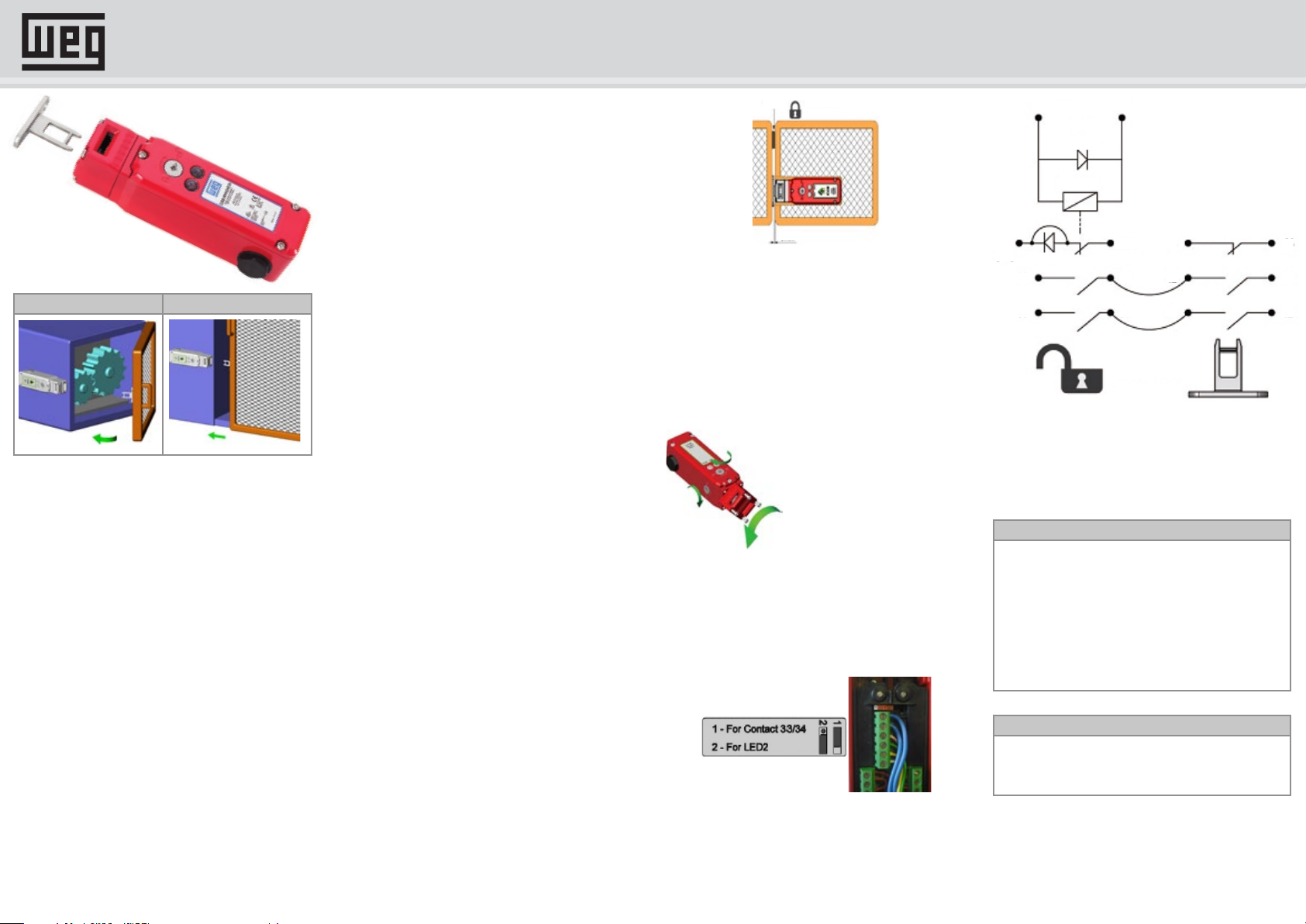 CHAVE DE INTERTRAVAMENTO DE SEGURANÇA COM BLOQUEIO DE PROTEÇÃO CISS-M INSTRUÇÕES DE OPERAÇÃO Proteção articulada Proteção deslizante 1. OBSERVAÇÃO IMPORTANTE Leia com atenção estas instruções antes de instalar, operar ou efetuar manutenção neste equipamento. O produto é projetado para ser um componente de um sistema de controle de segurança customizado. É de responsabilidade de cada fabricante assegurar a operação geral correta se seus sistemas e máquinas. A WEG, suas subsidiárias e afiliadas não garantem todas as características de um dado sistema ou produto que não seja projetado pela própria WEG. 2. APLICAÇÃO E OPERAÇÃO Chaves de intertravamento de segurança com trava de proteção são projetadas para instalação na borda anterior de proteções de máquina deslizantes ou articuladas, fornecendo contatos de chaveamento de operação positiva e mecanismo antiviolação do atuador. Elas são projetadas para proporcionar detecção robusta de intertravamento de posição e manter proteções móveis fechadas. A chave é montada de forma rígida na estrutura da proteção ou máquina. O atuador é instalado na parte móvel da proteção e é alinhado com a abertura de entrada da chave. O perfil do atuador é projetado para encaixar em um mecanismo came dentro do cabeçote da chave, criando uma chave de intertravamento de operação positiva que não pode ser facilmente burlada. Quando a proteção é fechada e o atuador é inserido na chave, os contatos de segurança fecham, o atuador é travado e o circuito de partida da máquina pode ser habilitado. Quando a solenoide é energizada, os contatos de segurança abrem de forma positiva, o circuito de parada da máquina é interrompido e a porta de proteção pode ser aberta. 3. INSTALAÇÃO 1. A instalação de todas as chaves de intertravamento deve ser feita de acordo com uma avaliação de risco individual para cada aplicação. A instalação só pode ser feita por um profissional qualificado e de acordo com estas instruções. 2. Os parafusos de montagem M5 devem ser usados para fixar a chave e o atuador; o torque de aperto para assegurar uma fixação confiável é de 4,0 Nm. Para evitar que a chave se solte após a instalação, sempre fixe os parafusos de montagem M5 com trava rosca ou use porcas autoblocantes. O torque de aperto dos parafusos da tampa, tampões de entrada de eletroduto e prensa-cabos deve ser de 1,5 Nm para assegurar vedação IP. Somente use prensa-cabos de tamanho correto para a entrada do eletroduto e diâmetro externo do cabo. O torque de aperto para parafusos do terminal de conexão é de 0,7 Nm; o tamanho máximo de condutor é 1,0 pol.mm. A posição do cabeçote da chave pode ser selecionada; basta remover o atuador, afrouxar os quatro parafusos do cabeçote e então girar o cabeçote para a posição desejada. Reaperte os parafusos e então verifique a inserção e retirada do atuador. O torque de aperto para os parafusos do cabeçote é de 1,5 Nm. A chave é fornecida com enlaces condutores removíveis montados 41/42 e 31/32. Se exigido pelo circuito de controle, eles podem ser removidos para oferecer monitoramento independente da função de bloqueio do solenoide ou atuador. 3. Sempre instale um batente mecânico na proteção para evitar danos à parte frontal da chave. Ajuste a folga do atuador em 3 mm quando a proteção estiver fechada e encostando no batente (veja a figura A). Use guias de alinhamento para assegurar que o atuador entre na chave sem tocar nos lados da abertura. Assegure o acesso a pelo menos um dos pontos de liberação manual. Sempre monte o tampão em aberturas não usadas para evitar a entrada de sujeira no mecanismo da chave. (24 V CC)LED 2(0 V) 33 34 43 44 22 12323111 21 41 42 A1 A2CA / CC LED 1 Solenoide Proteção aberta A conexão entre os terminais 31/32 e 41/42 é feita usando cabos ligados dentro da chave (montados na fábrica). Essas ligações podem ser removidas na instalação para permitir o monitoramento individual do status de bloqueio da solenóide ou o status do atuador. 4. MANuTENÇÃO Toda semana Verifique a operação correta de todos os circuitos e da função de Bloqueio. Se o atuador exibir sinais de deformação ou o corpo do cabeçote apresentar danos mecânicos, substitua todo o dispositivo. A WEG não se responsabiliza por falha das funções da chave se as exigências de instalação e manutenção apresentadas neste documento não forem observadas. Nunca tente remover parafusos ou peças internas do mecanismo; qualquer tentativa de executar tal procedimento anulará a garantia do produto. Nunca tente reparar uma chave. A cada 6 meses Isole a energia e remova a tampa. Verifique o aperto dos parafusos dos terminais e verifique sinais de entrada de umidade. Estas instruções fazem parte da garantia do produto. 3 mm Parada Proteção fechada Figura A 4. Após a instalação, verifique a operação de todos os circuitos de controle e a função de bloqueio. Para aplicações com tempo de desaceleração após remover a energia, certifique-se de que o tempo correto decorreu antes de energizar a solenoide. LED 1 VERMELHO irá acender quando a energia for aplicada em A1 e A2 (alimentação do solenoide). LED 2 VERDE (se usado) irá acender quando o atuador estiver bloqueado. Pontos de liberação manual superior ou lateral Cabeçote giratório com 8 posições de entrada do atuador 5. Importante! Na instalação, selecione o status dos terminais 33 e 34 ajustando a chave deslizante dentro do corpo da chave. Se LED 2 for usado, verifique sempre a polaridade correta CC. Terminal 33: 0 V CC - Terminal 34: + 24 V CC Figura B LED 1 status do solenoide LED 2 status do bloqueio (terminais 33 - 34 são selecionáveis para alimentação do LED 2 ou como um circuito auxiliar sem tensão para indicar status de bloqueio) (veja a figura B). 6. INSERÇÃO dO ATuAdOR 2NF/1NA 6,0 5,0 0 mm 11/12 Aberto Fechado 21/22 Aberto Fechado 33/34 Fe