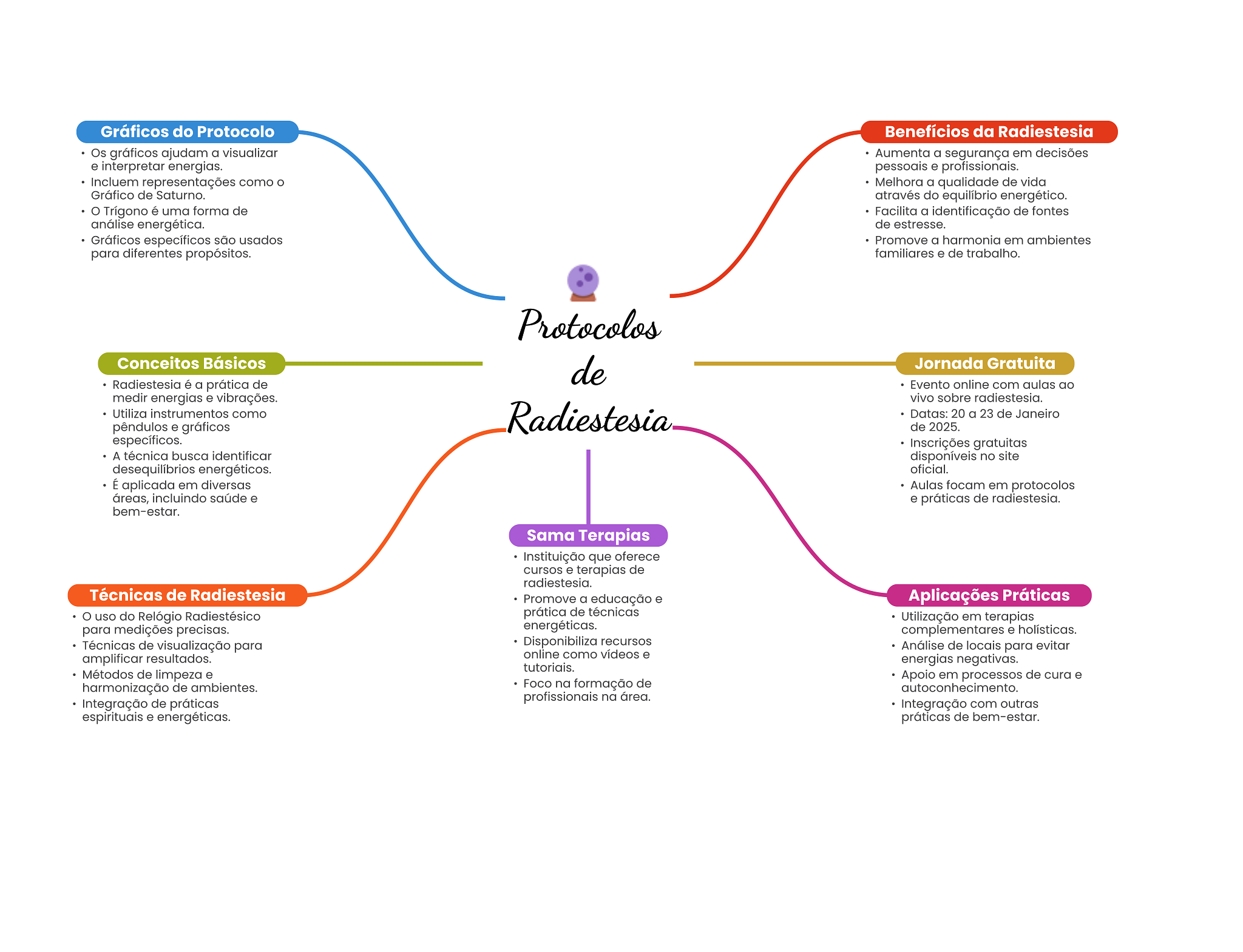 Gráficos do Protocolo Benefícios da Radiestesia Os gráficos ajudam a visualizar Aumenta a segurança em decisões e interpretar energias. pessoais e profissionais. Incluem representações como Melhora a qualidade de vida Gráfico de Saturno. através do equilíbrio energético. Trígono é uma forma de Facilita a identificação de fontes análise energética. de estresse. Gráficos específicos são usados Promove a harmonia em ambientes para diferentes propósitos. familiares e de trabalho. Protocolos Conceitos Básicos de Jornada Gratuita Radiestesia é a prática de Evento online com aulas ao medir energias e vibrações. vivo sobre radiestesia. Utiliza instrumentos como Radiestesia Datas: 20 a 23 de Janeiro pêndulos e gráficos de 2025. específicos. Inscrições gratuitas A técnica busca identificar disponíveis no site energéticos. oficial. É aplicada em diversas Aulas focam em protocolos áreas, incluindo saúde e e práticas de radiestesia. bem-estar. Sama Terapias Instituição que oferece cursos e terapias de radiestesia. Técnicas de Radiestesia Promove a educação e Aplicações Práticas uso do Relógio Radiestésico prática de técnicas Utilização em terapias para medições precisas. energéticas. complementares e holísticas. Técnicas de visualização para Disponibiliza recursos Análise de locais para evitar amplificar resultados. online como vídeos e energias negativas. tutoriais. Métodos de limpeza e Apoio em processos de cura e harmonização de ambientes. Foco na formação de Integração de práticas profissionais na área. Integração com outras espirituais e energéticas. práticas de bem-estar.