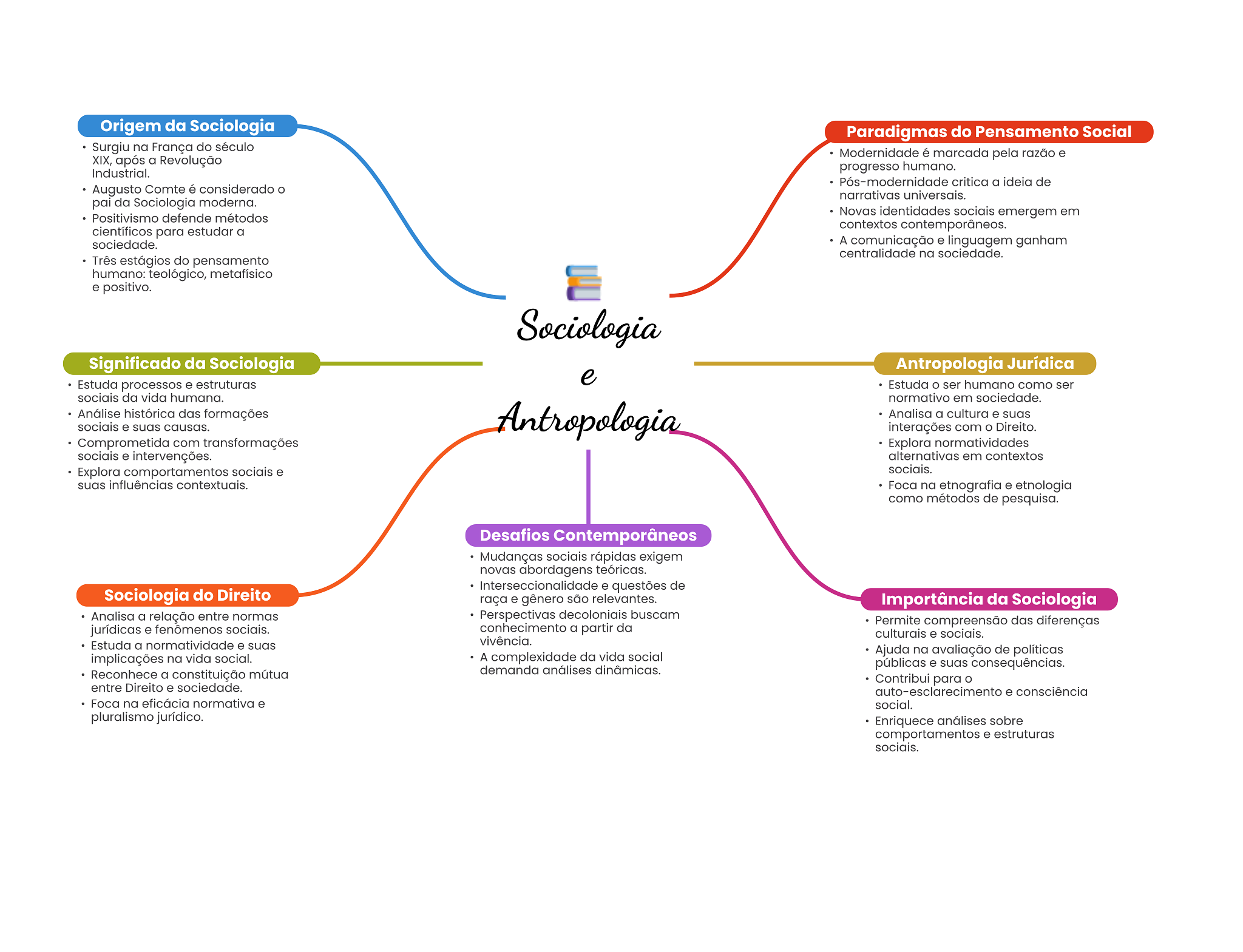 Origem da Sociologia Paradigmas do Pensamento Social Surgiu na França do século Modernidade é marcada pela razão e XIX, após a Revolução Industrial. progresso humano. Pós-modernidade critica a ideia de Augusto Comte é considerado narrativas universais. pai da Sociologia moderna. Positivismo defende métodos Novas identidades sociais emergem em científicos para estudar a contextos contemporâneos. sociedade. A comunicação e linguagem ganham centralidade na sociedade. Três estágios do pensamento humano: teológico, metafísico e positivo. Sociologia Significado da Sociologia Antropologia Jurídica e Estuda processos e estruturas Estuda ser humano como ser sociais da vida humana. normativo em sociedade. Análise histórica das formações sociais e suas causas. Antropologia Analisa a cultura e suas interações com O Direito. Comprometida com transformações Explora normatividades sociais e intervenções. alternativas em contextos Explora comportamentos sociais e sociais. suas influências contextuais. Foca na etnografia e etnologia como métodos de pesquisa. Desafios Contemporâneos Mudanças sociais rápidas exigem novas abordagens teóricas. Interseccionalidade e questões de Sociologia do Direito raça e gênero são relevantes. Importância da Sociologia Analisa a relação entre normas Perspectivas decoloniais buscam Permite compreensão das diferenças jurídicas e fenômenos sociais. conhecimento a partir da culturais e sociais. Estuda a normatividade e suas vivência. Ajuda na avaliação de políticas implicações na vida social. A complexidade da vida social demanda análises dinâmicas. públicas e suas consequências. Reconhece a constituição mútua Contribui para entre Direito e sociedade. auto-esclarecimento e consciência Foca na eficácia normativa e social. pluralismo jurídico. Enriquece análises sobre comportamentos e estruturas sociais.