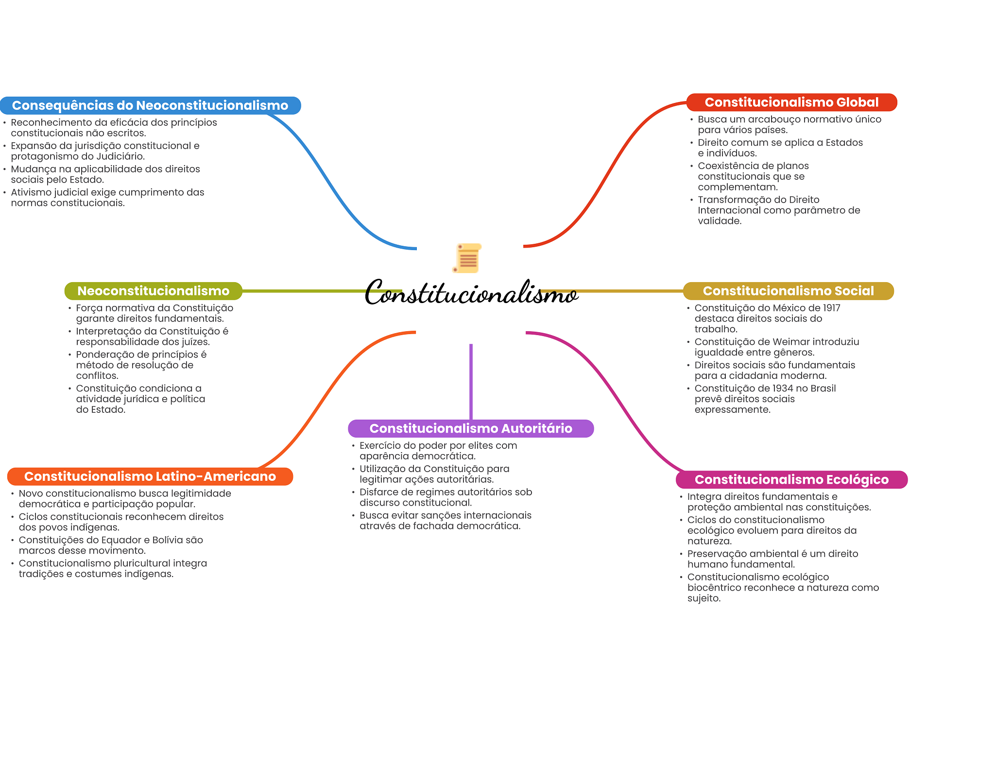 Consequências do Neoconstitucionalismo Constitucionalismo Global Reconhecimento da eficácia dos princípios Busca um arcabouço normativo único constitucionais não escritos. para vários países. Expansão da jurisdição constitucional e Direito comum se aplica a Estados protagonismo do Judiciário. e indivíduos. Mudança na aplicabilidade dos direitos Coexistência de planos sociais pelo Estado. constitucionais que se Ativismo judicial exige cumprimento das complementam. normas constitucionais. Transformação do Direito Internacional como parâmetro de validade. Neoconstitucionalismo Constitucionalismo Constitucionalismo Social Força normativa da Constituição Constituição do México de 1917 garante direitos fundamentais. destaca direitos sociais do Interpretação da Constituição é trabalho. responsabilidade dos juízes. Constituição de Weimar introduziu Ponderação de princípios é igualdade entre gêneros. método de resolução de Direitos sociais são fundamentais conflitos. para a cidadania moderna. Constituição condiciona a Constituição de 1934 no Brasil atividade jurídica e política prevê direitos sociais do Estado. expressamente. Constitucionalismo Autoritário Exercício do poder por elites com aparência democrática. Utilização da Constituição para Constitucionalismo Latino-Americano legitimar ações autoritárias. Constitucionalismo Ecológico Novo constitucionalismo busca legitimidade Disfarce de regimes autoritários sob Integra direitos fundamentais e democrática e participação popular. discurso constitucional. proteção ambiental nas constituições. Ciclos constitucionais reconhecem direitos Busca evitar sanções internacionais Ciclos do constitucionalismo dos povos indígenas. através de fachada democrática. ecológico evoluem para direitos da Constituições do Equador e Bolívia são natureza. marcos desse movimento. Preservação ambiental é um direito Constitucionalismo pluricultural integra humano fundamental. tradições e costumes indígenas. Constitucionalismo ecológico biocêntrico reconhece a natureza como sujeito.