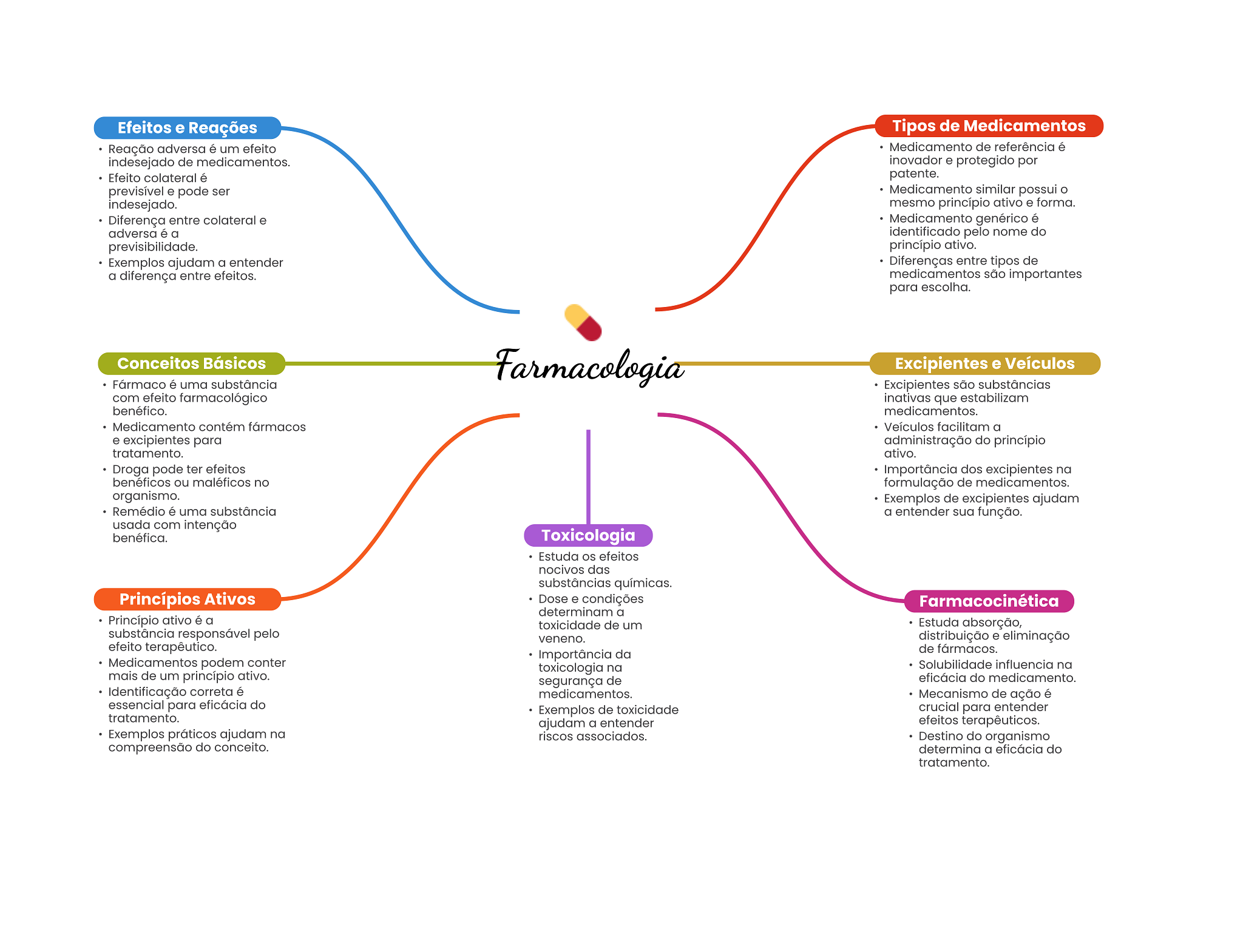 Efeitos e Reações Tipos de Medicamentos Reação adversa é um efeito Medicamento de referência é indesejado de medicamentos. inovador e protegido por Efeito colateral é patente. previsível e pode ser Medicamento similar possui indesejado. mesmo princípio ativo e forma. Diferença entre colateral e Medicamento genérico é adversa é a identificado pelo nome do previsibilidade. princípio ativo. Exemplos ajudam a entender Diferenças entre tipos de a diferença entre efeitos. medicamentos são importantes para escolha. Conceitos Básicos Farmacologia Excipientes e Veículos Fármaco é uma substância Excipientes são substâncias com efeito farmacológico inativas que estabilizam benéfico. medicamentos. Medicamento contém fármacos Veículos facilitam a e excipientes para administração do princípio tratamento. ativo. Droga pode ter efeitos Importância dos excipientes na benéficos ou maléficos no formulação de medicamentos. organismo. Exemplos de excipientes ajudam Remédio é uma substância a entender sua função. usada com intenção benéfica. Toxicologia Estuda efeitos nocivos das substâncias químicas. Princípios Ativos Dose e condições Farmacocinética determinam a Princípio ativo é a toxicidade de um Estuda absorção, substância responsável pelo veneno. distribuição e eliminação efeito terapêutico. Importância da de fármacos. Medicamentos podem conter toxicologia na Solubilidade influencia na mais de um princípio ativo. segurança de eficácia do medicamento. Identificação correta é medicamentos. Mecanismo de ação é essencial para eficácia do Exemplos de toxicidade crucial para entender tratamento. ajudam a entender efeitos terapêuticos. Exemplos práticos ajudam na riscos associados. Destino do organismo compreensão do conceito. determina a eficácia do tratamento.