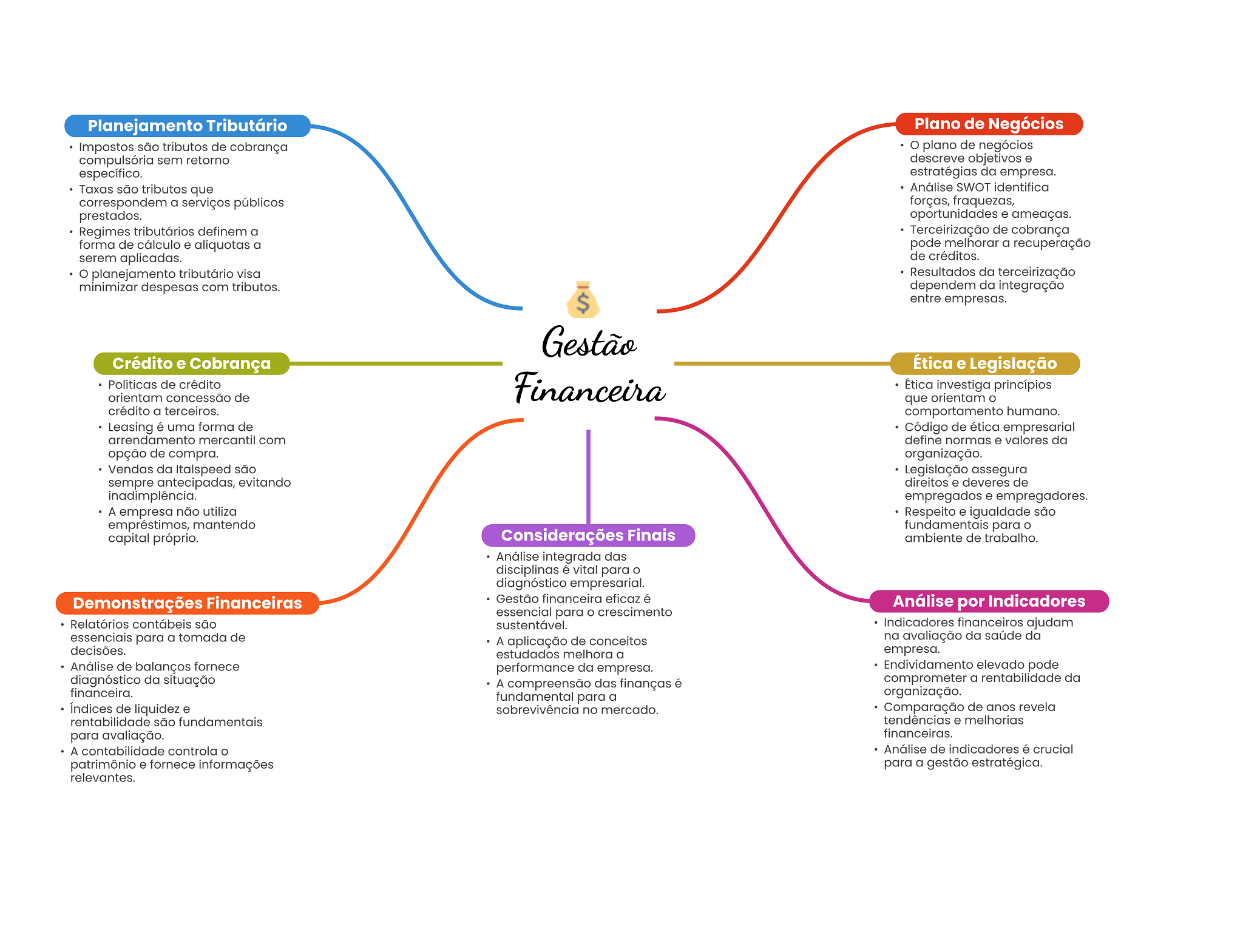 Planejamento Tributário Plano de Negócios Impostos são tributos de cobrança plano de negócios compulsória sem retorno descreve objetivos e específico. estratégias da empresa. Taxas são tributos que Análise SWOT identifica correspondem a serviços públicos forças, fraquezas, prestados. oportunidades e ameaças. Regimes tributários definem a Terceirização de cobrança forma de cálculo e alíquotas a pode melhorar a recuperação serem aplicadas. de créditos. planejamento tributário visa Resultados da terceirização minimizar despesas com tributos. dependem da integração $ entre empresas. Gestão Crédito e Cobrança Ética e Legislação Políticas de crédito orientam concessão de Financeira Ética investiga princípios que orientam crédito a terceiros. comportamento humano. Leasing é uma forma de Código de ética empresarial arrendamento mercantil com define normas e valores da opção de compra. organização. Vendas da Italspeed são Legislação assegura sempre antecipadas, evitando direitos e deveres de inadimplência. empregados e empregadores. A empresa não utiliza Respeito e igualdade são empréstimos, mantendo fundamentais para capital próprio. Considerações Finais ambiente de trabalho. Análise integrada das disciplinas é vital para diagnóstico empresarial. Demonstrações Financeiras Gestão financeira eficaz é Análise por Indicadores essencial para O crescimento Relatórios contábeis são sustentável. Indicadores financeiros ajudam essenciais para a tomada de A aplicação de conceitos na avaliação da saúde da decisões. estudados melhora a empresa. Análise de balanços fornece performance da empresa. Endividamento elevado pode diagnóstico da situação A compreensão das finanças é comprometer a rentabilidade da financeira. fundamental para a organização. Indices de liquidez e sobrevivência no mercado. Comparação de anos revela rentabilidade são fundamentais tendências e melhorias para avaliação. financeiras. A contabilidade controla Análise de indicadores é crucial patrimônio e fornece informações para a gestão estratégica. relevantes.