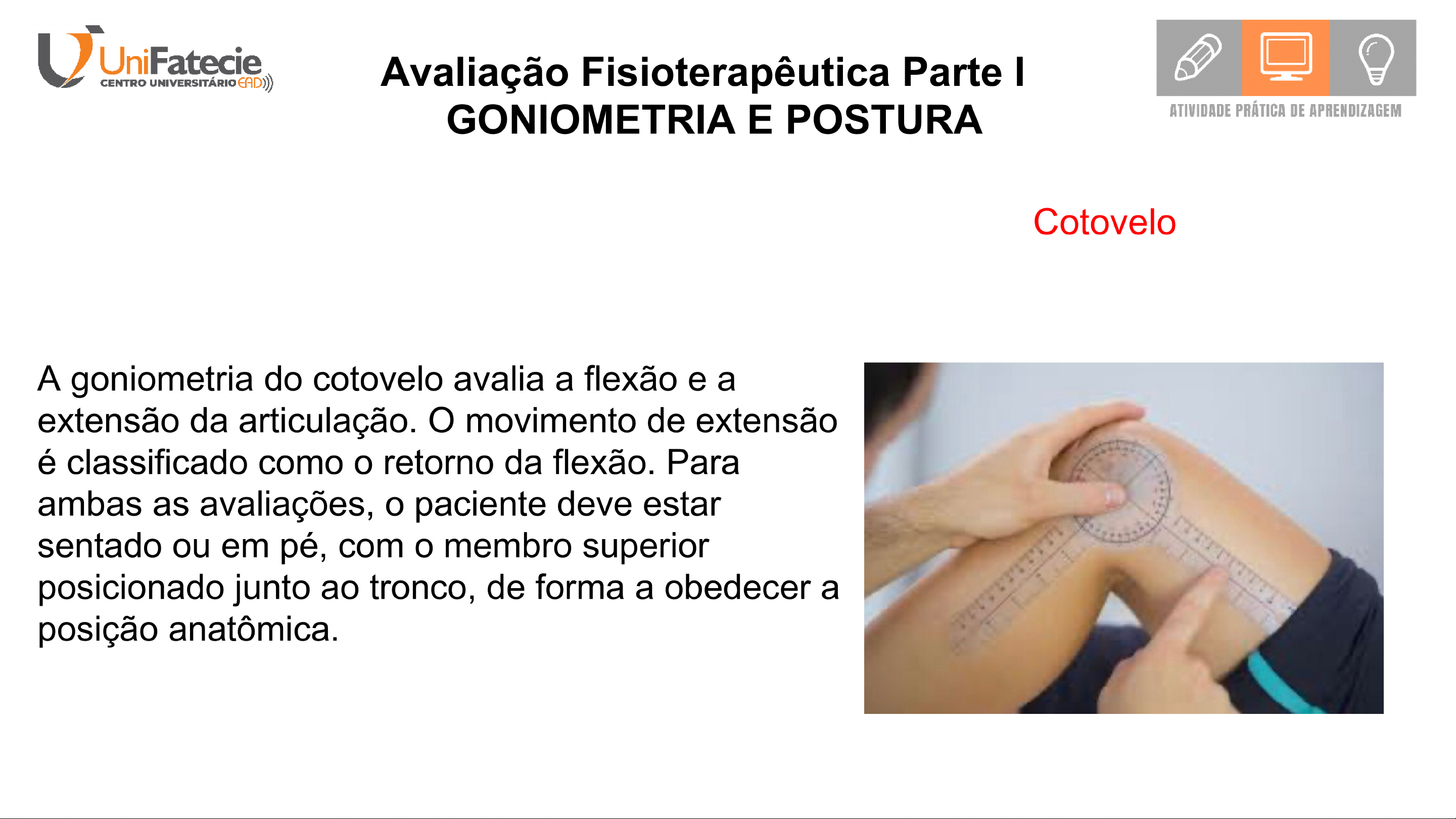 UniFatecie CENTRO UNIVERSITÁRIO Avaliação Fisioterapêutica Parte I GONIOMETRIA E POSTURA ATIVIDADE PRÁTICA DE APRENDIZAGEM Cotovelo A goniometria do cotovelo avalia a flexão e a extensão da articulação. movimento de extensão é classificado como retorno da flexão. Para ambas as avaliações, paciente deve estar sentado ou em pé, com membro superior posicionado junto ao tronco, de forma a obedecer a posição anatômica.Uni atecie CENTRO ATIVIDADE PRÁTICA DE APRENDIZAGEM Por meio da avaliação postural, são 1 2 3 desenvolvidos movimentos e práticas diárias, de acordo com as limitações provenientes dessas alterações, para adequar melhor a postura de cada indivíduo, possibilitando seu posicionamento adequado e uma reestruturação completa das cadeias musculares.Uni Fatecie CENTRO UNIVERSITARIO ATIVIDADE PRÁTICA DE APRENDIZAGEM Músculo Fêmur Músculo Bolsa (recesso) suprapatelar Bolsa Bolsa (recesso) semimembranácea pré-patelar Sacos sinoviais Bolsa infrapatelar Ligamento A Vasto Medial A Biceps Femoral superficial colateral medial B Vasto Medial Obliquo B Trato C Cabeça da Fibula Pelve larga Pelve estreita = Vasto Lateral Bolsa infrapatelar profunda e D = Interlinha Articular Lateral D Ligamento Colateral Lateral Bolsa anserina E= Interlinha Articular Medial E Condilo Femoral Lateral coxim gorduroso F Tendão Patelar G Tendão Quadricipital H Tubérculo Tibial Músculo Tendões dos músculos grácil, Bolsa da Pata de Ganso sartório, semitendinoso (pata J= Cabeça da Fibula gastrocnêmio Anterversão de ganso) femoral Aumento da Menos flexibilidade/ flexibilidade hiperextensão Joelho Torção Torção Tibial Joelho Tibial medial PATELA valgo lateral varo ou neutra A B TENDÃO DA PATELA BORDA DO TUBÉRCULO LATERAL FEMORAL LATERAL DA TÍBIA Tuberosidade EPICÔNDILO FEMORAL LATERAL TIBIAL CÔNDILO TIBIALUni CENTRO Regiões da Coluna Vertebral A coluna vertebral do adulto apresenta quatro curvaturas sagitais: cer- ATIVIDADE PRÁTICA DE APRENDIZAGEM vical, torácica, lombar e sacral. As curvaturas torácica e sacral, conve- xas posteriormente, são denominadas primárias porque apresentam a mesma direção da coluna vertebral fetal e decorrem da diferença de altura entre as partes anteriores e posteriores dos corpos vertebrais. As curvaturas cervical e lombar, côncavas posteriormente, formam- se após nascimento e decorrem da diferença de espessura entre as partes anteriores e posteriores dos discos intervertebrais. Vertebra cervicalis Cervical: constitui esqueleto axial do pescoço e suporte (atlas) da cabeça. Vertebra cervicalis VII 2. Torácica: suporta a cavidade torácica. (vertebra prominem) Vertebra thoracica 3. Lombar: suporta a cavidade abdominal e permite mobi- lidade entre a parte torácica do tronco e a pelve. 4. Sacral: une a coluna vertebral à cintura pélvica. 5. Coccigea: é uma estrutura rudimentar em humanos, mas Foramina Intervertebralis possui função no suporte do assoalho pélvico. Vertebra thoracica XII Vertebra lombalis Desenvolvimento e Ossificação Vertebra lombalis V As vértebras começam a se desenvolver no período em- brionário como condensações mesenquimais em torno do notocórdio. Posteriormente, essas condensações mesenqui- mais se condrificam e a cartilagem assim formada é substi- FIGURA Arranjo anatômico geral da coluna tuída por Ao nascer, as últimas vértebras sacrais e as vertebral. podem ser inteiramente cartilagíneas. Nesse caso, começam a ossificar durante a infância. Centros de ossifi-Sentado Uni Fatecie CENTRO CORACOBRAQUIAL ATIVIDADE PRÁTICA DE APRENDIZAGEM rigem: processo coracoide erção: terço médio da face antero-medial do úmero ão: flexão, rotação medial e adução do ombro Prova de função: flexão de ombro e cotovelo. Contra 1 superficie ântero-medial do terço inferior do úmero, na direção la extensão e da abdução discreta DELTÓIDE a) rigem: terço lateral da clavícula serção: tuberosidade deltoidea ção: flexão de ombro Prova de função: Abdução, pronação, flexão de cotovelo a 90. Contra a superfície ântero-medial do membro superior, na adução e da extensão discreta b) Origem: acromio serção: tuberosidade deltoidea ção: abdução de ombro Prova de pronação. flexão de cotovelo a 90° A ressão contra a superfície dorsal da extremidade distal do úmer se ) cotovelo estiver flexionado, ou contra antebraço se cotovel estiverUni atecie CENTRO ATIVIDADE PRÁTICA DE APRENDIZAGEM os movimentos que ocorrem no plano sagital são extensão e flexão do punho, cotovelo, ombro, cabeça, coluna, quadril, joelho e tornozelo. Desta forma, se pode entender que todos os movimentos de extensão e flexão nas articulações do corpo ocorrem no plano sagital.UniFatecie Avaliação Fisioterapêutica Parte I CENTRO UNIVERSITÁRIO GONIOMETRIA E POSTURA ATIVIDADE PRÁTICA DE APRENDIZAGEM A goniometria é a medição dos ângulos articulares presentes nas articulações humanas. Este manual tem como objetivo, esclarecer e orientar os médicos avaliadores como utilizar goniômetro de forma eficaz, durante exame físico das vítimas de acidente de transito com direito a cobertura do seguro DPVAT.UniFatecie CENTRO UNIVERSITÁRIO ATIVIDADE PRÁTICA DE APRENDIZAGEM Conclusões: A Cinesiologia é estudo de várias disciplinas que englobam movimento do corpo humano. Seu objetivo é analisar as forças que agem sobre corpo humano e manipular tais forças em procedimentos de tratamento de modo que desempenho humano possa ser melhorado e que uma lesão adicional possa ser prevenida. A importância do conhecimento da Cinesiologia clinica para profissional da Fisioterapia pode ser descrito em três itens: a) Conhecer os movimentos do corpo humano. b) Identificar e analisar os movimentos da coluna vertebral, dos membros inferiores e superiores nas cadeias de movimento.Uni atecie Avaliação Fisioterapêutica Parte CENTRO PROVAS DE FUNÇÃO MUSCULAR ATIVIDADE PRÁTICA DE APRENDIZAGEM A prova