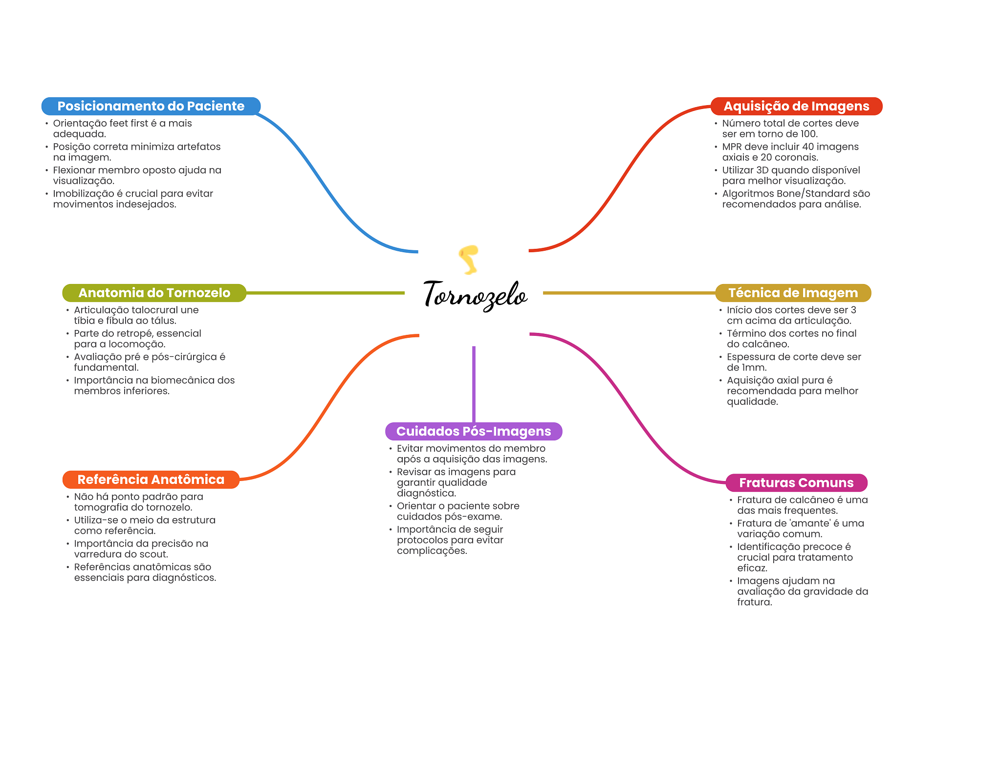 Posicionamento do Paciente Aquisição de Imagens Orientação feet first é a mais Número total de cortes deve adequada. ser em torno de 100. Posição correta minimiza artefatos MPR deve incluir 40 imagens na imagem. axiais e 20 coronais. Flexionar membro oposto ajuda na Utilizar 3D quando disponível visualização. para melhor visualização. Imobilização é crucial para evitar Algoritmos Bone/Standard são movimentos indesejados. recomendados para análise. Anatomia do Tornozelo Tornozelo Técnica de Imagem Articulação talocrural une Início dos cortes deve ser 3 tíbia e fíbula ao tálus. cm acima da articulação. Parte do retropé, essencial Término dos cortes no final para a locomoção. do calcâneo. Avaliação pré e pós-cirúrgica é Espessura de corte deve ser fundamental. de Importância na biomecânica dos Aquisição axial pura é membros inferiores. recomendada para melhor qualidade. Cuidados Pós-Imagens Evitar movimentos do membro após a aquisição das imagens. Revisar as imagens para Referência Anatômica garantir qualidade Fraturas Comuns Não há ponto padrão para diagnóstica. Fratura de calcâneo é uma tomografia do tornozelo. Orientar paciente sobre das mais frequentes. Utiliza-se meio da estrutura cuidados pós-exame. Fratura de 'amante' é uma como referência. Importância de seguir variação comum. Importância da precisão na protocolos para evitar complicações. Identificação precoce é varredura do scout. crucial para tratamento Referências anatômicas são eficaz. essenciais para diagnósticos. Imagens na avaliação da gravidade da fratura.