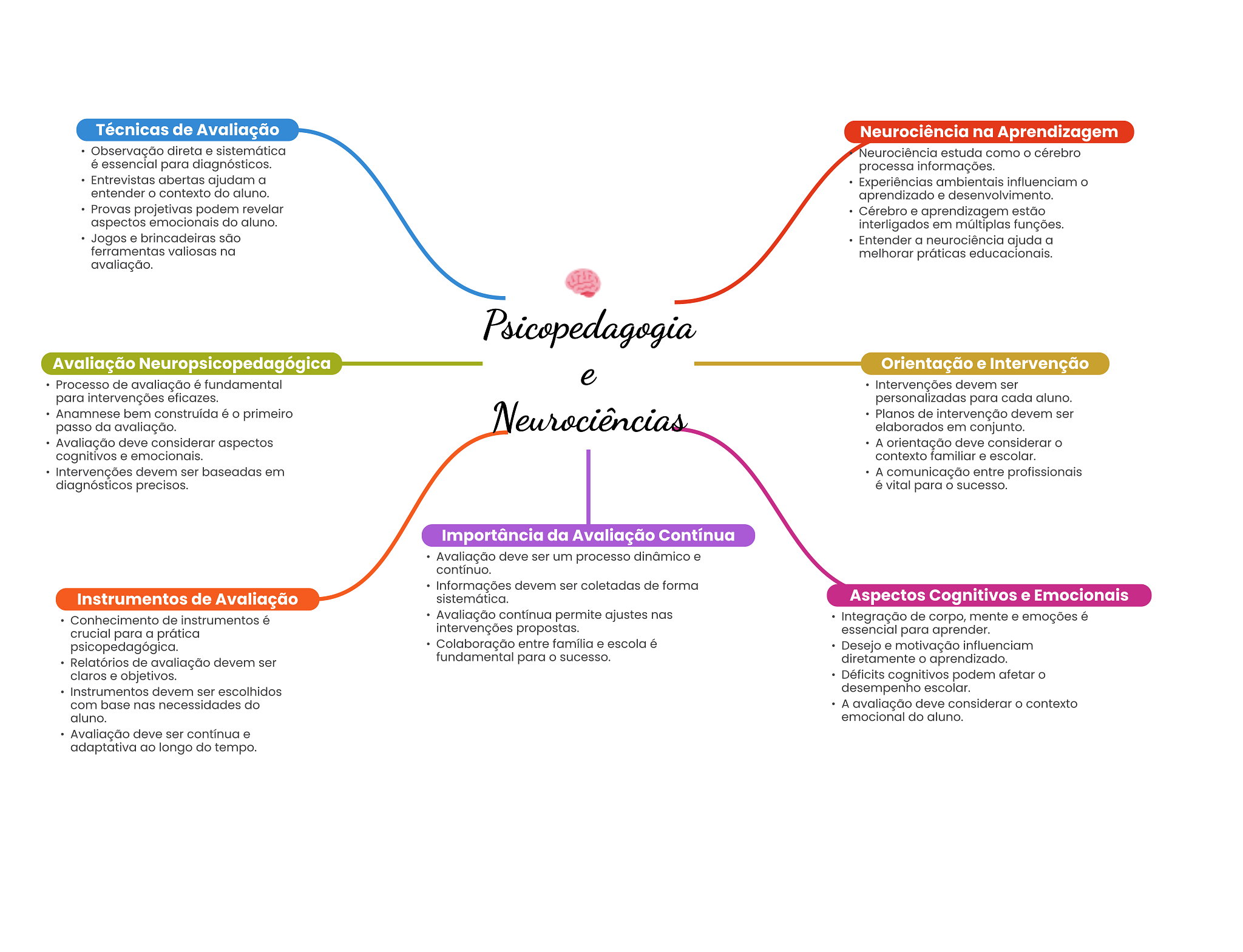 Técnicas de Avaliação Neurociência na Aprendizagem Observação direta e sistemática Neurociência estuda como cérebro é essencial para diagnósticos. processa informações. Entrevistas abertas ajudam a Experiências ambientais influenciam o entender contexto do aluno. aprendizado e desenvolvimento. Provas projetivas podem revelar Cérebro e aprendizagem estão aspectos emocionais do aluno. interligados em múltiplas funções. Jogos e brincadeiras são Entender a neurociência ajuda a ferramentas valiosas na melhorar práticas educacionais. avaliação. Psicopedagogia Avaliação Neuropsicopedagógica Orientação e Intervenção Processo de avaliação é fundamental e Intervenções devem ser para intervenções eficazes. personalizadas para cada aluno. Anamnese bem construída é primeiro Neurociências Planos de intervenção devem ser passo da avaliação. elaborados em conjunto. Avaliação deve considerar aspectos A orientação deve considerar cognitivos e emocionais. contexto familiar e escolar. Intervenções devem ser baseadas em A comunicação entre profissionais diagnósticos precisos. é vital para sucesso. Importância da Avaliação Contínua Avaliação deve ser um processo dinâmico e contínuo. Informações devem ser coletadas de forma Instrumentos de Avaliação sistemática. Aspectos Cognitivos e Emocionais Conhecimento de instrumentos é Avaliação contínua permite ajustes nas Integração de corpo, mente e emoções é crucial para a prática intervenções propostas. essencial para aprender. psicopedagógica. Colaboração entre família e escola é Desejo e motivação influenciam Relatórios de avaliação devem ser fundamental para sucesso. diretamente O aprendizado. claros e objetivos. Déficits cognitivos podem afetar Instrumentos devem ser escolhidos desempenho escolar. com base nas necessidades do A avaliação deve considerar contexto aluno. emocional do aluno. Avaliação deve ser contínua e adaptativa ao longo do tempo.