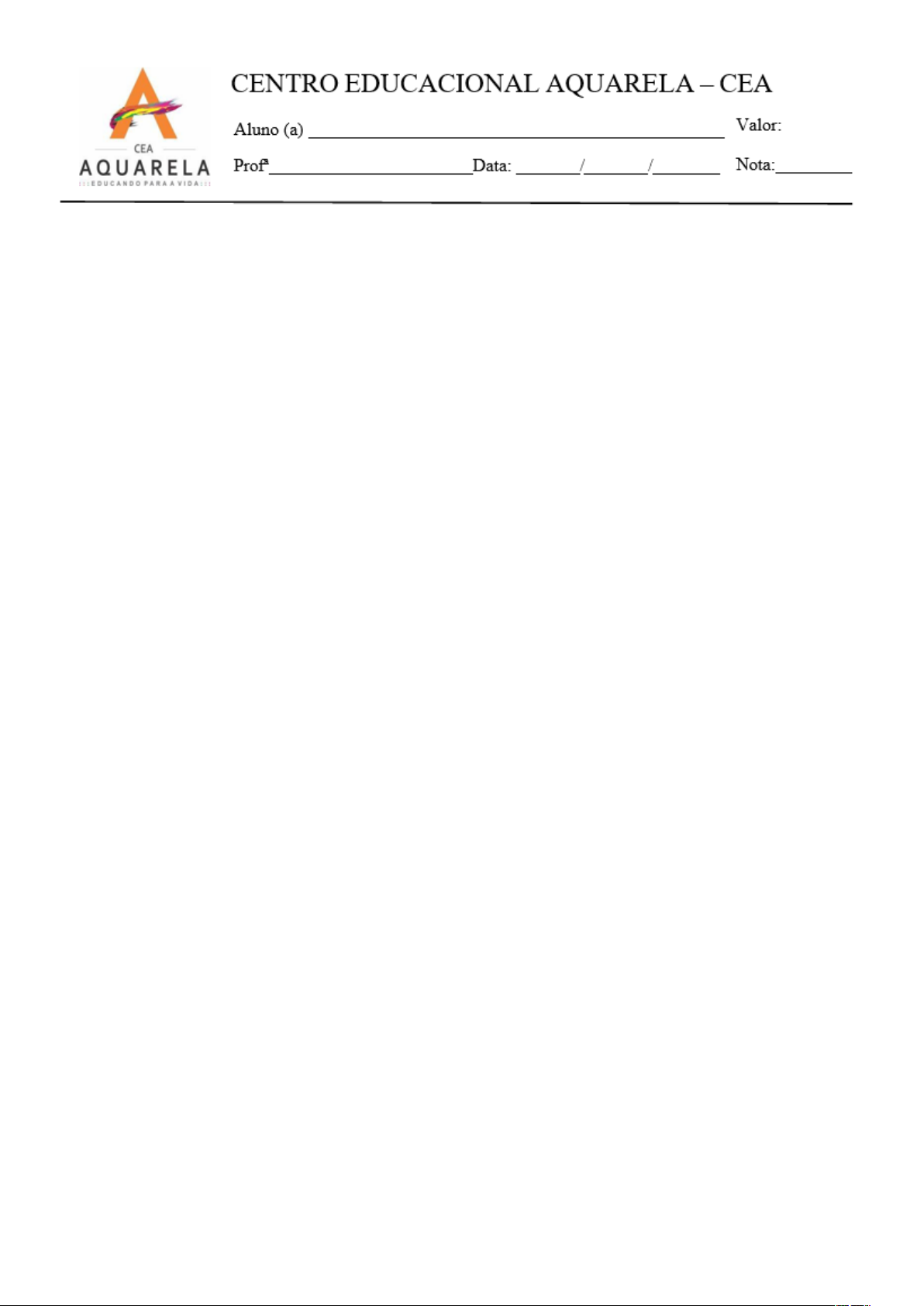 5,00 AVALIAÇÃO DE RECUPERAÇAO DE LÍNGUA PORTUGUESA 1ª TRIMESTRE Questão 01. Leia a frase: "O livro está em cima da mesa." Assinale a alternativa em que a preposição foi identificada corretamente: a) livro – substantivo comum. b) está – verbo de ligação. c) em – preposição. Questão 02. Leia a frase: “Na palestra, o professor se pronunciou acerca dos últimos lançamentos literários.” Assinale a alternativa que NÃO substitui adequadamente a expressão destacada. a) a respeito dos. b) sobre os. c) a propósito dos. d) devido aos. Questão 03. Assinale a alternativa em que a preposição sob foi usada corretamente. a) O gato se escondia sob a cama. b) Gosto de conversar sob séries. c) O cheiro do pernil assado pairava sob toda a cozinha. d) Na família, as notícias sob a herança corriam rapidamente. Questão 04. Preencha as lacunas com as alternativas corretas: I. Ele é especialista _____ comunicação e marketing. II. Comprei a passagem de ônibus _____ 20 reais. III. Estamos _____ 5 km de Manaus. As preposições que preenchem corretamente as lacunas são: a) de, por, há. b) de, a, em. c) em, por, a. d) em, a, desde. e) a, desde, há. Questão 05. Leia a frase: "Pedro foi à escola com a irmã." Assinale a alternativa que em que a preposição foi identificada corretamente: a) Pedro. b) foi. c) à. d) irmã. Leia a tirinha e responda às questões 06 e 07. Questão 06. No trecho: “Ontem, acabou a luz lá em casa!”, as palavras grifadas são classificadas, respectivamente, como: a) tempo e modo. b) lugar e tempo. c) tempo e lugar. d) intensidade e lugar. Questão 07. Armandinho, o personagem principal da tirinha, pergunta preocupado: “E agora?!”. A palavra “agora” indica ideia de: a) intensidade. b) tempo. c) modo. d) dúvida. Leia a tirinha e responda às questões 08 e 09. Questão 08. As três palavras utilizadas pelo Zero no segundo balão transmitem ideia de: a) afirmação. b) dúvida. c) modo. d) tempo. Questão 09. No trecho: “Volto já”, a palavra grifada indica ideia de: a) tempo. b) intensidade. c) modo. d) lugar. Questão 10. Na frase: “Pedro leu tanto que acabou decorando o poema.”, a palavra grifada transmite ideia de: a) modo. b) intensidade. c) lugar. d) tempo. image1.png image2.png image3.png