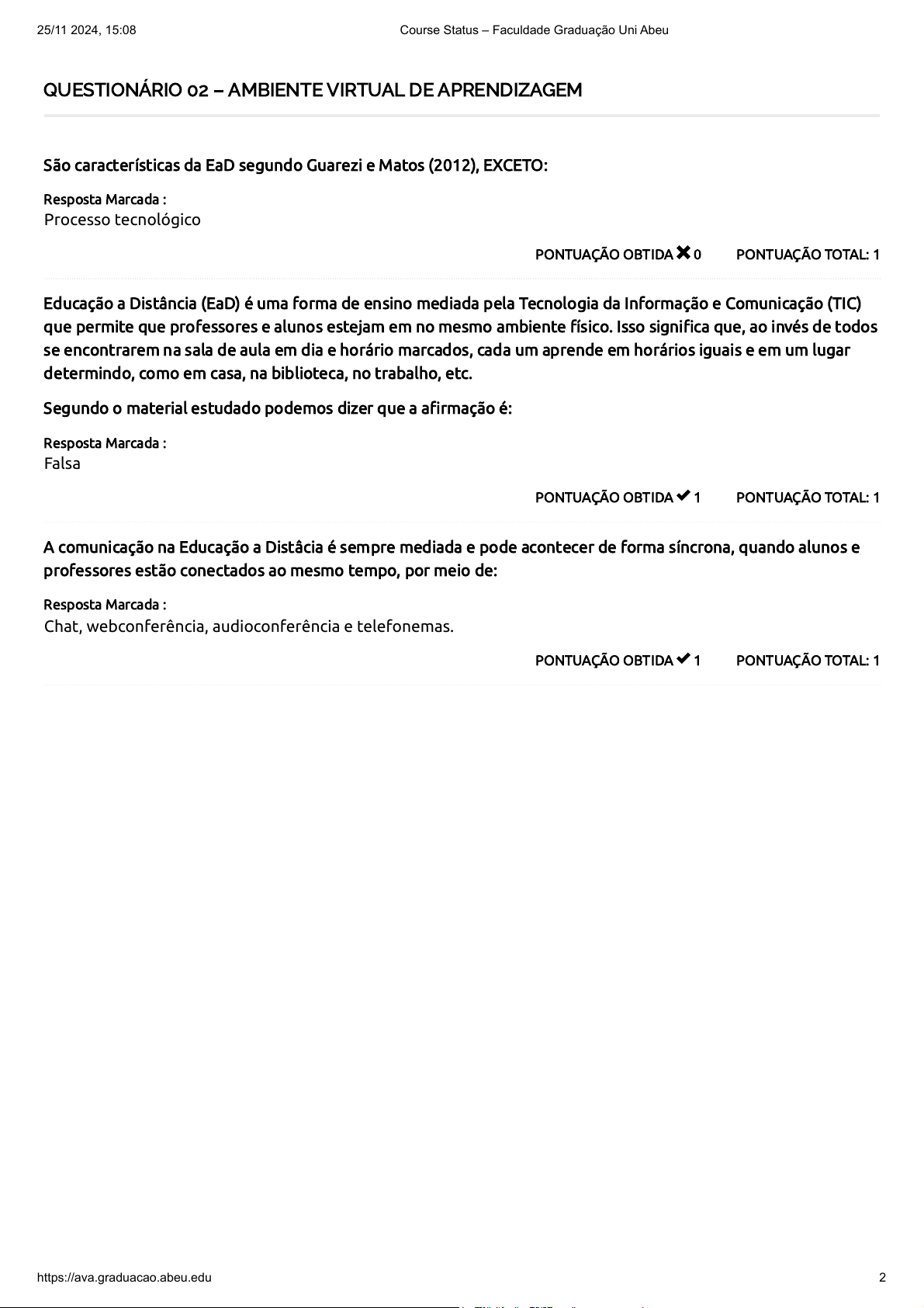 QUESTIONÁRIO 02 – AMBIENTE VIRTUAL DE APRENDIZAGEM PONTUAÇÃO TOTAL: 1PONTUAÇÃO OBTIDA 0 São características da EaD segundo Guarezi e Matos (2012), EXCETO: Resposta Marcada : Processo tecnológico PONTUAÇÃO TOTAL: 1PONTUAÇÃO OBTIDA 1 Educação a Distância (EaD) é uma forma de ensino mediada pela Tecnologia da Informação e Comunicação (TIC) que permite que professores e alunos estejam em no mesmo ambiente físico. Isso signi�ca que, ao invés de todos se encontrarem na sala de aula em dia e horário marcados, cada um aprende em horários iguais e em um lugar determindo, como em casa, na biblioteca, no trabalho, etc. Segundo o material estudado podemos dizer que a a�rmação é: Resposta Marcada : Falsa PONTUAÇÃO TOTAL: 1PONTUAÇÃO OBTIDA 1 A comunicação na Educação a Distâcia é sempre mediada e pode acontecer de forma síncrona, quando alunos e professores estão conectados ao mesmo tempo, por meio de: Resposta Marcada : Chat, webconferência, audioconferência e telefonemas. 25/11/2024, 15:08 Course Status – Faculdade Graduação Uni Abeu https://ava.graduacao.abeu.edu.br/course-status/ 1/2 4 / 5 PONTUAÇÃO TOTAL: 1PONTUAÇÃO OBTIDA 1 Sobre a modalidade de Educação a Distância no Brasil, julgue as a�rmações a seguir. I- O surgimento da EaD no Brasil tem uma trajetória histórica ampla, mas a de�nição da origem é um tema polêmico, pois nem sempre os estudiosos concordam em todos os pontos. II- No Brasil, a base legal do modelo de Educação a Distância é determinada pela Lei 9.394/1996, Lei de Diretrizes e Bases da Educação Nacional – LDB, cujo nome já indica que são estabelecidas as diretrizes e fundamentos da educação nacional.. III- Segundo Maia e Matar (2007), a EaD é um modelo de educação em que professores e alunos são unidos, planejados pela instituição, e utilizam limitados tecnologias de comunicação. IV- A EaD pressupõe uma combinação de tecnologias tradicionais e modernas que permitem que o aprendizado individual ou em grupo seja combinado com atividades presenciais especí�cas, como sessões de aprendizado em grupo e avaliações, seja no local de trabalho ou externamente por meio de ensino a distância e métodos de treinamento Resposta Marcada : I, II, e IV estão corretas PONTUAÇÃO TOTAL: 1PONTUAÇÃO OBTIDA 1 Segundo Moore e Kearsley (2007), a EaD evoluiu ao longo da história e pode ser dividida em cinco gerações distintas. Sobre essas gerações enumere a 2ª coluna de acordo com a 1ª coluna. 1- Primeira geração 2- Segunda geração 3- Terceira geração 4- Quarta geração 5- Quinta geração ( ) Ensino via televisão aberta. ( ) Caracterizada pela interação remota em tempo real, em cursos de áudio e videoconferência. ( ) Envolvendo aulas online, virtuais e ensino e aprendizagem em universidades com base no estudo de tecnologias da Internet. ( ) Caracterizada pela comunicação textual via correspondência. ( ) Caracterizada principalmente pela invenção da a Universidade Aberta. Assinale a sequência CORRETA: Resposta Marcada : 2-4-5-1-3 Total de Pontos 25/11/2024, 15:08 Course Status – Faculdade Graduação Uni Abeu https://ava.graduacao.abeu.edu.br/course-status/ 2/2