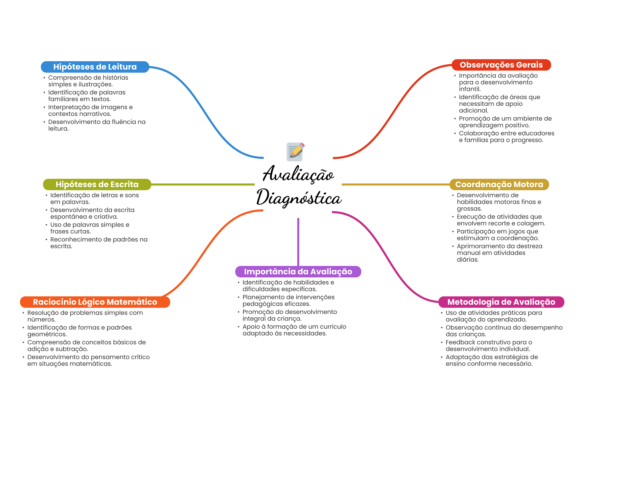 Hipóteses de Leitura Observações Gerais Compreensão de histórias Importância da avaliação simples e ilustrações. para desenvolvimento infantil. Identificação de palavras familiares em textos. Identificação de áreas que Interpretação de imagens e necessitam de apoio adicional. contextos narrativos. Desenvolvimento da fluência na Promoção de um ambiente de leitura. aprendizagem positivo. Colaboração entre educadores e famílias para progresso. Avaliação Hipóteses de Escrita Coordenação Motora Identificação de letras e sons em palavras. Diagnóstica Desenvolvimento de habilidades motoras finas e Desenvolvimento da escrita grossas. espontânea e criativa. Execução de atividades que Uso de palavras simples e envolvem recorte e colagem. frases curtas. Participação em jogos que Reconhecimento de padrões na estimulam a coordenação. escrita. Aprimoramento da destreza manual em atividades diárias. Importância da Avaliação Identificação de habilidades e dificuldades específicas. Planejamento de intervenções Raciocínio Lógico Matemático pedagógicas eficazes. Metodologia de Avaliação Resolução de problemas simples com Promoção do desenvolvimento Uso de atividades práticas para números. integral da criança. avaliação do aprendizado. Identificação de formas e padrões Apoio à formação de um currículo Observação contínua do desempenho geométricos. adaptado às necessidades. das crianças. Compreensão de conceitos básicos de Feedback construtivo para O adição e subtração. desenvolvimento individual. Desenvolvimento do pensamento crítico Adaptação das estratégias de em situações matemáticas. ensino conforme necessário.