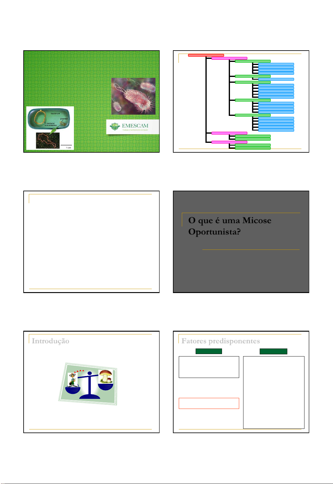 1 MICOSES OPORTUNISTAS MICOLOGIA MÉDICA Prof. Rodrigo Moraes DOENÇAS FÚNGICAS MICOSES ALERGIA INTOXICAÇÕES SUPERFICIAIS CUTÂNEAS SUBCUTÂNEAS SISTÊMICAS OPORTUNISTAS HIPERSENSIBILIDADE MICEDES OU IDES MICETISMOS MICOTOXICOSE PITIRÍASE VERSICOLOR TÍNEA NIGRA(PALMARIS) PIEDRA NEGRA PIEDRA BRANCA DERMATOFITOSE ESPOROTRICOSE CROMOBLASTOMICOSE FEOHIFOMICOSE MICETOMA EUMICÓTICO LOBOMICOSE PARACOCCIDIOIDOMICOSE HISTOPLASMOSE COCCIDIOIDOMICOSE BLASTOMICOSE CANDIDOSE CRIPTOCOCOSE ASPERGILOSE MUCORMICOSE PPC "George é um paciente de 45 anos que se submeteu a transplante alogênico de células-tronco como parte de seu tratamento de leucemia aguda. O transplante foi bem-sucedido e, após o enxerto, George recebeu alta do hospital. Durante o curso de seu transplante, os médicos fizeram profilaxia antifúngica com voriconazol, devido às preocupações com aspergilose, que tem sido um problema no hospital nos últimos anos. Após receber alta, George reagiu bem e sua profilaxia antifúngica continuou; contudo, durante uma consulta, 140 dias após o transplante, foram observados exantema e elevados resultados no estudo das funções hepáticas. Cerca de 1 semana depois, ele apresentou diarreia sanguinolenta, e seu médico ficou preocupado com a doença do enxerto versus hospedeiro (GVHD, graft-versus-host disease). Realizou-se biópsia retal, confirmando GVHD, e o regime de imunossupressão de George foi aumentado, assim como sua dose diária de voriconazol. Os sinais e sintomas de GVHD continuaram, e eventualmente ele foi novamente hospitalizado com febre, confusão e falta de ar. A radiografia do tórax mostrou infiltrado cuneiforme no campo pulmonar inferior direito, e as investigações dos seios mostraram opacificação. O que é uma Micose Oportunista? Introdução DEFESAS NATURAIS FATORES PREDISPONENTES Fatores predisponentes FISIOLÓGICOS Aumento da prematuridade e longevidade MEDICAMENTOS Antineoplásicos, antibioticoterapia, corticosteróides INTERVENÇÕES Instrumentos médicos invasivos, transplantes de MO e órgãos sólidos AGENTES FÍSICOS AMBIENTE HOSPITALAR Expansão da população em UTIs INTRÍNSECOS EXTRÍNSECOS PATOLÓGICOS AIDS & Micoses oportunistas http://images.google.com.br/imgres?imgurl=http://www.guiaitabuna.com.br/novovisual/boneco.jpg&imgrefurl=http://www.guiaitabuna.com.br/novovisual/&h=245&w=150&sz=6&tbnid=zzbVaHz5_WSYwM:&tbnh=105&tbnw=64&hl=pt-BR&start=8&prev=/images%3Fq%3Dboneco%26svnum%3D10%26hl%3Dpt-BR%26lr%3D http://images.google.com.br/imgres?imgurl=http://upload.wikimedia.org/wikipedia/commons/thumb/f/f7/Karl_Johanssvamp,_Iduns_kokbok.jpg/200px-Karl_Johanssvamp,_Iduns_kokbok.jpg&imgrefurl=http://pt.wikipedia.org/wiki/Cogumelo&h=219&w=200&sz=12&tbnid=a4NFLFY1YxYYjM:&tbnh=102&tbnw=93&hl=pt-BR&start=41&prev=/images%3Fq%3Dcogumelo%26start%3D40%26svnum%3D10%26hl%3Dpt-BR%26lr%3D%26sa%3DN 2 Principais fungos oportunistas FUNGOS OPORTUNISTAS FILAMENTOSOS LEVEDURAS Aspergillus spp. Fusarium spp. Scedosporium spp. Mucorales Dematiaceos Candida spp. Cryptococcus spp. Trichosporon spp. Malassezia spp. Rodotorula spp. Saccharomyces, etc DIMÓRFICOS Histoplasma spp. Coccidioides spp. Pneumocystis jirovecii Principais fungos causadores de micoses oportunistas Candidíase http://www.medizin-forum.de/prostatitis/candida.jpg Candidíase - Introdução ◼ A candidíase é a infecção fúngica oportunista mais comum ◼ Mais de 150 espécies → cerca de 20 patogênicas ◼ Espécies: Candida albicans (60%), C. tropicalis, C. glabrata, C. parapsilosis, C. krusei, C. lusitaniae, C. guilliermondii e C. dubliniensis. ◼ Habitat No ambiente: folhas, flores, água e solo. No homem: membro da microbiota normal da pele, boca, vagina e intestino; mucosas. Formas clínicas Formas leves: ◼ Oral do recém nascido; ◼ Sistema genito-urinário; ◼ Ungueal e periungueal; ◼ Cárie; ◼ Intestinal; Formas graves e disseminadas: ◼ CMCC (Candidíase Muco-Cutânea Crônica); ◼ Sistema respiratório – pneumonia; ◼ Sistema cardiovascular – endocardites. http://www.mycology.adelaide.edu.au/gallery Formas Clínicas http://www.medizin-forum.de/prostatitis/candida.jpg 3 Formas Clínicas ◼ Candidíase cutânea Áreas de dobras → placas eritematosas e lesões satélites ◼ Paroníquia e onicomicose Irritação dos tecidos periungueais → distrofia ou hipertrofia das dobras ungueais ◼ Candidíase oral Lesão pseudomembranosa esbranquiçada Formas Clínicas ◼ Candidíase vaginal •Irritação, prurido e corrimento vaginal esbranquiçado •Grávidas, diabéticas, alterações hormonais, antibioticoterapia prolongada (alteração da microbiota normal) ◼ Candidíase sistêmica Candidemia Neonatos, transplantados, neoplasias, queimados, nutrição parenteral, cateteres de demora, antibioticoterapia... Diagnóstico ◼ Fontes de amostra Líquor, escarro, pele, unha, subcutâneo, vaginal, urina, sangue etc. ◼ Coleta / Transporte Rotular, esterilidade, rapidez, uso de medicamentos? ◼ Diagnóstico laboratorial Exame direto → colorações/microscopia Cultura → colorações, provas de identificação etc. http://www.mycology.adelaide.edu.au/gallery Sidrim & Rocha, 2004 Tratamento FORMAS LEVES - Correção das condições subjacentes; - Antimicótico tópico (iodo, nistatina) ou oral (fluconazol) FORMAS GRAVES - Correção das condições subjacentes; - Anfotericina B (antimicótico sistêmico, uso venoso ou intrarraquidiano) - Imidazólicos (uso oral) - Candicidina (Acetato de caspofungina) http://www.mycology.adelaide.edu.au/gallery