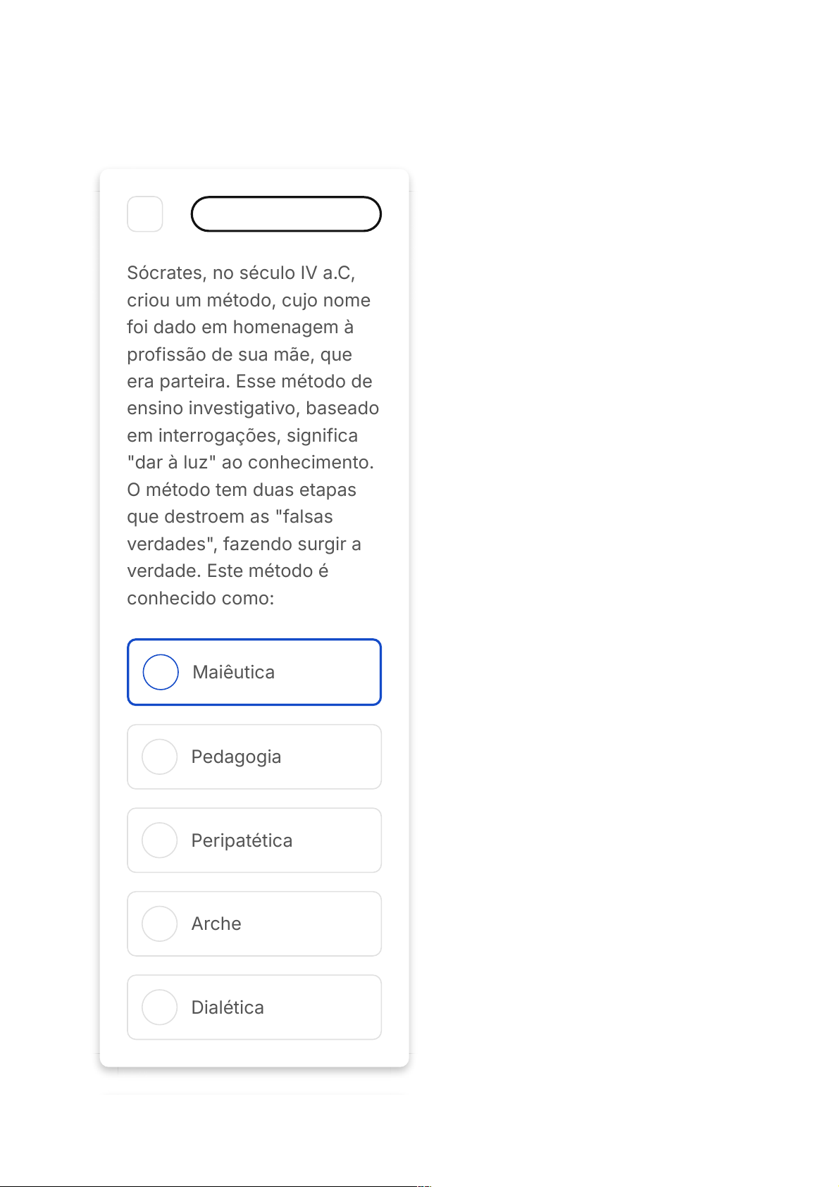 19/02/2026, 21:35 Página 1 de 12https://estacio.saladeavaliacoes.com.br/prova/6997a99313a5854c07299655/ A B C D E 1 Marcar para revisão Sócrates, no século IV a.C, criou um método, cujo nome foi dado em homenagem à profissão de sua mãe, que era parteira. Esse método de ensino investigativo, baseado em interrogações, significa "dar à luz" ao conhecimento. O método tem duas etapas que destroem as "falsas verdades", fazendo surgir a verdade. Este método é conhecido como: Maiêutica Pedagogia Peripatética Arche Dialética 19/02/2026, 21:35 Página 2 de 12https://estacio.saladeavaliacoes.com.br/prova/6997a99313a5854c07299655/ A B C D E 2 Marcar para revisão A tradição educacional romana está pautada no papel do cidadão. O princípio da cidadania romana, ainda que seja influenciado pelos gregos, assume outras nuances. São características da Educação Romana: Tales de Mileto Epicuro Kant Descartes Cícero 3 Marcar para revisão Os gregos tratavam a educação como um processo de preparação para a vida social. O homem é visto como um ser racional, o 00 hora : 39 min : 12 seg Ocultar Questão 3 de 10 Respondidas (6) Em branco (4) Finalizar prova 1 2 3 4 5 6 7 8 9 10 SM1 História Da Educação 19/02/2026, 21:35 Página 3 de 12https://estacio.saladeavaliacoes.com.br/prova/6997a99313a5854c07299655/ A B C centro do universo. Entendiam-na como a formação de seu espírito e de sua alma. A educação nas artes, assim como a intelectual era fundamental para gerar esse homem. A explicação que melhor define a educação é: Arché - para dividir as artes humanas em manuais, feitas por qualquer um , e a filosofia feita pelos cidadãos. Phisis - para definir os tipos de conhecimentos práticos e as linhas das escolas filosóficas estrturadas. Apatheia - negação da Paideia, que seria o sentido mitológico da formação do homem grego, com o prefixo a indicando a negação. 19/02/2026, 21:35 Página 4 de 12https://estacio.saladeavaliacoes.com.br/prova/6997a99313a5854c07299655/ D E Phronesis - continuidade do princípio da educação básica, estruturada a partir das cidades estado. Paidéia - no sentido de formação do Homem grego, seus deveres, afazeres, responsabilidades. 4 Marcar para revisão É preciso conhecer as formas, a verdade e a razão de tudo o que existe no mundo sensível. Tudo o que nasce e desaparece não pode ser considerado o ser de maneira plena. Neste mundo, tudo é instável, pois se transforma com o tempo. A verdade é o lugar para onde devemos retornar, pois viemos dela, das formas inteligíveis e das essências. Estas asserções referem-se a qual modelo alegórico proposto por Platão? 19/02/2026, 21:35 Página 5 de 12https://estacio.saladeavaliacoes.com.br/prova/6997a99313a5854c07299655/ A B C D E A B A República A maiêutica A Paidéia O mito da Caverna O contrato Social 5 Marcar para revisão As denominadas sete artes liberais, que formavam a base do sistema escolar no período medieval na Europa Ocidental, abrangiam duas séries. Eram elas: Sistema de Anselmo de Cantuária e de Isidoro de Sevilha. Alcorão e Sistema de Tomás de Aquino. 19/02/2026, 21:35 Página 6 de 12https://estacio.saladeavaliacoes.com.br/prova/6997a99313a5854c07299655/ C D E A B O Trivium e a Bula Parens Scientiarum. O Trivium e o Quadrivium. O Trivium e o doutorado em Teologia. 6 Marcar para revisão Durante a Idade Média, existiram dois movimentos/modelos intelectuais centrais. Um que era influenciado pelos pais da igreja e outro que aparece ao lado dos movimentos urbanos e as novas técnicas educacionais trazidas pelos árabes. Como chamamos esses dois modelos? Neoplatonismo e Neoaristotelismo Neoplatonismo e Neosocratismo 19/02/2026, 21:35 Página 7 de 12https://estacio.saladeavaliacoes.com.br/prova/6997a99313a5854c07299655/ C D E A B C Neosocratismo e Neoaristotelismo Neoarquimediano e Neoaristotelismo Neosocratismo e Neoarquimediano 7 Marcar para revisão Não existia um currículo unificado para o ensino formal durante a Idade Média. De maneira geral, os estudos restringiam-se ao Trivium e ao Quadrivium. Em alguns casos especiais passava-se ao último nível de estudo. Como se chamava esse último ciclo, considerado o saber capital? Teologia Cosmologia Tautologia 19/02/2026, 21:35 Página 8 de 12https://estacio.saladeavaliacoes.com.br/prova/6997a99313a5854c07299655/ D E Quitivium Artes 8 Marcar para revisão O pensamento moderno focou em sistematizar a educação de forma que esta pudesse ser mais produtiva. Com isso diversos autores surgiram propondo suas formas de ensino e aprendizagem. Sobre as propostas de Johann Heinrich Pestalozzi analise as afirmações: I. A pedagogia de Pestalozzi, pode ser definida como a pedagogia do afeto II. Pestalozzi não tinha formação religiosa e era agricultor, por isso entendia as crianças como sementes que precisam de cuidado para florescer. III. Em sua busca de ajudar ao próximo voltou seus esforços para a educação, teorizando formas completas e eficientes de educação. IV. Em sua teoria a escola era comparada a uma casa, que 19/02/2026, 21:35 Página 9 de 12https://estacio.saladeavaliacoes.com.br/prova/6997a99313a5854c07299655/ A B C D E precisa de amor, organização e disciplina para funcionar. É correto o que se afirma em: I e II, apenas. II e III, apenas. III e IV, apenas. I, II e III, apenas. I, III e IV, apenas. 9 Marcar para revisão O empirista inglês John Locke considerava que a Educação possuía um caráter eminentemente moral. Qual das alternativas abaixo explicita essa ideia? 19/02/2026, 21:35 Página 10 de 12https://estacio.saladeavaliacoes.com.br/prova/6997a99313a5854c07299655/ A B C D E A educação deve servir para o aprimoramento do indivíduo, desconsiderando os aspectos científicos, sociais e culturais. A moralidade é o único objetivo da Educação. De nada adianta a um indivíduo dominar os princípios da Ciência se isso não o torna uma pessoa e um cidadão melhor. É preciso educar para for