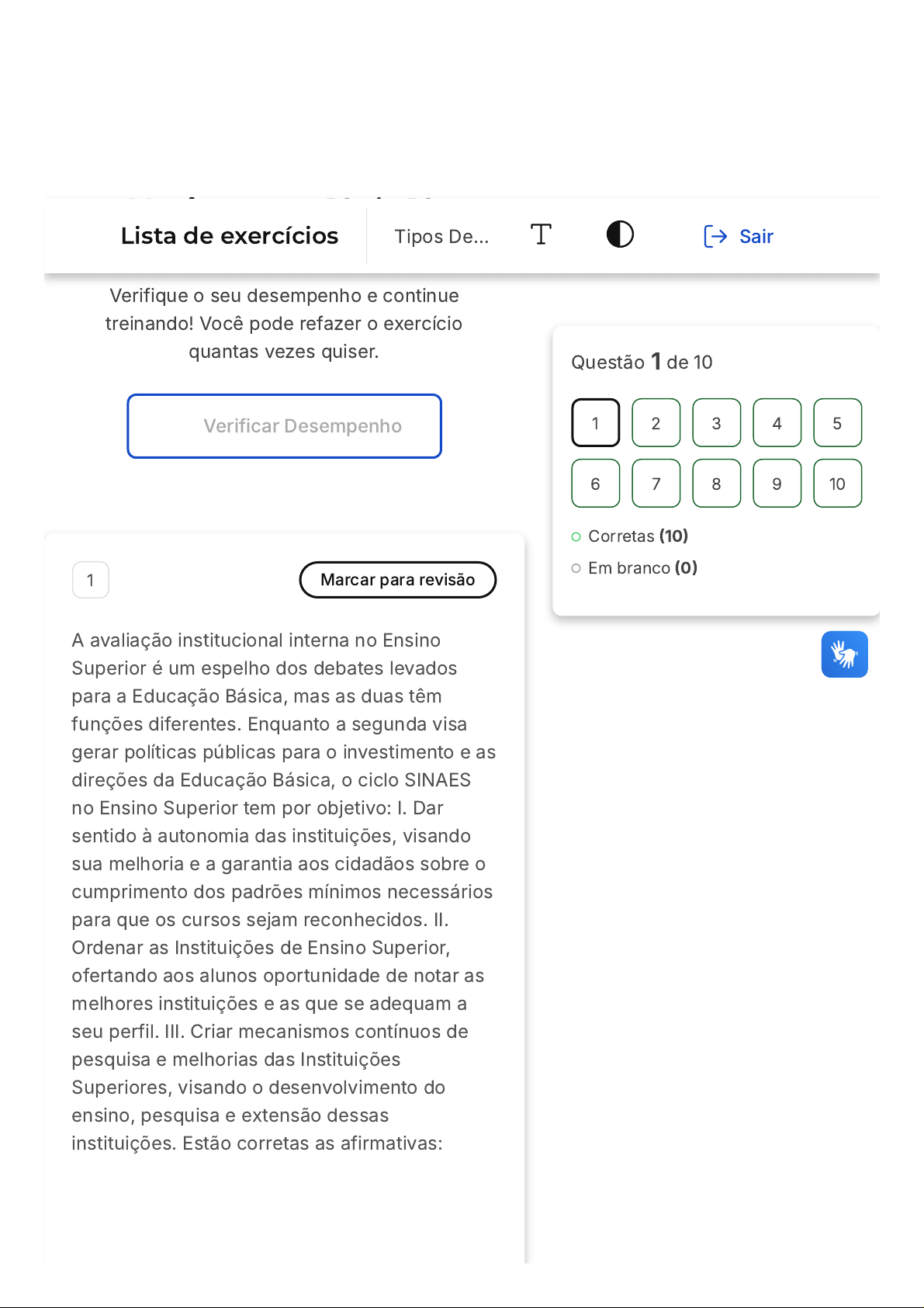 Você acertou 10 de 10 questões Verifique o seu desempenho e continue treinando! Você pode refazer o exercício quantas vezes quiser. Verificar Desempenho 1 Marcar para revisão A avaliação institucional interna no Ensino Superior é um espelho dos debates levados para a Educação Básica, mas as duas têm funções diferentes. Enquanto a segunda visa gerar políticas públicas para o investimento e as direções da Educação Básica, o ciclo SINAES no Ensino Superior tem por objetivo: I. Dar sentido à autonomia das instituições, visando sua melhoria e a garantia aos cidadãos sobre o cumprimento dos padrões mínimos necessários para que os cursos sejam reconhecidos. II. Ordenar as Instituições de Ensino Superior, ofertando aos alunos oportunidade de notar as melhores instituições e as que se adequam a seu perfil. III. Criar mecanismos contínuos de pesquisa e melhorias das Instituições Superiores, visando o desenvolvimento do ensino, pesquisa e extensão dessas instituições. Estão corretas as afirmativas: Questão 1 de 10 Corretas (10) Em branco (0) 1 2 3 4 5 6 7 8 9 10 Lista de exercícios Tipos De… Sair A B C D E I e II. I e III. II e III. Apenas a afirmativa I. Apenas a afirmativa II. Resposta correta Parabéns, você selecionou a alternativa correta. Confira o gabarito comentado! Gabarito Comentado A resposta certa é: I e III. O ciclo SINAES no Ensino Superior tem por objetivo dar sentido à autonomia das instituições, visando sua melhoria e a garantia aos cidadãos sobre o cumprimento dos padrões mínimos necessários para que os cursos sejam reconhecidos. Além disso, o ciclo SINAES tem por objetivo criar mecanismos contínuos de pesquisa e melhorias das Instituições Superiores, visando o desenvolvimento do ensino, pesquisa e extensão dessas instituições. 2 Marcar para revisão A B C D E Sobre a avaliação institucional externa, no que tange à avaliação de desempenho, uma de suas críticas mais ferrenhas é: Que, em vez de propor melhorias, vem dando lugar a julgamentos, desprestígio de instituições, competição entre escolas e entre universidades que distorcem resultados e comprometem a implementação das medidas necessárias à melhoria da qualidade da educação brasileira. Que, em vez de servir à gestão interna, tem servido aos órgãos governamentais de fiscalização. Que, em vez de criar um mecanismo de constante visualização e correção de rumos de investimentos, tem servido de barganha por parte dos Estados, na tentativa de aumentar suas parcelas de FUNDEB. Que, em vez de gerar um ranking claro entre as instituições, a corrupção e o uso de alunos falsos têm gerado números irreais. Que o recurso voltado somente para a nota, sem outros fatores, não resolve a questão. Resposta correta Parabéns, você selecionou a alternativa correta. Confira o gabarito comentado! Gabarito Comentado A resposta certa é: Que, em vez de propor melhorias, vem dando lugar a julgamentos, desprestígio de instituições, competição entre escolas e entre universidades que distorcem resultados e comprometem a implementação das medidas necessárias à melhoria da qualidade da educação brasileira. A avaliação institucional externa, no que tange à avaliação de desempenho, tem sido alvo de críticas, principalmente por não propor melhorias, mas sim julgamentos, desprestígio de instituições, competição entre escolas e entre universidades que distorcem resultados e comprometem a implementação das medidas necessárias à melhoria da qualidade da educação brasileira. 3 Marcar para revisão Avaliações de larga escala de desempenho são mecanismos que visam fomentar processos avaliativos para a Educação Nacional, visando: A B C D E Gerar indicadores que possam ser analisados, comparados e dar base a decisões. Criar um teto de qualidade, apontando que instituições podem ou não continuar, protegendo os brasileiros. Criar um mecanismo de medição e comparação dos estudantes do Brasil e do exterior. Gerar um processo de transformação contínua da educação pelo estudo das fragilidades dos alunos. Criar um mecanismo de fiscalização eficiente das escolas, criando formas de melhoria. Resposta correta Parabéns, você selecionou a alternativa correta. Confira o gabarito comentado! Gabarito Comentado O objetivo das avaliações de larga escala de desempenho é gerar indicadores que possam ser analisados, comparados e que sirvam de base para tomadas de decisões. Essas avaliações são ferramentas importantes para identificar pontos de melhoria, estabelecer metas e direcionar políticas educacionais. Portanto, a alternativa correta é: "Gerar indicadores A B C D E que possam ser analisados, comparados e dar base a decisões". 4 Marcar para revisão As etapas do processo de avaliação institucional são: Preparação - Planejamento - Desenvolvimento - Implementação - Consolidação. Planejamento - Execução - Análise - Diagnóstico. Preparação - Desenvolvimento - Consolidação. Preparação - Elaboração - Divulgação - Construção de propostas - Execução. Planejamento - Desenvolvimento - Consolidação - Implementação. Resposta correta Parabéns, você selecionou a alternativa correta. Confira o gabarito comentado! Gabarito Comentado As etapas do processo de avaliação institucional são divididas em três fases principais: Preparação, Desenvolvimento e A B C Consolidação. Na fase de Preparação, a instituição se organiza para iniciar o processo de avaliação. Em seguida, na fase de Desenvolvimento, a avaliação propriamente dita é realizada. Por fim, na fase de Consolidação, os resultados da avaliação são analisados e as ações necessárias são implementadas. Portanto, a alternativa correta é a "C", que apresenta essas três etapas. 5 Marcar para revisão (Prefeitura de Florianópolis/SC - Supervisor Escolar - 2019) Analise o texto a seguir: A avaliação ___________ apresenta dois objetivos bá