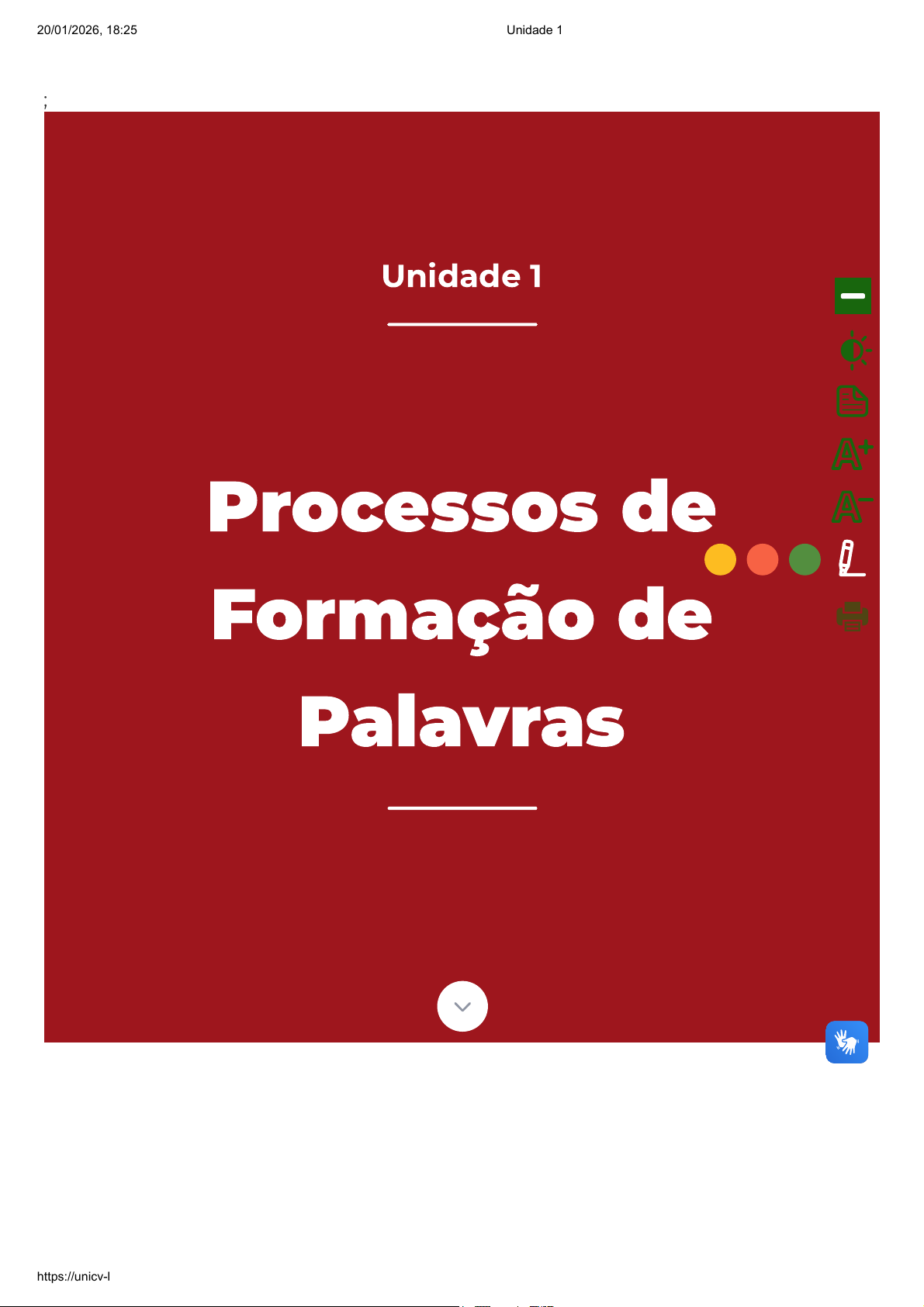; Processos de Formação de Palavras Unidade 1 20/01/2026, 18:25 Unidade 1 https://unicv-lingua-portuguesa-i.webflow.io/unidade-1 1/30 O estudo dos processos de formação de palavras ocupa um lugar central na compreensão dos fenômenos linguísticos, uma vez que possibilita a análise da estrutura interna das palavras e dos mecanismos que permitem a ampliação e o enriquecimento do léxico de uma língua. A morfologia, enquanto área da linguística que investiga a constituição e a organização das palavras, permite não apenas entender como os vocábulos se formam, mas também refletir sobre os sentidos que esses elementos carregam, suas funções e suas possibilidades de uso nas práticas comunicativas. Ao longo da história, as línguas vêm se moldando a partir de necessidades comunicativas, sociais, culturais e até tecnológicas. Nesse contexto, a criação de novas palavras surge como resposta às demandas de nomeação, expressão e representação da realidade. Assim, compreender os processos de formação de palavras é essencial para desvendar como a língua se adapta, se transforma e se mantém viva, dinâmica e em constante expansão. Nesta unidade de estudos serão abordados os principais processos que regem a formação das palavras na língua portuguesa. Iniciaremos pelos processos mais produtivos e sistemáticos, como a derivação e a composição, que consistem, respectivamente, na formação de palavras por meio da junção de afixos e da combinação de radicais. Na sequência, serão analisados processos considerados não tradicionais, mas de grande relevância no funcionamento da língua, como a redução, que se manifesta na criação de formas abreviadas; o hibridismo, que resulta da combinação de elementos de línguas distintas; e a onomatopeia, que tem como característica principal a tentativa de representar sons e ruídos por meio da linguagem verbal. Ao aprofundar-se no estudo desses processos, caro(a) estudante, você desenvolverá habilidades para reconhecer, analisar e compreender como as palavras se estruturam, como se originam e como se inserem nos diferentes contextos discursivos. Tal conhecimento contribui diretamente para a ampliação da competência linguística e discursiva, favorecendo uma atuação mais consciente, crítica e reflexiva diante das múltiplas manifestações da língua em situações formais, informais, acadêmicas e sociais. Bons estudos! Processos de Formação de Palavras 20/01/2026, 18:25 Unidade 1 https://unicv-lingua-portuguesa-i.webflow.io/unidade-1 2/30 A língua é um organismo vivo, dinâmico e em constante transformação. Sua capacidade de adaptação e de renovação se expressa, entre outros aspectos, na formação de novas palavras, fenômeno essencial para acompanhar as mudanças sociais, culturais, científicas e tecnológicas. A análise dos processos de formação de palavras permite compreender de que modo o léxico se amplia e se atualiza, atendendo às demandas comunicativas dos falantes em diferentes contextos. No âmbito da morfologia, o estudo dos processos de formação lexical revela os mecanismos que possibilitam tanto a criação de novos vocábulos quanto a modificação de palavras já existentes. Esses processos não apenas enriquecem a língua, mas também refletem sua flexibilidade, criatividade e capacidade de expressar as mais diversas realidades. Por exemplo, no contexto digital, surgem vocábulos como 'deslike', 'printar' e 'selfie', que são incorporados rapidamente ao léxico para atender às demandas comunicativas do mundo virtual. Nesta perspectiva, compreender os processos de formação de palavras é fundamental para a análise da língua portuguesa, especialmente quando se busca interpretar como os elementos linguísticos se organizam para gerar novos significados e construir sentido nas práticas comunicativas. Processos de Formação das Palavras 20/01/2026, 18:25 Unidade 1 https://unicv-lingua-portuguesa-i.webflow.io/unidade-1 3/30 Você já se perguntou como as línguas conseguem aumentar continuamente seu repertório de palavras? Esse fenômeno não ocorre de maneira aleatória, mas obedece a princípios e mecanismos estruturados, que garantem a criação e a incorporação de novos termos ao léxico. De acordo com Basílio (1998), o estudo da formação das palavras não se restringe às unidades lexicais já consolidadas, mas também engloba os processos que permitem a emergência de novos vocábulos e expressões, seja pela criação de formas inéditas, seja pela atribuição de novos sentidos a palavras existentes, seja ainda pela influência de contextos sociais, culturais e históricos. Conforme aponta Basílio (1998, p. 10), “a razão básica de formarmos palavras é a de que seria muito difícil para nossa memória — além de pouco prático — captar e guardar formas diferentes para cada necessidade que temos de usar palavras em diferentes contextos e situações”. Ou seja, a formação de palavras é uma estratégia linguística que otimiza o funcionamento da comunicação, permitindo ao falante nomear, expressar, organizar e categorizar o mundo ao seu redor. 20/01/2026, 18:25 Unidade 1 https://unicv-lingua-portuguesa-i.webflow.io/unidade-1 4/30 Além de otimizar a memória, os processos de formação de palavras também revelam aspectos culturais e sociais. Palavras surgem não apenas por necessidade comunicativa, mas também como reflexo de valores, modas, tendências e transformações tecnológicas. As transformações e criações lexicais ocorrem, portanto, como um reflexo da necessidade humana de se comunicar de maneira eficiente, precisa e adaptada às diferentes circunstâncias. Na língua portuguesa, esse processo se dá por meio de mecanismos estruturados, entre os quais se destacam a derivação e a composição, considerados os mais produtivos (HINTZE; PANTE, 2011). Além desses dos processos de derivação e composição, a língua portuguesa