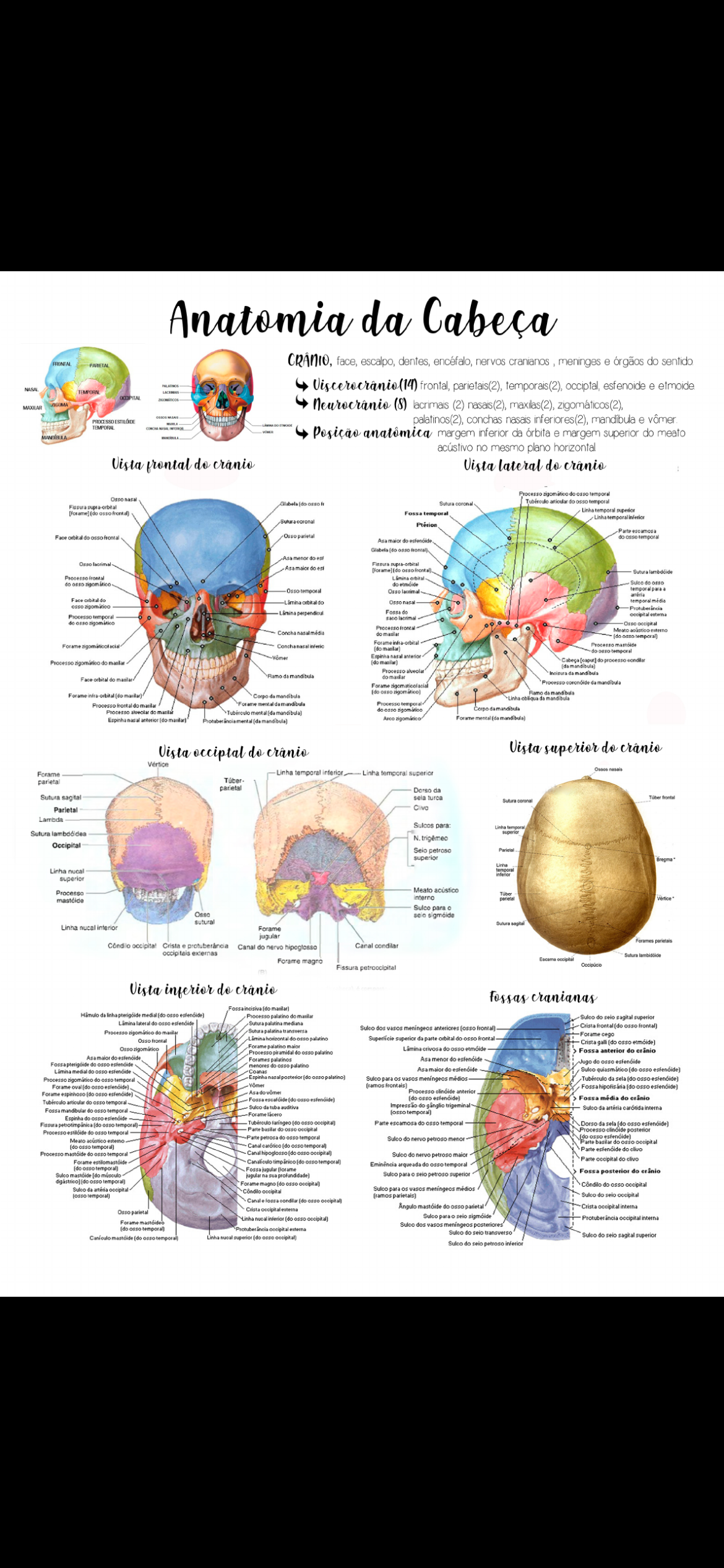 Anatomia da Cabeça FRONTAL PARIETAL CRÂNIO, face, escalpo, dentes, encéfalo, nervos cranianos meninges e órgãos do NASAL Viscerocránio(14) frontal, parietais(2), temporais(2), occiptal, esfenoide e etmoide TEMPORAL MAXILAR (8) lacrimais (2) nasais(2), maxilas(2), zigomáticos(2), palatinos(2), conchas nasais inferiores(2), e vômer TEMPORAL Posição anatômica margem inferior da órbita e margem superior do meato acústivo no mesmo plano horizontal Vista frontal do crânio Vista lateral do crânio Processo zigomatico do temporal Osso Glabela Sutura coronal articular do osso temporal Fissura supra-orbital Linha temporal superior (do Fossa temporal Linha coronal Parte escamosa Face orbital do osso Osso parietal do temporal Asa maior do Glabela frontal) Asa menor do est Osso supra-orbital Asa maior do est Sutura lambdoide Processo do do Osso temporal Osso tempor para ace orbital do orbital Osso nasal temporal perpendicul Fossa do occipital Processo temporal do occipital Processo frontal Meato Concha do maxilar (do temporal) Forame infra-orbital ame acial Concha nasal inferic Processo (do do temporal nasal anterior Processo do (do do processo (da Processo alveolar da Ramo da mandibula do maxilar Face orbital do maxilar Processo coronóide da Forame (do Ramo da orbital (do Corpo da mandibula Linha mandibula Processo do Forame mental da mandibula Processo temporal do do osso Corpo Tuberculo Espinha nasal anterior (do Protuber ment (da mandibula) Arco Forame mental (da mandibula) Vista occiptal do crânio Vista superior do crânio Ossos Forame Linha temporal Linha temporal superior parietal parietal Dorso da Sutura sagital sela turca frontal Sutura coronal Parietal Clivo Lambda Sulcos para: Linha temporal Sutura superior N. Occipital Seio petroso Parietal superior Bregma Linha Linha nucal temporal inferior superior Meato acústico Processo interno mastcide parietal Sulco para sutural Suture Linha nucal interior Forame jugular Forames parietais Condio occipital Crista e Canal do nervo hipoglosso Canal condilar occipitais externas Sutura Forame magno occipital Fissura petroccipital Vista inferior do crânio Fossas cranianas (do da linha pterigoide medial do osso Processo palatino do Sulco do seio sagital superior lateral do osso Sutura palatina mediana Sulco dos vasos meningeos anteriores (osso frontal) Crista frontal (do osso frontal) Processo do Sutura palatina transversa Forame cego do palatino superior da parte orbital do frontal Osso frontal Crista gall (do etmoide) Forame palatino maior Osso crivosa do osso Processo amidal do osso palatino Fossa anterior do maior do Forames palatinos menor do Jugo do osso do osso estencide menores do osso palatino Asa maior do Limina medial do osso estencide Coanas Sulco (do Processo do temporal Espinha posterior (do palatino) para os vasos meningeos médios da sela (do osso esfenoide) Forame oval (do osso (ramos frontais) Fossa (do osso do Processo anterior Forame espinhoso (do osso Fossa (do osso (do Fossa do Tuberculo articular do temporal da tuba auditiva Impressão do ganglio trigeminal Sulco da artéria carótida interna Fossa mandibular do osso temporal Forame (osso temporal) Espinha do osso estenoide faringeo (do osso Parte escamosa do temporal Fissura (do temporal) Dorso da sela (do esfenoide) do occipital Processo clinoide posterior Processo temporal arte petrosa do temporal Meato acústico estemo do nervo petroso menor (do osso Parte basilar do osso occipital (do temporal Canal (do tempor Parte do clivo Processo mastoide do temporal Canal hipoglosso (do osso Sulco do nervo petroso maior Parte occipital do clivo Forame (do osso arqueada do osso temporal (do osso tempor Fossa jugular Fossa posterior do Sulco mastoide jugular na sua Sulco para petroso superior osso temporal) Forame magno (do occipital) do occipital Sulco da artéria occipital occipital Sulco para os vasos meningeos médios temporal) (ramos parietais) Sulco do seio occipital Canal (do Angulo mastoide do osso parietal Crista occipital interna Osso parietal Crista occipital Linha nucal (do occipital) Sulco para seio sigmoide occipital Forame Sulco dos vasos meningeos posteriores (do osso Protuber Sulco do seio transverso Sulco do seio sagital superior (do temporal) Linha nucal superior (do occipital) do seio petroso inferior