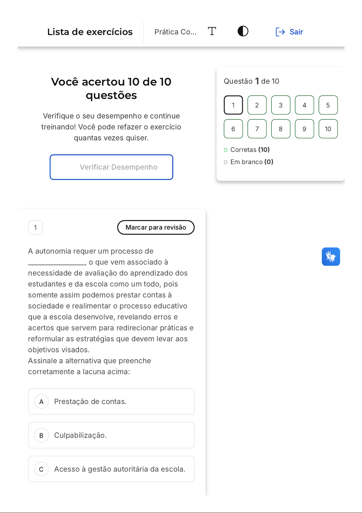 Você acertou 10 de 10 questões Verifique o seu desempenho e continue treinando! Você pode refazer o exercício quantas vezes quiser. Verificar Desempenho A B C 1 Marcar para revisão A autonomia requer um processo de _________________, o que vem associado à necessidade de avaliação do aprendizado dos estudantes e da escola como um todo, pois somente assim podemos prestar contas à sociedade e realimentar o processo educativo que a escola desenvolve, revelando erros e acertos que servem para redirecionar práticas e reformular as estratégias que devem levar aos objetivos visados. Assinale a alternativa que preenche corretamente a lacuna acima: Prestação de contas. Culpabilização. Acesso à gestão autoritária da escola. Questão 1 de 10 Corretas (10) Em branco (0) 1 2 3 4 5 6 7 8 9 10 Lista de exercícios Prática Co… Sair D E Transparência. Acesso à sala de aula. Resposta correta Parabéns, você selecionou a alternativa correta. Confira o gabarito comentado! Gabarito Comentado A resposta correta é: Transparência. 2 Marcar para revisão A avaliação institucional é um dos componentes do Sistema Nacional de Avaliação da Educação Superior (SINAES). Sua finalidade é a melhoria da qualidade da educação superior, a orientação da expansão da sua oferta, o aumento permanente da sua eficácia institucional e efetividade acadêmica e social, e, especialmente, a promoção do aprofundamento dos compromissos e responsabilidades sociais das instituições de educação superior, por meio da valorização de sua missão pública, da promoção dos valores democráticos, do respeito à diferença e à diversidade, da afirmação da autonomia e da identidade institucional, cuja preocupação é a melhoria da qualidade do ensino. Assinale a alternativa que diz o número da lei e o ano em que foi instituído o SINAES: A B C D E 9.394/1996 10.639/2003 11.645/2008 13.005/2014 10.861/2004 Resposta correta Parabéns, você selecionou a alternativa correta. Confira o gabarito comentado! Gabarito Comentado O Sistema Nacional de Avaliação da Educação Superior (SINAES) foi instituído pela Lei nº 10.861, de 17 de abril de 2004. 3 Marcar para revisão A Política Nacional de Avaliação e Exames da Educação Básica é regulamentada de acordo com o disposto na Base Nacional Comum Curricular (BNCC). A Política é integrada pelo Sistema de Avaliação da Educação Básica (SAEB), o Exame Nacional para Certificação de Competências de Jovens e Adultos (ENCCEJA) e o Exame Nacional do Ensino Médio (ENEM). A B C D E Assinale a alternativa que denomina o órgão/ empresa/ autarquia que realiza as avaliações: IBGE. IHGB. INEP. CESGRANRIO. CAPES. Resposta correta Parabéns, você selecionou a alternativa correta. Confira o gabarito comentado! Gabarito Comentado O Instituto Nacional de Estudos e Pesquisas Educacionais Anísio Teixeira (INEP) é o órgão responsável pela realização das avaliações mencionadas no enunciado. O INEP é uma autarquia federal vinculada ao Ministério da Educação que tem como missão institucional produzir e disseminar informações educacionais. As avaliações realizadas pelo INEP, como o SAEB, ENCCEJA e ENEM, são ferramentas importantes para entender o cenário educacional brasileiro e para a formulação de políticas públicas na área de educação. A B C D E 4 Marcar para revisão Quando a avaliação institucional cumpre o papel de autoavaliação institucional, podemos dizer que remonta a um modelo de que se caracteriza como uma corajosa decisão em favor da instituição. Dias Sobrinho (1998) afirma que se uma avaliação institucional "vem de cima para baixo e de fora para dentro", ela pode se tornar uma expressão de políticas ________, atendendo, em alguns casos, a interesses de organismos internacionais que concentram em torno de si os fatídicos interesses de mercado." Assinale a alternativa que preenche corretamente a lacuna: Neoliberais, Social-democráticas. Anarcocapitalistas. Comunistas. Socialistas. Resposta correta Parabéns, você selecionou a alternativa correta. Confira o gabarito comentado! Gabarito Comentado A B C D E A resposta correta é: Neoliberais, 5 Marcar para revisão O Exame Nacional de Cursos (ENC) coletou, a partir da primeira divulgação dos resultados, em 1996, algumas polêmicas. Esse exame foi destinado aos estudantes concluintes dos cursos de graduação para medir as aprendizagens destes, para, aí sim, avaliar externamente o curso. Entretanto, não levava em conta o contexto local e institucional dos cursos, e, sendo assim, esses fatores contribuem para o desempenho estudantil, apesar de não ser considerado pelo ministério. Assinale a alternativa que descreve outra característica desse exame, ou seja, como ele foi conhecido pela sociedade: Uma forma de integralizar as universidades. Uma forma de gerar cooperação entre as universidades. Uma forma de classificar as universidades. Uma forma de fechar cursos e universidades. Uma forma de discutir experiências didáticas inovadoras. Resposta correta Parabéns, você selecionou a alternativa correta. Confira o gabarito comentado! Gabarito Comentado O Exame Nacional de Cursos (ENC), também conhecido como "Provão", foi amplamente reconhecido pela sociedade como uma forma de classificar as universidades. Apesar de ter sido alvo de diversas polêmicas, principalmente por não considerar o contexto local e institucional dos cursos na avaliação, o ENC tinha como principal objetivo medir o aprendizado dos estudantes concluintes dos cursos de graduação e, com base nesses resultados, classificar as instituições de ensino superior. Portanto, a alternativa correta é a letra C: "Uma forma de classificar as universidades". 6 Marcar para revisão O Sistema Nacional de Avaliação da Educação Superior (SINAES) é formado por três procedimentos avaliativos, a saber: a Avaliação das Instituições de Educação Superior (AVALIES); a Avaliação dos Curs