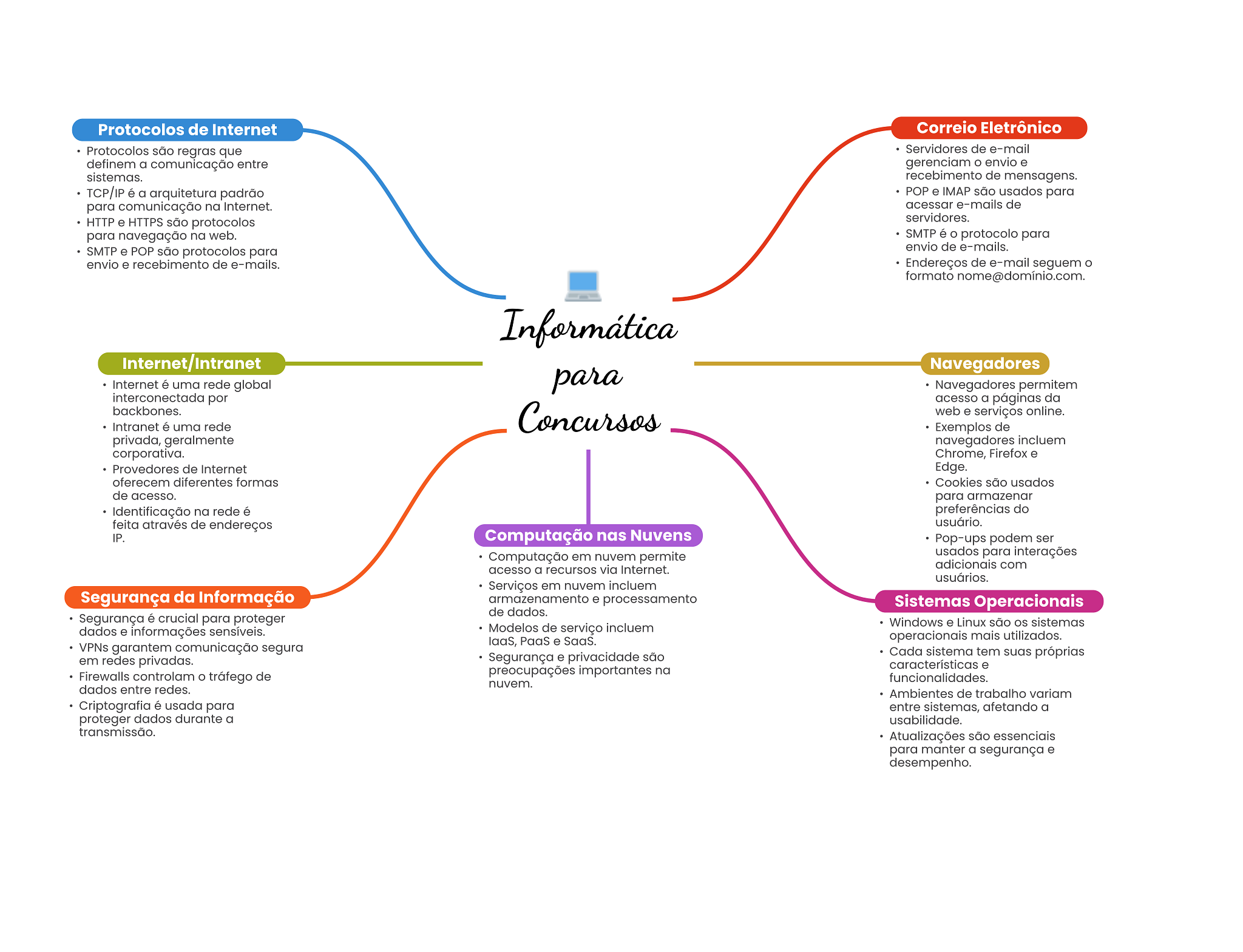 Protocolos de Internet Correio Eletrônico Protocolos são regras que Servidores de e-mail definem a comunicação entre gerenciam O envio e sistemas. recebimento de mensagens. TCP/IP é a arquitetura padrão POP e IMAP são usados para para comunicação na Internet. acessar e-mails de HTTP e HTTPS são protocolos servidores. para navegação na web. SMTP é protocolo para SMTP e POP são protocolos para envio de e-mails. envio e recebimento de e-mails. Endereços de e-mail seguem O formato nome@domínio.com. Informática Internet/Intranet Navegadores Internet é uma rede global para Navegadores permitem interconectada por acesso a páginas da backbones. Intranet é uma rede Concursos web e serviços online. Exemplos de privada, geralmente navegadores incluem corporativa. Chrome, Firefox e Provedores de Internet Edge. oferecem diferentes formas Cookies são usados de acesso. para armazenar Identificação na rede é preferências do feita através de endereços usuário. IP. Computação nas Nuvens Pop-ups podem ser Computação em nuvem permite usados para interações acesso a recursos via Internet. adicionais com usuários. Serviços em nuvem incluem Segurança da Informação armazenamento e processamento Sistemas Operacionais de dados. Segurança é crucial para proteger Windows e Linux são sistemas dados e informações sensíveis. Modelos de serviço incluem PaaS e SaaS. operacionais mais utilizados. VPNs garantem comunicação segura Segurança e privacidade são Cada sistema tem suas próprias em redes privadas. características e Firewalls controlam tráfego de preocupações importantes na funcionalidades. nuvem. dados entre redes. Ambientes de trabalho variam Criptografia é usada para entre sistemas, afetando a proteger dados durante a usabilidade. transmissão. Atualizações são essenciais para manter a segurança e desempenho.