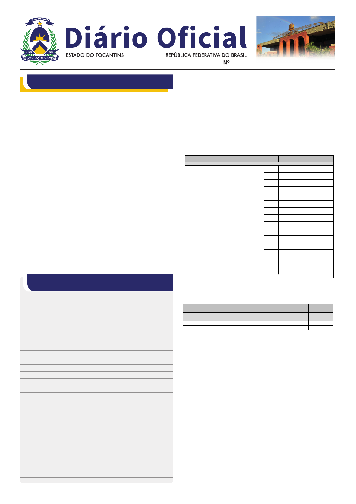 PALÁCIO ARAGUAIA GOVERNADOR JOSÉ WILSON SIQUEIRA CAMPOS PODER EXECUTIVO ANO XXXVII - ESTADO DO TOCANTINS, SEXTA-FEIRA, 21 DE FEVEREIRO DE 2025 6.763 SUMÁRIO ATOS DO CHEFE DO PODER EXECUTIVO DECRETO Nº 6.900, DE 12 DE FEVEREIRO DE 2025. Abre Crédito Especial a Secretaria da Igualdade Racial. O GOVERNADOR DO ESTADO DO TOCANTINS, no uso da atribuição que lhe confere o art. 40, inciso II, da Constituição do Estado, e em conformidade com o inciso III do art. 6o da Lei no 4.650, de 17 de janeiro de 2025, combinado com a alínea "w" do art. 2º e o inciso II do art. 3o da Lei no 4.379, D E C R E T A: Art. 1º É aberto a Secretaria da Igualdade Racial, crédito adicional especial no valor de R$ 5.000.000,00, consignado no vigente orçamento, em conformidade do Anexo I a este Decreto. Parágrafo único. Os recursos necessários à suplementação de crédito de que trata este artigo correm à conta da anulação das dotações orçamentárias indicadas no Anexo II a este Decreto. Art. 2º Este Decreto entra em vigor na data de sua publicação, produzindo efeitos a partir de 12 de fevereiro de 2025. Palácio Araguaia Governador José Wilson Siqueira Campos, em Palmas, aos 12 dias do mês de fevereiro de 2025; 203º da Independência, 137º da República e 37º do Estado. WANDERLEI BARBOSA CASTRO Governador do Estado Sergislei Silva de Moura Secretário do Planejamento e Orçamento Deocleciano Gomes Filho Secretário-Chefe da Casa Civil ANEXO I AO DECRETO Nº 6.900, DE 12 DE FEVEREIRO DE 2025 CRÉDITO ESPECIAL Suplementação UO / Programa de Trabalho Natureza Despesa I.E(*) Fonte Marcador Fonte VALOR (R$ 1,00) 5.000.000,00 319004 1 500 0000000 550.000,00 319011 1 500 0000000 921.000,00 319013 1 500 0000000 80.000,00 319094 1 500 0000000 10.000,00 319113 1 500 0000000 200.000,00 339014 1 500 0000000 50.000,00 339030 1 500 0000000 50.000,00 339033 1 500 0000000 50.000,00 339036 1 500 0000000 20.000,00 339037 1 500 0000000 30.000,00 339039 1 500 0000000 350.000,00 339046 1 500 0000000 50.000,00 339047 1 500 0000000 10.000,00 339093 1 500 0000000 300.000,00 449052 1 500 0000000 639.000,00 339030 1 500 0000000 140.000,00 339039 1 500 0000000 300.000,00 339030 1 500 0000000 50.000,00 339040 1 500 0000000 200.000,00 339014 1 500 0000000 100.000,00 339030 1 500 0000000 50.000,00 339032 1 500 0000000 80.000,00 339033 1 500 0000000 80.000,00 339036 1 500 0000000 20.000,00 339039 1 500 0000000 170.000,00 339014 1 500 0000000 100.000,00 339030 1 500 0000000 50.000,00 339032 1 500 0000000 80.000,00 339033 1 500 0000000 80.000,00 339036 1 500 0000000 20.000,00 339039 1 500 0000000 170.000,00 5.000.000,00 (*) Identificador Exercício Fonte 89010 - Secretaria da Igualdade Racial Total 1890000100412211002483 - Manutencao De Recursos Humanos 1890000100412211002484 - Coordenação e manutenção dos serviços administrativos gerais 1890000100412211002485 - Manutenção dos serviços de transporte 1890000100412211002486 - Manutenção de serviços de informática 1890000100412211002487 - Promoção de Eventos para fortalecer as políticas Públicas de Promoção da Igualdade Racial 1890000100412211002488 - Fortalecimento das Políticas da Igualdade Racial ANEXO II AO DECRETO Nº 6.900, DE 12 DE FEVEREIRO DE 2025 CRÉDITO ESPECIAL Anulação UO / Programa de Trabalho Natureza Despesa I.E(*) Fonte Marcador Fonte VALOR (R$ 1,00) 5.000.000,00 5.000.000,00 1470000109999911469003 - Reserva de contingência 999999 1 500 0000000 5.000.000,00 5.000.000,00 (*) Identificador Exercício Fonte Total 6900 47010 - Recursos sob a Supervisão da SEPLAN ATO Nº 670 - NM. O GOVERNADOR DO ESTADO DO TOCANTINS, no uso da atribuição que lhe confere o art. 40, inciso X, da Constituição do Estado, resolve N O M E A R MARIA AMÉLIA BRITO ARAÚJO para exercer o cargo de provimento em comissão de Gerente do Programa de Gestão do Sistema Único de Assistência Social - DAI-1, da Secretaria do Trabalho e Desenvolvimento Social, a partir de 24 de fevereiro de 2025. Palácio Araguaia Governador José Wilson Siqueira Campos, em Palmas, aos 21 dias do mês de fevereiro de 2025; 204o da Independência, 137o da República e 37o do Estado. WANDERLEI BARBOSA CASTRO Governador do Estado Deocleciano Gomes Filho Secretário-Chefe da Casa Civil ATOS DO CHEFE DO PODER EXECUTIVO 1 CASA CIVIL 5 POLÍCIA MILITAR 8 CONTROLADORIA-GERAL DO ESTADO 8 SECRETARIA DA ADMINISTRAÇÃO 9 SECRETARIA DA CIDADANIA E JUSTIÇA 16 SECRETARIA DA COMUNICAÇÃO 17 SECRETARIA DA CULTURA 17 SECRETARIA DA EDUCAÇÃO 26 SECRETARIA DA FAZENDA 40 SECRETARIA DO MEIO AMBIENTE E RECURSOS HÍDRICOS 42 SECRETARIA DA SAÚDE 44 SECRETARIA DA SEGURANÇA PÚBLICA 64 SECRETARIA DO TRABALHO E DESENVOLVIMENTO SOCIAL 66 SECRETARIA DO TURISMO 66 AEM 69 AGETO 69 ATR 71 DETRAN 72 FOMENTO 75 IGEPREV 75 JUCETINS 78 RURALTINS 78 TOCANTINS PARCERIAS 79 TRIBUNAL DE CONTAS 80 PUBLICAÇÕES DOS MUNICÍPIOS 80 PUBLICAÇÕES PARTICULARES 84 Digitally signed by CASA CIVIL:26752295000146 DN: c=BR, o=ICP-Brasil, st=TO, l=Palmas, ou=AC SOLUTI Multipla v5, ou=43352201000160, ou=Certificado Digital, ou=Certificado PJ A3, cn=CASA CIVIL:26752295000146 Date: 2025.02.21 19:27:39 -03'00'
