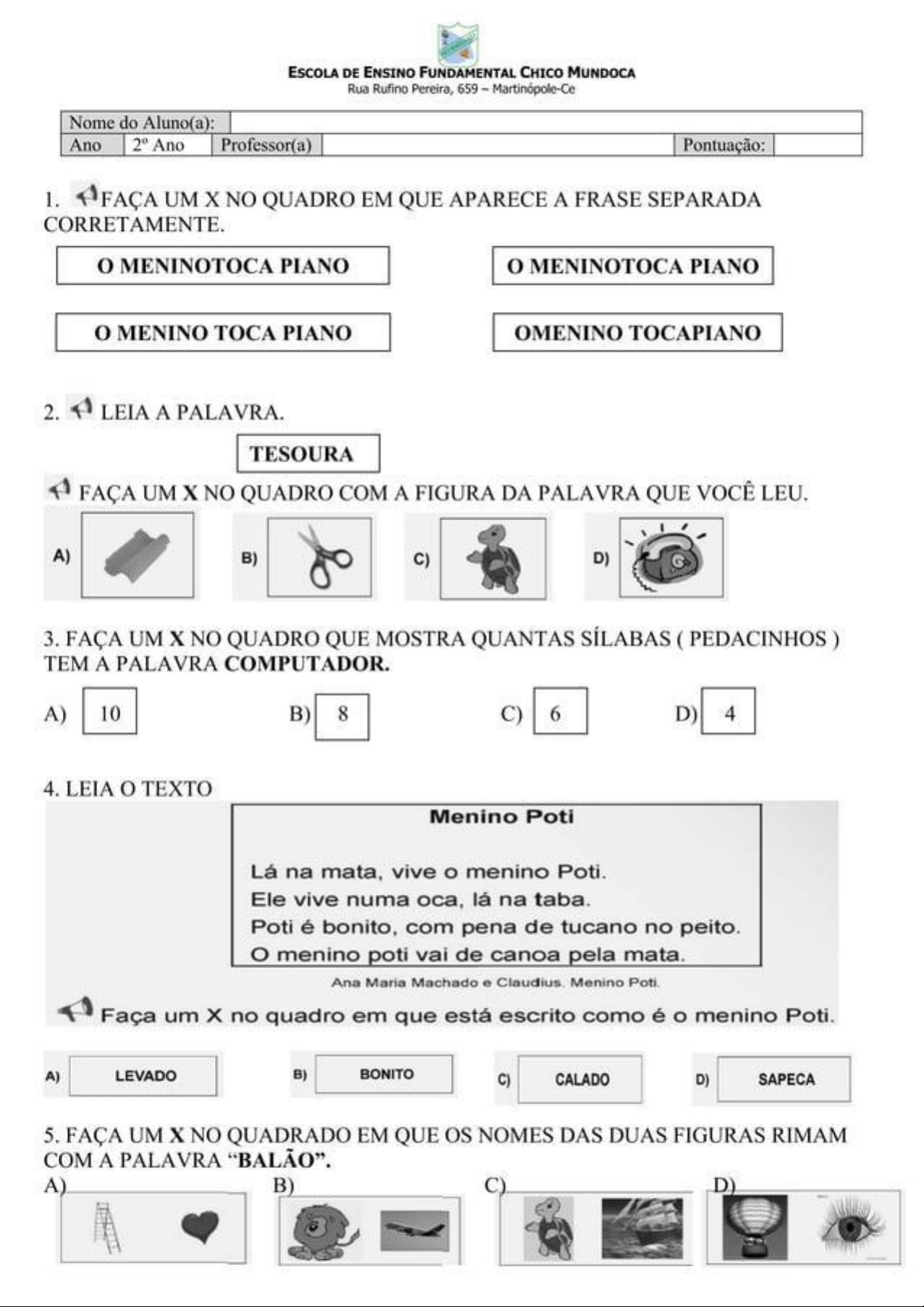ESCOLA DE ENSINO FUNDAMENTAL CHICO MUNDOCA Rua Rufino Pereira, 659 Martinópole-Ce Nome do Aluno(a): Ano Ano Professor(a) Pontuação: 1. FAÇA UM X NO QUADRO EM QUE APARECE A FRASE SEPARADA MENINOTOCA PIANO 0 MENINOTOCA PIANO MENINO TOCA PIANO OMENINO TOCAPIANO 2. LEIA A PALAVRA. TESOURA FAÇA UM NO QUADRO COM A FIGURA DA PALAVRA QUE VOCÊ LEU. A) B) C) D) 3. FAÇA UM NO QUADRO QUE MOSTRA QUANTAS SÍLABAS (PEDACINHOS ) TEM A PALAVRA COMPUTADOR. A) 10 B) 8 C) 6 D) 4 4. LEIA TEXTO Menino Poti Lá na mata, vive o menino Poti. Ele vive numa oca, lá na taba. Poti é bonito, com pena de tucano no peito. o menino poti vai de canoa pela mata. Ana Maria Machado e Menino Poti. Faça um X no quadro em que está escrito como é o menino Poti. A) LEVADO B) BONITO C) CALADO D) SAPECA 5. FAÇA UM X NO QUADRADO EM QUE os NOMES DAS DUAS FIGURAS RIMAM COM A PALAVRA "BALÃO". A) B) C) D)6. LEIA TEXTO. PARCABENS! TEXTO FOI ESCRITO PARA MUITOS ANOS APRESENTAR UMA DE VIDA. 30-05-05- CONTAR UMA PIADA ENGRAÇ ADA. WENDER CONVIDAR PARA UM ANIVERSÁRIO. DAR PARABÉNS A ALGUÉM. 7. LEIA A FRASE. A CRIANÇA BRINCA DE BICICLETA FAÇA UM X NO QUADRO QUE MOSTRA O QUE ESTÁ ESCRITO NA FRASE. 8. FAÇA UM X NO QUADRO EM QUE NOMES DAS DUAS FIGURAS COMEÇAM COM A MESMA SÍLABA (PEDACINHO). 9. FAÇA UM X NO QUADRO COM A ÚLTIMA SÍLABA (PEDACINHO ) DA PALAVRA BOLO. TO U L LO 10. VEJA A FIGURA. FAÇA UM X NO QUADRO COM NOME DO ANIMAL QUE VOCÊ ELEFANTE ELEVADOR ESTANTE EQUILIBRISTAMATEMÁTICA 1. MARQUE UM X ONDE APARECEM APENAS NÚMEROS 4C5E9 4C5E9 AC5E9 47519 2. ZACARIAS FOI AO COMÉRCIO E COMPROU 2 BISCOITO POR R$ 6,00 REAIS. QUANTO CUSTOU CADA BISCOITO. A) R$ 6,00 REAIS B) R$ 4,00 REAIS C) R$ 3,00 REAIS D) R$ 2,00 REAIS 3. MILENA CONSEGUIU GUARDAR TODAS ESSAS MOEDAS DURANTE UM DIA VALOR QUE MILENA GUARDOU NESSE DIA FOI A) R$ 3,10 B) 4,10 C) R$ 5,10 D) R$ 6,10 4. RICARDO VIU ESTE NÚMERO E TINHA QUE ESCREVÊ-LO POR EXTENSO. A MANEIRA CORRETA QUE RICARDO ESCREVEU ESTE NÚMERO FOI A) CINQUENTA E SETE B) CINQUENTA E SEIS C) CINQUENTA E CINCO D) CINQUENTA E QUATRO 5. COMPLETE A SEQUENCIA 80 90 100 6. PINTE MAIOR NÚMERO DE CADA QUADRO 45 54 34 43 56 65 98OBJETO QUE USAMOS PARA MEDIR TEMPO É: 8. A HORA INDICADA NO RELÓGIO É A) 12 HORAS B) 9 HORAS C) 8 HORAS D) 7 HORAS 765 9. PINTE DA MESMA COR AS FIGURAS IGUAIS. FIQUE ATENTO AO NÚMERO DE LADOS 10. LIGUE AS FIGURAS FAZENDO A CORRESPONDÊNCIA DOS DESENHOS DE ACORDO COM A FORMA GEOMÉTRICA DOS MESMOS. !