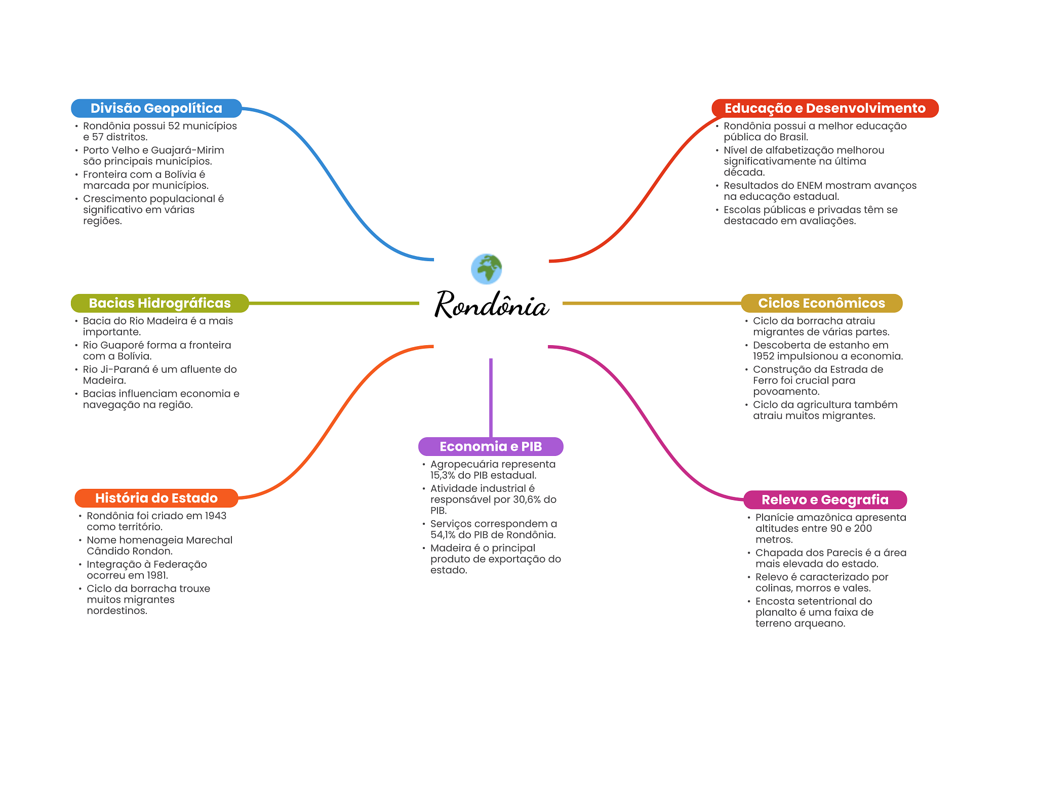 Divisão Geopolítica Educação e Desenvolvimento Rondônia possui 52 municípios Rondônia possui a melhor educação e 57 distritos. pública do Brasil. Porto Velho e Guajará-Mirim Nível de alfabetização melhorou são principais municípios. significativamente na última Fronteira com a Bolívia é década. marcada por municípios. Resultados do ENEM mostram avanços Crescimento populacional é na educação estadual. significativo em várias Escolas públicas e privadas têm se regiões. destacado em avaliações. Bacias Hidrográficas Rondônia Ciclos Econômicos Bacia do Rio Madeira é a mais Ciclo da borracha atraiu importante. migrantes de várias partes. Rio Guaporé forma a fronteira Descoberta de estanho em com a Bolívia. 1952 impulsionou a economia. Rio Ji-Paraná é um afluente do Construção da Estrada de Madeira. Ferro foi crucial para Bacias influenciam economia e povoamento. navegação na região. Ciclo da agricultura também atraiu muitos migrantes. Economia e PIB Agropecuária representa 15,3% do PIB estadual. Atividade industrial é História do Estado responsável por 30,6% do Relevo e Geografia PIB. Rondônia foi criado em 1943 Planície amazônica apresenta como território. Serviços correspondem a altitudes entre 90 e 200 54,1% do PIB de Rondônia. Nome homenageia Marechal metros. Cândido Rondon. Madeira é o principal Chapada dos Parecis é a área Integração à Federação produto de exportação do mais elevada do estado. estado. ocorreu em 1981. Relevo é caracterizado por Ciclo da borracha trouxe colinas, morros e vales. muitos migrantes Encosta setentrional do nordestinos. planalto é uma faixa de terreno arqueano.