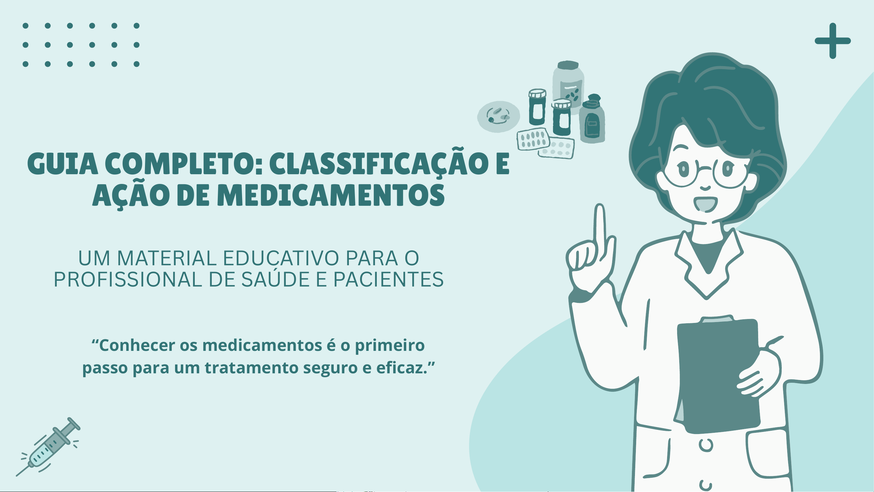GUIA COMPLETO: CLASSIFICAÇÃO E AÇÃO DE MEDICAMENTOS UM MATERIAL EDUCATIVO PARA O PROFISSIONAL DE SAÚDE E PACIENTES “Conhecer os medicamentos é o primeiro passo para um tratamento seguro e eficaz.” INTRODUÇÃO E TIPOS DE MEDICAMENTOS (COMPOSIÇÃO) Classificação quanto à Composição e Uso Medicamentos Simples Contêm apenas um princípio ativo. Exemplo: Novalgina, Amoxil, Luftal. INTRODUÇÃO E TIPOS DE MEDICAMENTOS (COMPOSIÇÃO) Classificação quanto à Composição e Uso Medicamentos Compostos Contêm dois ou mais princípios ativos. Objetivo: Aumentar eficácia ou reduzir quantidade de comprimidos. Exemplo: Neosaldina, Dorflex, Losartana H, Benegrip. INTRODUÇÃO E TIPOS DE MEDICAMENTOS (COMPOSIÇÃO) Classificação quanto à Composição e Uso Medicamentos de Uso Externo Aplicados sobre a pele ou mucosas. Atuam localmente (raramente têm efeito no corpo todo). Exemplo: Pomadas, shampoos, colírios, enxaguantes. INTRODUÇÃO E TIPOS DE MEDICAMENTOS (COMPOSIÇÃO) Classificação quanto à Composição e Uso Medicamentos de Uso Interno Administrados dentro do organismo (via oral ou outras). Possuem ação sistêmica (afetam o corpo todo) TIPOS ESPECIAIS E NOMENCLATURA Medicamentos Homeopáticos Feitos de substâncias vegetais, animais ou minerais. Altamente diluídos. Princípio: "O semelhante cura o semelhante". Apresentação: Glóbulos, gotas. TIPOS ESPECIAIS E NOMENCLATURA Medicamentos Fitoterápicos Feitos a partir de extratos de plantas medicinais. São produtos industrializados (não são chás caseiros). Possuem registro na Anvisa. TIPOS ESPECIAIS E NOMENCLATURA Identidade do Medicamento (Mercado) De Marca / Referência: Fabricados por quem realizou os estudos clínicos. Ex: Tylenol (paracetamol). TIPOS ESPECIAIS E NOMENCLATURA Identidade do Medicamento (Mercado) Genéricos: Mesmo princípio ativo, dose e eficácia do de referência. Não têm marca (têm o nome do princípio ativo). Ex: Paracetamol genérico. TIPOS ESPECIAIS E NOMENCLATURA Identidade do Medicamento (Mercado) Similares: Têm marca própria, mas são equivalentes ao de referência. Precisam de testes de bioequivalência. TIPOS ESPECIAIS E NOMENCLATURA Identidade do Medicamento (Mercado) Populares / OTC: Não precisam de receita médica. ORIGEM DOS MEDICAMENTOS SINTÉTICOS NATURAIS BIOTECNOLÓGICOS Produzidos em laboratório por reações químicas. Extraídos de plantas, animais ou minerais. Produzidos por organismos vivos modificados geneticamente. Ação dos medicamentos Ação Local O medicamento age no local onde foi aplicado, sem entrar significativamente na corrente sanguínea. Ex: Pomadas, colírios, sprays nasais. Ação Sistêmica O medicamento entra na corrente sanguínea e afeta o corpo todo. Vias: Oral, Intravenosa, Intramuscular, Sublingual. Ação Remota Administrado em um local, mas age em outro ponto distante. Ex: Adesivos transdérmicos. Efeitos Farmacológicos (Sistema) Estimulante: Aumenta a atividade de órgãos. Ex: Cafeína (SNC), Adrenalina (Coração). Depressora: Reduz ou inibe a atividade. Ex: Diazepam (SNC), Morfina (em altas doses). Cumulativa: Acumula-se no corpo por uso contínuo. Ex: Digitoxina. Anti-infecciosa: Combate micro- organismos. Antibióticos (Bactérias), Antivirais (Vírus), Antifúngicos ( Fungos). Antagônica: Bloqueia o efeito de outra substância. Ex: Naloxona (bloqueia opioides). PONTOS-CHAVE 1. A origem importa: Sejam sintéticos, naturais ou biotecnológicos, todos os medicamentos passam por rigorosos processos de controle de qualidade antes de chegarem ao paciente. 2. A forma de uso define o efeito: Um medicamento de uso externo age localmente, enquanto os de uso interno podem afetar todo o organismo. A escolha da via de administração é uma decisão clínica crucial. 3. Genéricos e similares são opções seguras: Eles passam por testes de bioequivalência e têm a mesma eficácia dos medicamentos de referência, sendo alternativas mais acessíveis economicamente. OBRIGADA PELA ATENÇÃO!! "O medicamento certo, na dose certa, na hora certa e na forma certa, é uma das ferramentas mais poderosas da medicina moderna."