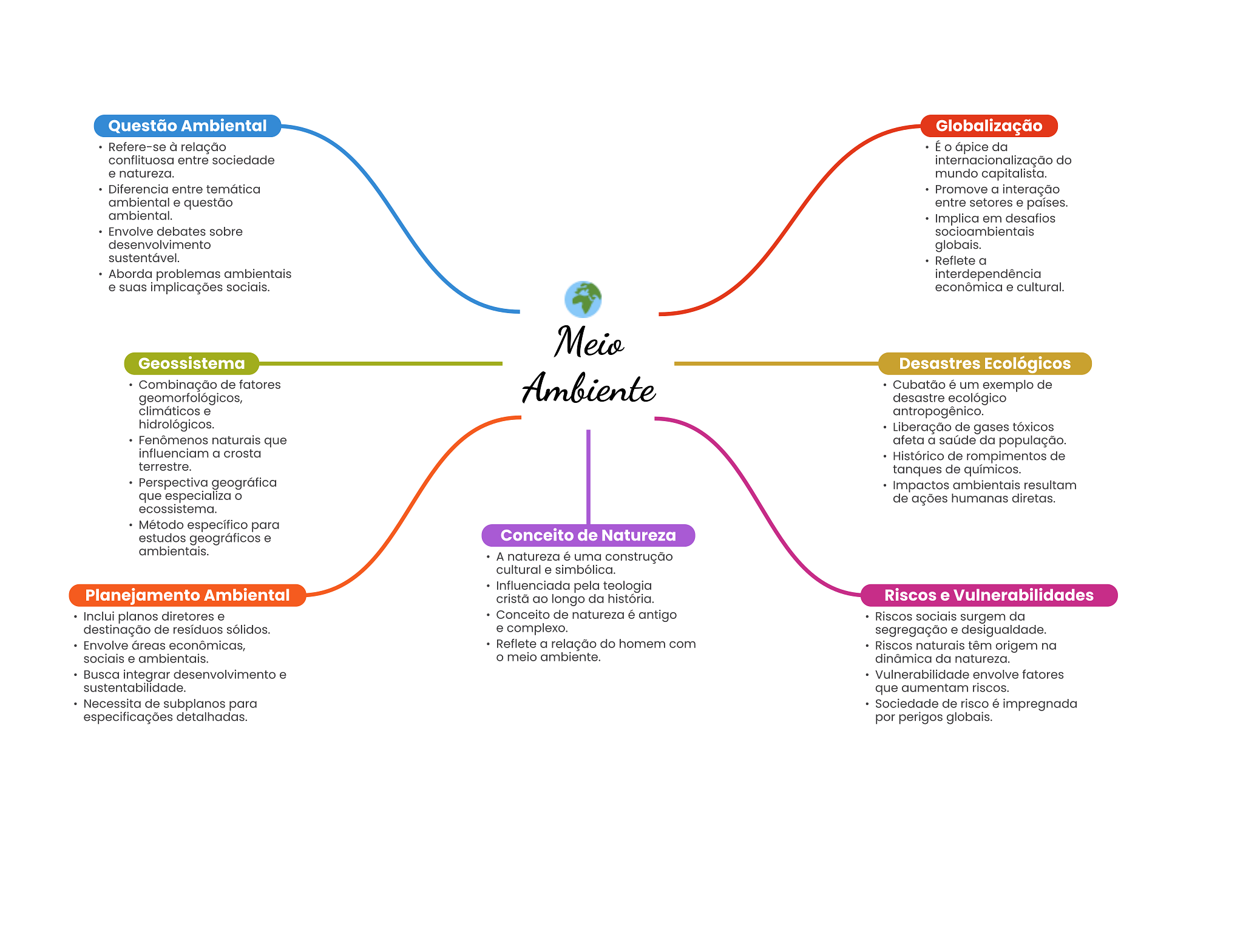 Questão Ambiental Globalização Refere-se à relação É o ápice da conflituosa entre sociedade internacionalização do e natureza. mundo capitalista. Diferencia entre temática Promove a interação ambiental e questão entre setores e países. ambiental. Implica em desafios Envolve debates sobre socioambientais desenvolvimento globais. sustentável. Reflete a Aborda problemas ambientais interdependência e suas implicações sociais. econômica e cultural. Meio Geossistema Desastres Ecológicos Combinação de fatores Ambiente Cubatão é um exemplo de geomorfológicos, desastre ecológico climáticos e antropogênico. hidrológicos. Liberação de gases tóxicos Fenômenos naturais que afeta a saúde da população. influenciam a crosta Histórico de rompimentos de terrestre. tanques de químicos. Perspectiva geográfica Impactos ambientais resultam que especializa de ações humanas diretas. ecossistema. Método específico para estudos geográficos e Conceito de Natureza ambientais. A natureza é uma construção cultural e simbólica. Influenciada pela teologia Planejamento Ambiental cristã ao longo da história. Riscos e Vulnerabilidades Inclui planos diretores e Conceito de natureza é antigo Riscos sociais surgem da destinação de resíduos sólidos. e complexo. segregação e desigualdade. Envolve áreas econômicas, Reflete a relação do homem com Riscos naturais têm origem na sociais e ambientais. meio ambiente. dinâmica da natureza. Busca integrar desenvolvimento e Vulnerabilidade envolve fatores sustentabilidade. que aumentam riscos. Necessita de subplanos para Sociedade de risco é impregnada especificações detalhadas. por perigos globais.