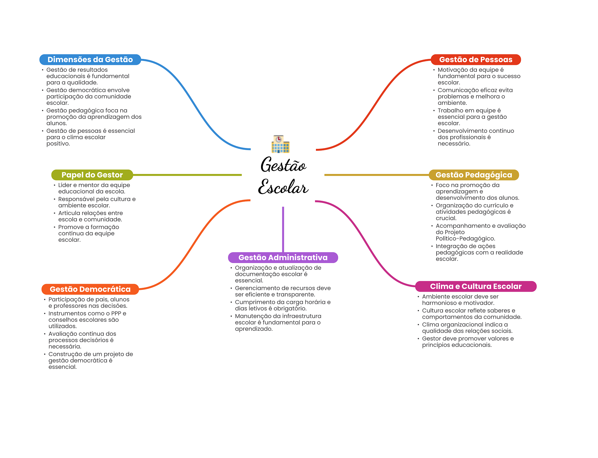 Dimensões da Gestão Gestão de Pessoas Gestão de resultados Motivação da equipe é educacionais é fundamental fundamental para sucesso para a qualidade. escolar. Gestão democrática envolve Comunicação eficaz evita participação da comunidade problemas e melhora escolar. ambiente. Gestão pedagógica foca na Trabalho em equipe é promoção da aprendizagem dos essencial para a gestão alunos. escolar. Gestão de pessoas é essencial Desenvolvimento contínuo para clima escolar dos profissionais é positivo. necessário. Gestão Papel do Gestor Gestão Pedagógica Líder e mentor da equipe educacional da escola. Escolar Foco na promoção da aprendizagem e Responsável pela cultura e desenvolvimento dos alunos. ambiente escolar. Organização do currículo e Articula relações entre atividades pedagógicas é escola e comunidade. crucial. Promove a formação Acompanhamento e avaliação contínua da equipe do Projeto escolar. Político-Pedagógico. Integração de ações pedagógicas com a realidade Gestão Administrativa escolar. Organização e atualização de documentação escolar é essencial. Gestão Democrática Gerenciamento de recursos deve Clima e Cultura Escolar ser eficiente e transparente. Ambiente escolar deve ser Participação de pais, alunos Cumprimento da carga horária e harmonioso e motivador. e professores nas decisões. dias letivos é obrigatório. Cultura escolar reflete saberes e Instrumentos como PPP e conselhos escolares são Manutenção da infraestrutura comportamentos da comunidade. utilizados. escolar é fundamental para O Clima organizacional indica a aprendizado. Avaliação contínua dos qualidade das relações sociais. processos decisórios é Gestor deve promover valores e necessária. princípios educacionais. Construção de um projeto de gestão democrática é essencial.