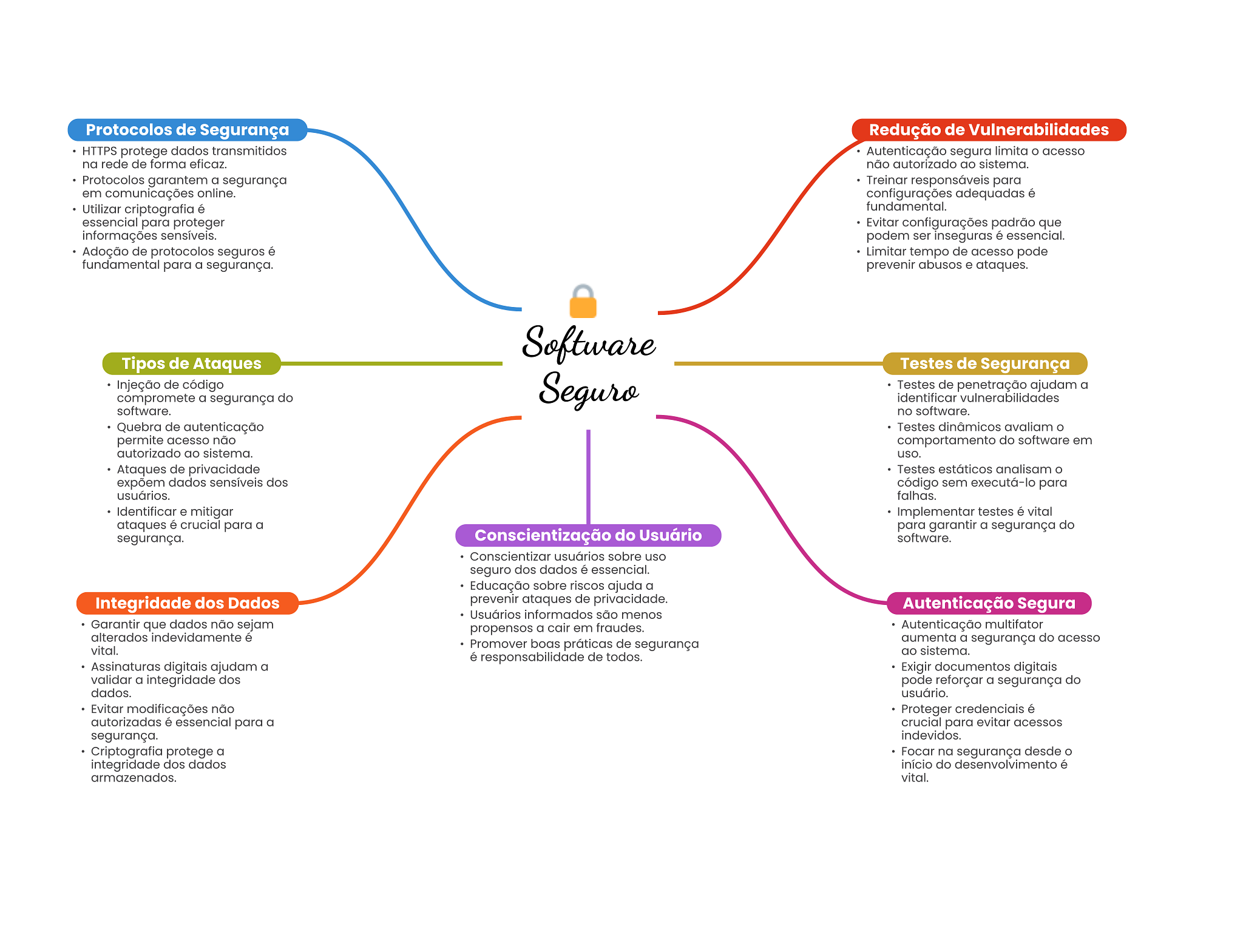 Protocolos de Segurança Redução de Vulnerabilidades HTTPS protege dados transmitidos Autenticação segura limita acesso na rede de forma eficaz. não autorizado ao sistema. Protocolos garantem a segurança Treinar responsáveis para em comunicações online. configurações adequadas é Utilizar criptografia é fundamental. essencial para proteger Evitar configurações padrão que informações sensíveis. podem ser inseguras é essencial. Adoção de protocolos seguros é Limitar tempo de acesso pode fundamental para a segurança. prevenir abusos e ataques. Software Tipos de Ataques Testes de Segurança Injeção de código compromete a segurança do Seguro Testes de penetração ajudam a identificar vulnerabilidades software. no software. Quebra de autenticação Testes dinâmicos avaliam permite acesso não comportamento do software em autorizado ao sistema. uso. Ataques de privacidade Testes estáticos analisam expõem dados sensíveis dos código sem executá-lo para usuários. falhas. Identificar e mitigar Implementar testes é vital ataques é crucial para a para garantir a segurança do segurança. Conscientização do Usuário software. Conscientizar usuários sobre uso seguro dos dados é essencial. Educação sobre riscos ajuda a Integridade dos Dados prevenir ataques de privacidade. Autenticação Segura Usuários informados são menos Garantir que dados não sejam propensos a cair em fraudes. Autenticação multifator alterados indevidamente é Promover boas práticas de segurança aumenta a segurança do acesso vital. ao sistema. é responsabilidade de todos. Assinaturas digitais ajudam a Exigir documentos digitais validar a integridade dos pode reforçar a segurança do dados. usuário. Evitar modificações não Proteger credenciais é autorizadas é essencial para a crucial para evitar acessos segurança. indevidos. Criptografia protege a Focar na segurança desde integridade dos dados início do desenvolvimento é armazenados. vital.