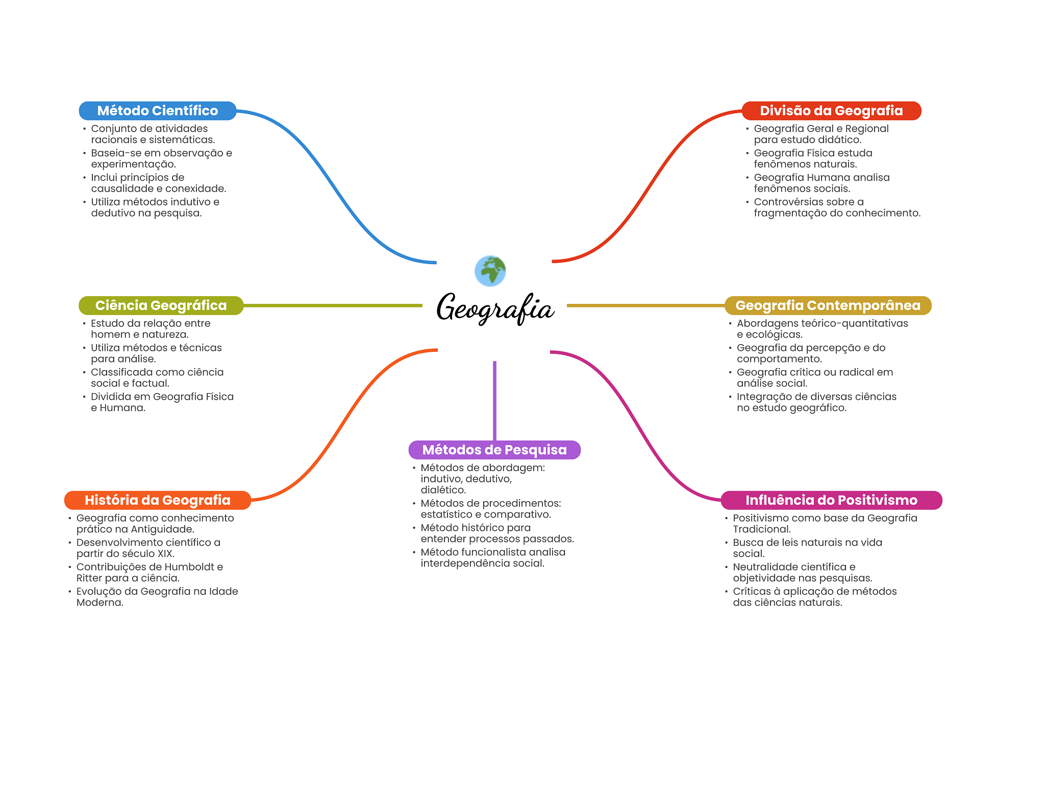 Método Científico Divisão da Geografia Conjunto de atividades Geografia Geral e Regional racionais e sistemáticas. para estudo didático. Baseia-se em observação e Geografia Física estuda experimentação. fenômenos naturais. Inclui princípios de Geografia Humana analisa causalidade e conexidade. fenômenos sociais. Utiliza métodos indutivo e Controvérsias sobre a dedutivo na pesquisa. fragmentação do conhecimento. Ciência Geográfica Geografia Geografia Contemporânea Estudo da relação entre Abordagens homem e natureza. e ecológicas. Utiliza métodos e técnicas Geografia da percepção e do para análise. comportamento. Classificada como ciência Geografia crítica ou radical em social e factual. análise social. Dividida em Geografia Física Integração de diversas ciências e Humana. no estudo geográfico. Métodos de Pesquisa Métodos de abordagem: indutivo, dedutivo, dialético. História da Geografia Métodos de procedimentos: Influência do Positivismo Geografia como conhecimento estatístico e comparativo. Positivismo como base da Geografia prático na Antiguidade. Método histórico para Tradicional. Desenvolvimento científico a entender processos passados. Busca de leis naturais na vida partir do século XIX. Método funcionalista analisa social. Contribuições de Humboldt e interdependência social. Neutralidade científica e Ritter para a ciência. objetividade nas pesquisas. Evolução da Geografia na Idade Críticas à aplicação de métodos Moderna. das ciências naturais.