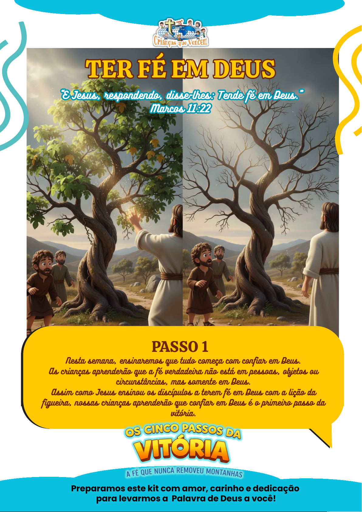 “E Jesus, respondendo, disse-lhes: Tende fé em Deus.” Marcos 11:22 “E Jesus, respondendo, disse-lhes: Tende fé em Deus.” Marcos 11:22 TER FÉ EM DEUSTER FÉ EM DEUS PASSO 1 Nesta semana, ensinaremos que tudo começa com confiar em Deus. As crianças aprenderão que a fé verdadeira não está em pessoas, objetos ou circunstâncias, mas somente em Deus. Assim como Jesus ensinou os discípulos a terem fé em Deus com a lição da figueira, nossas crianças aprenderão que confiar em Deus é o primeiro passo da vitória. Preparamos este kit com amor, carinho e dedicação para levarmos a Palavra de Deus a você! TER FÉ EM DEUSTER FÉ EM DEUS “E Jesus, respondendo, disse-lhes: Tende fé em Deus.” Marcos 11:22COLORIR NOME : ______________________________________________ IDADE: ________ Pinte com muito capricho: TER FÉ EM DEUSTER FÉ EM DEUS “E Jesus, respondendo, disse-lhes: Tende fé em Deus.” Marcos 11:22ATIVIDADE NOME: ______________________________________________ IDADE: ________ O que a figueira não produziu? Procure na imagem e pinte. TER FÉ EM DEUSTER FÉ EM DEUS “E Jesus, respondendo, disse-lhes: Tende fé em Deus.” Marcos 11:22ATIVIDADE NOME: ______________________________________________ IDADE: ________ Jogo dos 7 erros: FALAR AO MONTEFALAR AO MONTE “Porque em verdade vos digo que qualquer que disser a este monte: Ergue- te e lança-te no mar…” Marcos 11.23a “Porque em verdade vos digo que qualquer que disser a este monte: Ergue- te e lança-te no mar…” Marcos 11.23a Preparamos este kit com amor, carinho e dedicação para levarmos a Palavra de Deus a você! PASSO 2 Nesta semana, as crianças aprenderão que Jesus nos ensinou a falar ao problema, confiando que Deus cumpre Sua Palavra. Elas entenderão que nossas palavras devem estar alinhadas com o que Deus diz e devem ser usadas para orar, agradecer e confiar, não para reclamar ou falar coisas ruins. Assim como Deus falou e tudo foi criado, as crianças aprenderão que falar de acordo com a Palavra é um passo de fé. FALAR AO MONTEFALAR AO MONTE “Porque em verdade vos digo que qualquer que disser a este monte: Ergue-te e lança-te no mar…” Marcos 11.23a COLORIR NOME: ______________________________________________ IDADE: ________ Pinte com muito capricho onde a minha boca é fonte de vida: FALAR AO MONTEFALAR AO MONTE “Porque em verdade vos digo que qualquer que disser a este monte: Ergue-te e lança-te no mar…” Marcos 11.23a COLORIR NOME: ______________________________________________ IDADE: ________ Pinte com muito capricho onde a minha boca é fonte de vida: FALAR AO MONTEFALAR AO MONTE “Porque em verdade vos digo que qualquer que disser a este monte: Ergue-te e lança-te no mar…” Marcos 11.23a ATIVIDADE NOME: ______________________________________________ IDADE: ________ Declare a Palavra de Deus! Pinte os desenhos e complete as palavras e frases. Respostas: AMIZADE - ORAÇÃO - DISCIPLINA - RAIVA - SAUDADE - BRIGAR COM AMIGO FALAR AO MONTEFALAR AO MONTE “Porque em verdade vos digo que qualquer que disser a este monte: Ergue-te e lança-te no mar…” Marcos 11.23a ATIVIDADE NOME: ______________________________________________ IDADE: ________ Caça Palavras O que alegra o coração de Deus? Encontre apenas as palavras boas e ignore as palavras negativas: AMAR OBEDECER CUIDAR AJUDAR PERDOAR SER GENTIL NÃO DUVIDAR NO CORAÇÃO NÃO DUVIDAR NO CORAÇÃO “…e não duvidar em seu coração…” Marcos 11.23b “…e não duvidar em seu coração…” Marcos 11.23b PASSO 3 Nesta semana, veremos que o medo pode aparecer, mas não precisa dominar e nem mandar no nosso coração. As crianças aprenderão que confiar em Jesus é escolher a fé, mesmo quando o medo vier. Assim como Pedro andou sobre as águas enquanto confiou em Jesus, elas aprenderão que quando confiamos, Jesus nos sustenta. Elas aprenderão que podem falar com Jesus quando sentirem medo. Preparamos este kit com amor, carinho e dedicação para levarmos a Palavra de Deus a você! “…e não duvidar em seu coração…” Marcos 11.23b NÃO DUVIDAR NO CORAÇÃO NÃO DUVIDAR NO CORAÇÃO COLORIR NOME: ______________________________________________ IDADE: ________ Pinte com muito capricho: “…e não duvidar em seu coração…” Marcos 11.23b NÃO DUVIDAR NO CORAÇÃO NÃO DUVIDAR NO CORAÇÃO ATIVIDADE NOME: ______________________________________________ IDADE: ________ “…e não duvidar em seu coração…” Marcos 11.23b NÃO DUVIDAR NO CORAÇÃO NÃO DUVIDAR NO CORAÇÃO ATIVIDADE NOME: ______________________________________________ IDADE: ________ NÃO DUVIDE NO CORAÇÃO. CONFIE EM JESUS! MATEUS 14.31 COMEÇOU DEVAGAR, JOGUE O DADO NOVAMENTE DO QUE VOCÊ TEM MEDO? QUAL BRINCADEIRA TE FAZ SENTIR MAIS FELIZ? VOCÊ SENTE VONTADE DE CHORAR POR QUAL MOTIVO? QUAL PALAVRA VOCÊ MAIS GOSTA DE OUVIR? OBA! AVANCE 2 CASAS O QUE TE FAZ SENTIR VERGONHA? AMO QUANDO.... O QUE TE DEIXA TRISTE? O QUE TE DEIXA MUITO FELIZ? DIGA ALGO QUE TE DEIXA COM RAIVA QUEM É A PESSOA QUE TE FAZ SENTIR MEDO? IMITE UMA CARINHA FELIZ O QUE VOCÊ FALARIA PARA UM AMIGO QUE ESTÁ COM RAIVA? VOLTE 2 CASAS FAÇA UMA CARETA ENGRAÇADA QUAL ANIMAL VOCÊ TEM MEDO? VOCÊ CONSEGUIU!!! VOCÊ DRIBLOU SUAS EMOÇÕES E CHEGOU ATÉ O FIM! JOGO DAS EMOÇÕESINICIO “…e não duvidar em seu coração…” Marcos 11.23b NÃO DUVIDAR NO CORAÇÃO NÃO DUVIDAR NO CORAÇÃO ATIVIDADE Monte o dado para brincar com o Jogo das emoções: NOME: ______________________________________________ IDADE: ________ EU CREIO E ESPERO, DEUS RESPONDE EU CREIO E ESPERO, DEUS RESPONDE “…mas crer que se fará aquilo que diz, tudo o que disser lhe será feito.” Marcos 11.23c “…mas crer que se fará aquilo que diz, tudo o que disser lhe será feito.” Marcos 11.23c PASSO 4 e 5 Nesta semana, ensinaremos que depois de confiar, falar e não duvidar, esperamos em Deus. As crianças aprenderão que Deus responde no tempo certo e do jeito certo, porque Ele 