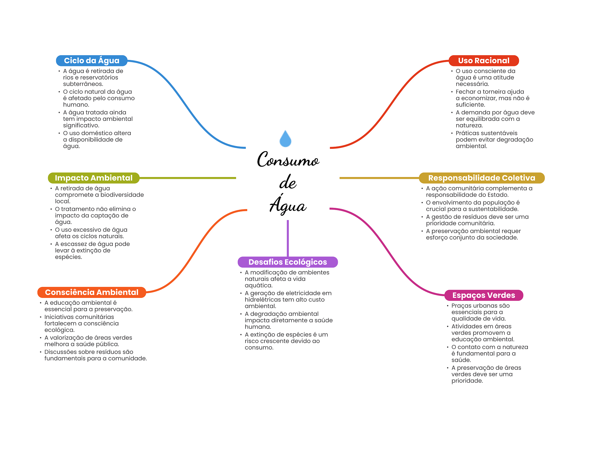 Ciclo da Água Uso Racional A água é retirada de uso consciente da rios e reservatórios água é uma atitude subterrâneos. necessária. ciclo natural da água Fechar a torneira ajuda é afetado pelo consumo a economizar, mas não é humano. suficiente. A água tratada ainda A demanda por água deve tem impacto ambiental ser equilibrada com a significativo. natureza. uso doméstico altera Práticas sustentáveis a disponibilidade de podem evitar degradação água. ambiental. Consumo Impacto Ambiental de Responsabilidade Coletiva A retirada de água A ação comunitária complementa a compromete a biodiversidade responsabilidade do Estado. local. tratamento não elimina Água envolvimento da população é crucial para a sustentabilidade. impacto da captação de A gestão de resíduos deve ser uma água. prioridade comunitária. uso excessivo de água A preservação ambiental requer afeta ciclos naturais. esforço conjunto da sociedade. A escassez de água pode levar à extinção de espécies. Desafios Ecológicos A modificação de ambientes naturais afeta a vida aquática. Consciência Ambiental A geração de eletricidade em hidrelétricas tem alto custo Espaços Verdes A educação ambiental é ambiental. essencial para a preservação. Praças urbanas são Iniciativas comunitárias A degradação ambiental essenciais para a impacta diretamente a saúde qualidade de vida. fortalecem a consciência humana. Atividades em áreas ecológica. A extinção de espécies é um verdes promovem a A valorização de áreas verdes risco crescente devido ao educação ambiental. melhora a saúde pública. consumo. contato com a natureza Discussões sobre resíduos são é fundamental para a fundamentais para a comunidade. saúde. A preservação de áreas verdes deve ser uma prioridade.