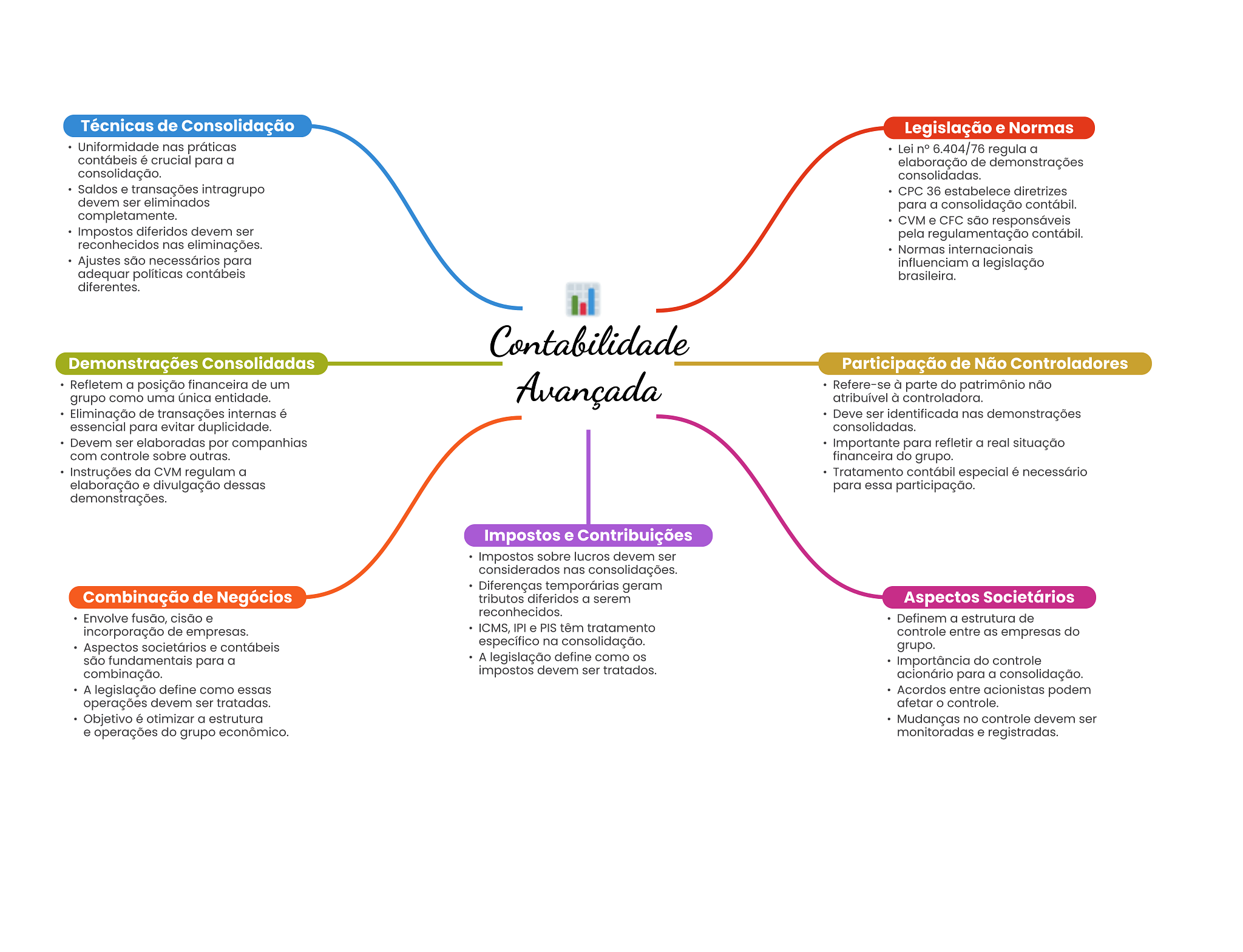 Técnicas de Consolidação Legislação e Normas Uniformidade nas práticas Lei n° 6.404/76 regula a contábeis é crucial para a elaboração de demonstrações consolidação. consolidadas. Saldos e transações intragrupo CPC 36 estabelece diretrizes devem ser eliminados para a consolidação contábil. completamente. CVM e CFC são responsáveis Impostos diferidos devem ser pela regulamentação contábil. reconhecidos nas eliminações. Normas internacionais Ajustes são necessários para influenciam a legislação adequar políticas contábeis brasileira. diferentes. Contabilidade Demonstrações Consolidadas Participação de Não Controladores Refletem a posição financeira de um grupo como uma única entidade. Avançada Refere-se à parte do patrimônio não atribuível à controladora. Eliminação de transações internas é Deve ser identificada nas demonstrações essencial para evitar duplicidade. consolidadas. Devem ser elaboradas por companhias Importante para refletir a real situação com controle sobre outras. financeira do grupo. Instruções da CVM regulam a Tratamento contábil especial é necessário elaboração e divulgação dessas para essa participação. demonstrações. Impostos e Contribuições Impostos sobre lucros devem ser considerados nas consolidações. Diferenças temporárias geram Combinação de Negócios tributos diferidos a serem Aspectos Societários reconhecidos. Envolve fusão, cisão e Definem a estrutura de incorporação de empresas. ICMS, IPI e PIS têm tratamento controle entre as empresas do Aspectos societários e contábeis específico na consolidação. grupo. são fundamentais para a A legislação define como Importância do controle combinação. impostos devem ser tratados. acionário para a consolidação. A legislação define como essas Acordos entre acionistas podem operações devem ser tratadas. afetar controle. Objetivo é otimizar a estrutura Mudanças no controle devem ser e operações do grupo econômico. monitoradas e registradas.