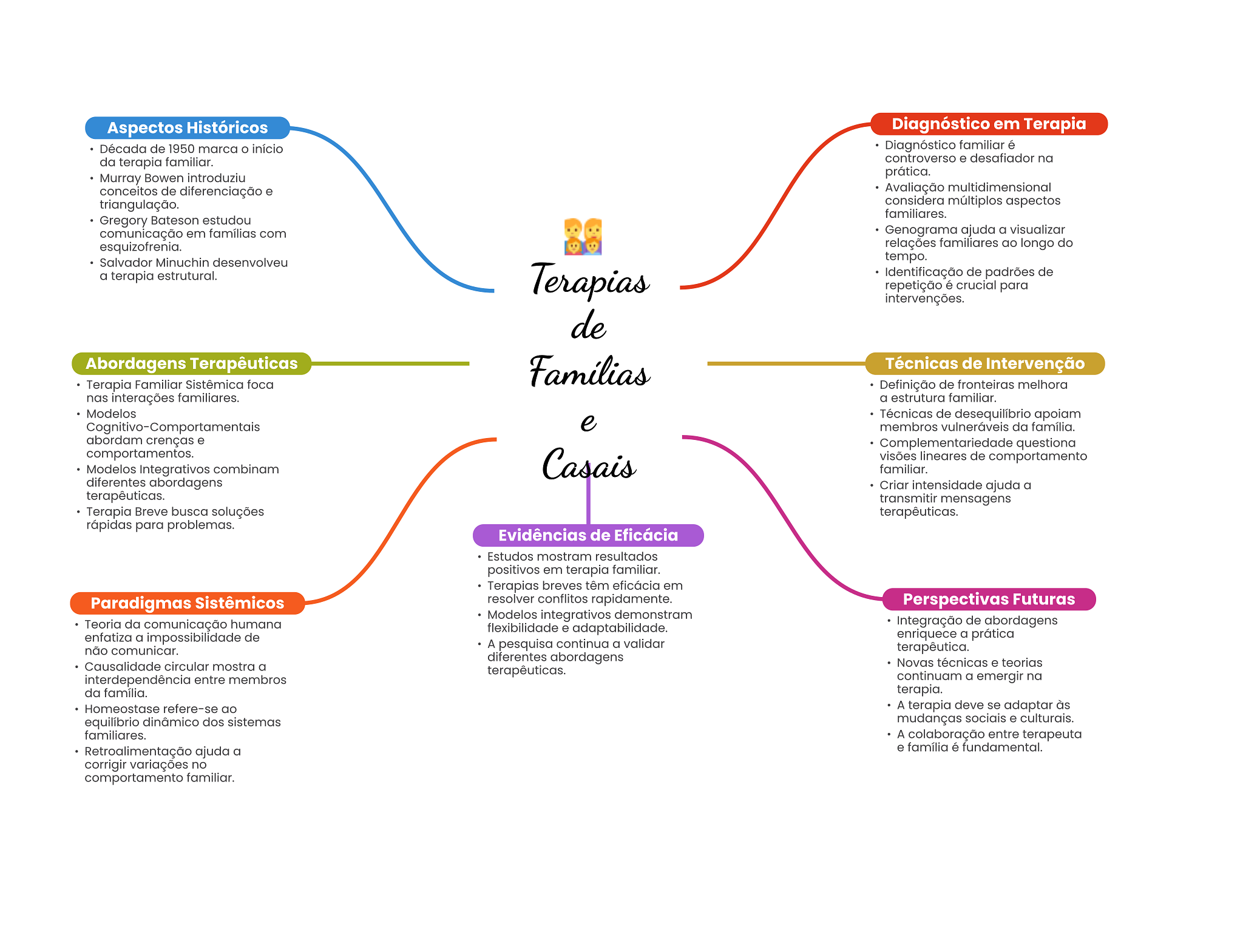 Aspectos Históricos Diagnóstico em Terapia Década de 1950 marca início Diagnóstico familiar é da terapia familiar. controverso e desafiador na Murray Bowen introduziu prática. conceitos de diferenciação e Avaliação multidimensional triangulação. considera múltiplos aspectos familiares. Gregory Bateson estudou comunicação em famílias com Genograma ajuda a visualizar esquizofrenia. relações familiares ao longo do Salvador Minuchin desenvolveu tempo. a terapia estrutural. Terapias Identificação de padrões de repetição é crucial para intervenções. de Abordagens Terapêuticas Técnicas de Intervenção Terapia Familiar Sistêmica foca Definição de fronteiras melhora nas interações familiares. a estrutura familiar. Modelos Técnicas de apoiam Cognitivo-Comportamentais e membros vulneráveis da família. abordam crenças e Complementariedade questiona comportamentos. Casais visões lineares de comportamento Modelos Integrativos combinam familiar. diferentes abordagens Criar intensidade ajuda a terapêuticas. transmitir mensagens Terapia Breve busca soluções terapêuticas. rápidas para problemas. Evidências de Eficácia Estudos mostram resultados positivos em terapia familiar. Terapias breves têm eficácia em Paradigmas Sistêmicos resolver conflitos rapidamente. Perspectivas Futuras Modelos integrativos demonstram Teoria da comunicação humana Integração de abordagens flexibilidade e adaptabilidade. enfatiza a impossibilidade de enriquece a prática não comunicar. A pesquisa continua a validar terapêutica. diferentes abordagens Causalidade circular mostra a Novas técnicas e teorias terapêuticas. interdependência entre membros continuam a emergir na da família. terapia. Homeostase refere-se ao A terapia deve se adaptar às equilíbrio dinâmico dos sistemas mudanças sociais e culturais. familiares. A colaboração entre terapeuta Retroalimentação ajuda a e família é fundamental. corrigir variações no comportamento familiar.