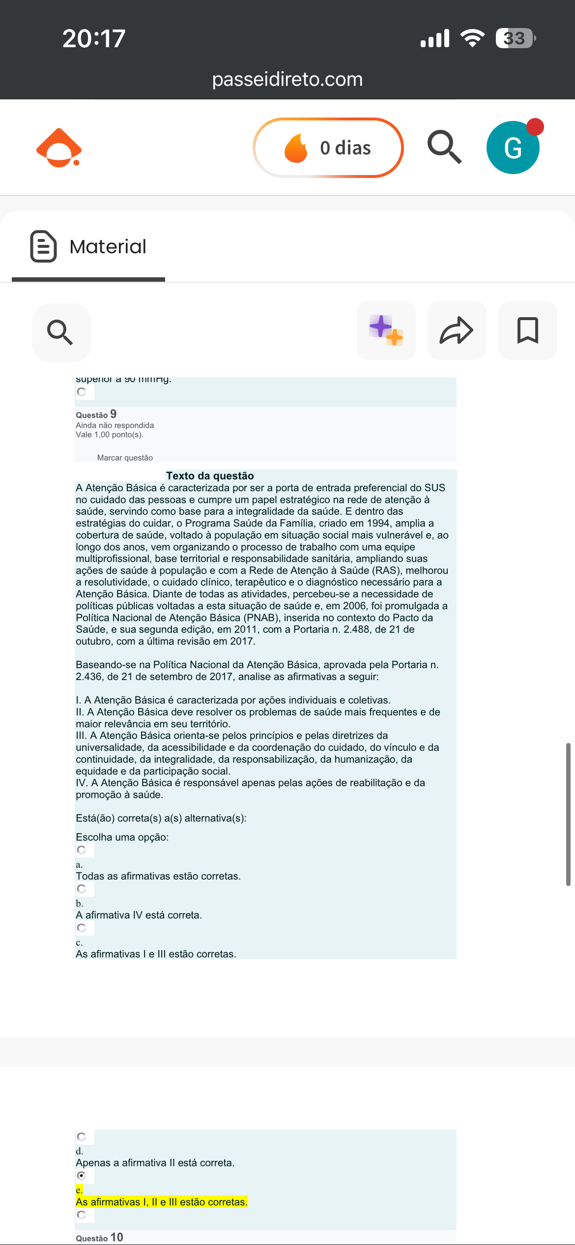 20:17 33 passeidireto.com 0 dias G Material superior a Questão 9 Ainda não respondida Vale 1,00 ponto(s). Marcar questão Texto da questão A Atenção Básica é caracterizada por ser a porta de entrada preferencial do SUS no cuidado das pessoas e cumpre um papel estratégico na rede de atenção à saúde, servindo como base para a integralidade da saúde. E dentro das estratégias do cuidar, Programa Saúde da Família, criado em 1994, amplia a cobertura de saúde, voltado à população em situação social mais vulnerável e, ao longo dos anos, vem organizando processo de trabalho com uma equipe multiprofissional, base territorial e responsabilidade sanitária, ampliando suas ações de saúde à população e com a Rede de Atenção à Saúde (RAS), melhorou a resolutividade, cuidado clínico, terapêutico e diagnóstico necessário para a Atenção Básica. Diante de todas as atividades, percebeu-se a necessidade de políticas públicas voltadas a esta situação de saúde e, em 2006, foi promulgada a Política Nacional de Atenção Básica (PNAB), inserida no contexto do Pacto da Saúde, e sua segunda edição, em 2011, com a Portaria n. 2.488, de 21 de outubro, com a última revisão em 2017. Baseando-se na Política Nacional da Atenção Básica, aprovada pela Portaria n. 2.436, de 21 de setembro de 2017, analise as afirmativas a seguir: I. A Atenção Básica é caracterizada por ações individuais e coletivas. II. A Atenção Básica deve resolver os problemas de saúde mais frequentes e de maior relevância em seu território. III. A Atenção Básica orienta-se pelos princípios e pelas diretrizes da universalidade, da acessibilidade e da coordenação do cuidado, do vínculo e da continuidade, da integralidade, da responsabilização, da humanização, da equidade e da participação social. IV. A Atenção Básica é responsável apenas pelas ações de reabilitação e da promoção à saúde. Está(ão) correta(s) a(s) alternativa(s): Escolha uma opção: a. Todas as afirmativas estão corretas. b. A afirmativa IV está correta. As afirmativas e III estão corretas. d. Apenas a afirmativa está correta. e. As afirmativas I, e III estão corretas. Questão 10