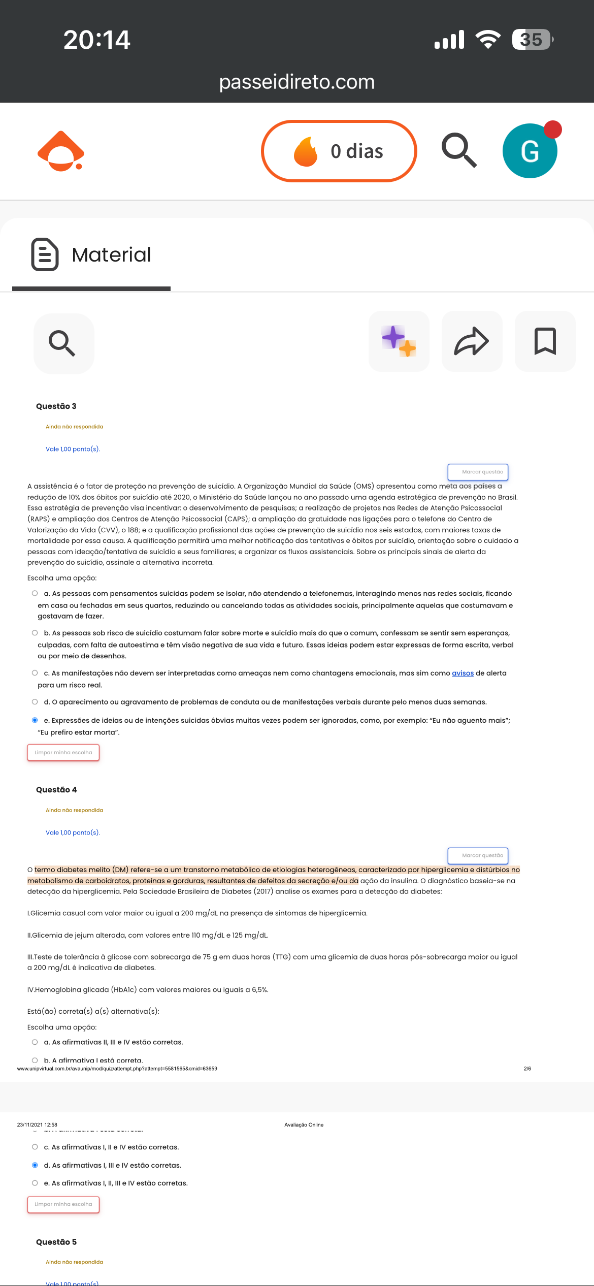 20:14 35 passeidireto.com 0 dias G Material Questão 3 Ainda não respondida Vale 1,00 Marcar questão A assistência é O fator de proteção na prevenção de suicídio. A Organização Mundial da Saúde (OMS) apresentou como meta aos países a redução de 10% dos óbitos por suicídio até 2020, O Ministério da Saúde lançou no ano passado uma agenda estratégica de prevenção no Brasil. Essa estratégia de prevenção visa incentivar: O desenvolvimento de pesquisas; a realização de projetos nas Redes de Atenção Psicossocial (RAPS) e ampliação dos Centros de Atenção Psicossocial (CAPS); a ampliação da gratuidade nas ligações para telefone do Centro de Valorização da Vida (cvv), 188; e a qualificação profissional das ações de prevenção de suicídio nos seis estados, com maiores taxas de mortalidade por essa A qualificação permitirá uma melhor notificação das tentativas e óbitos por suicídio, orientação sobre cuidado a pessoas com ideação/tentativa de suicídio e seus familiares; e organizar fluxos assistenciais. Sobre principais singis de alerta da prevenção do suicídio, assinale a alternativa incorreta. Escolha uma opção: a. As pessoas com pensamentos suicidas podem se isolar, não atendendo a telefonemas, interagindo menos nas redes sociais, ficando em casa ou fechadas em seus quartos, reduzindo ou cancelando todas as atividades sociais, principalmente aquelas que costumavam e gostavam de fazer. b. As pessoas sob risco de suicídio costumam falar sobre morte e suicídio mais do que comum, confessam se sentir sem esperanças, culpadas, com falta de autoestima e têm visão negativa de sua vida e futuro. Essas ideias podem estar expressas de forma escrita, verbal ou por meio de desenhos. As manifestações não devem ser interpretadas como ameaças nem como chantagens emocionais, mas sim como avisos de alerta para um risco real. aparecimento ou agravamento de problemas de conduta ou de manifestações verbais durante pelo menos duas semanas. e. Expressões de ideias ou de intenções suicidas óbvias muitas vezes podem ser ignoradas, como, por exemplo: "Eu não aguento mais"; "Eu prefiro estar morta". Limpar minha escolha Questão 4 Ainda não respondida Vale 1,00 ponto(s). Marcar questão termo diabetes melito (DM) refere-se a um transtorno metabólico de etiologias heterogêneas, caracterizado por hiperglicemia e distúrbios no metabolismo de carboidratos, proteínas e gorduras, resultantes de defeitos da secreção e/ou da ação da O diagnóstico baseia-se na detecção da hiperglicemia. Pela Sociedade Brasileira de Diabetes (2017) analise exames para a detecção da diabetes: casual com valor maior ou igual a 200 mg/dL na presença de sintomas de Glicemia de jejum alterada, com valores entre 110 mg/dL e 125 mg/dL. III Teste de tolerância à glicose com sobrecarga de 75 g em duas horas (TTG) com uma glicemia de duas horas pós-sobrecarga maior ou igual a 200 mg/dL é indicativa de diabetes. IV .Hemoglobina glicada (HbAlc) com valores maiores ou iguais a 6,5%. Está(ão) correta(s) a(s) alternativa(s): Escolha uma opção: a. As afirmativas II, III e IV estão corretas. b. A afirmativa está com br/avaunip/mod/quiz/attempt 1565&cmid=63659 2/6 23/11/2021 12:58 Avaliação Online As afirmativas e IV estão corretas. d. As afirmativas III e IV estão corretas. e. As afirmativas III e IV estão corretas. Limpar minha escolha Questão 5 Ainda não respondida
