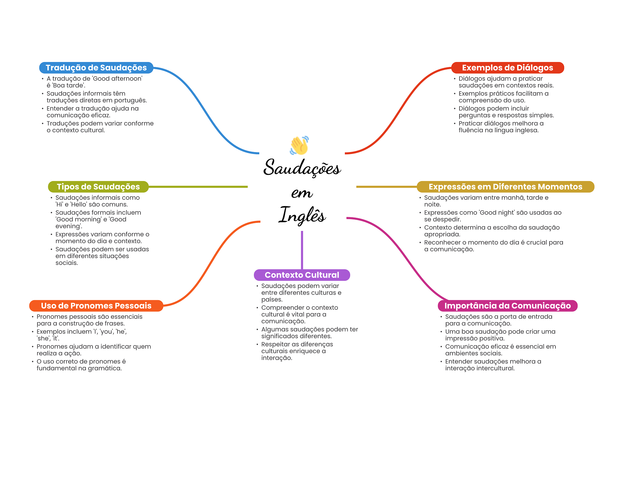Tradução de Saudações Exemplos de Diálogos A tradução de 'Good Diálogos ajudam a praticar é 'Boa saudações em contextos reais. Saudações informais têm Exemplos práticos facilitam a traduções diretas em português. compreensão do uso. Entender a tradução ajuda na Diálogos podem incluir comunicação eficaz. perguntas e respostas simples. Traduções podem variar conforme Praticar diálogos melhora a contexto cultural. fluência na língua inglesa. Saudações Tipos de Saudações Expressões em Diferentes Momentos em Saudações informais como Saudações variam entre manhã, tarde e 'Hi' e 'Hello' são comuns. noite. Saudações formais incluem Inglês Expressões como 'Good night' são usadas ao 'Good morning' e 'Good se despedir. evening'. Contexto determina a escolha da saudação Expressões variam conforme apropriada. momento do dia e contexto. Reconhecer O momento do dia é crucial para Saudações podem ser usadas a comunicação. em diferentes situações sociais. Contexto Cultural Saudações podem variar entre diferentes culturas e países. Uso de Pronomes Pessoais Compreender contexto Importância da Comunicação Pronomes pessoais são essenciais cultural é vital para a Saudações são a porta de entrada para a construção de frases. comunicação. para a comunicação. Exemplos incluem 'he', Algumas saudações podem ter Uma boa saudação pode criar uma 'she', 'it'. significados diferentes. impressão positiva. Pronomes ajudam a identificar quem Respeitar as diferenças Comunicação eficaz é essencial em realiza a ação. culturais enriquece a ambientes sociais. uso correto de pronomes é interação. Entender saudações melhora a fundamental na gramática. interação intercultural.